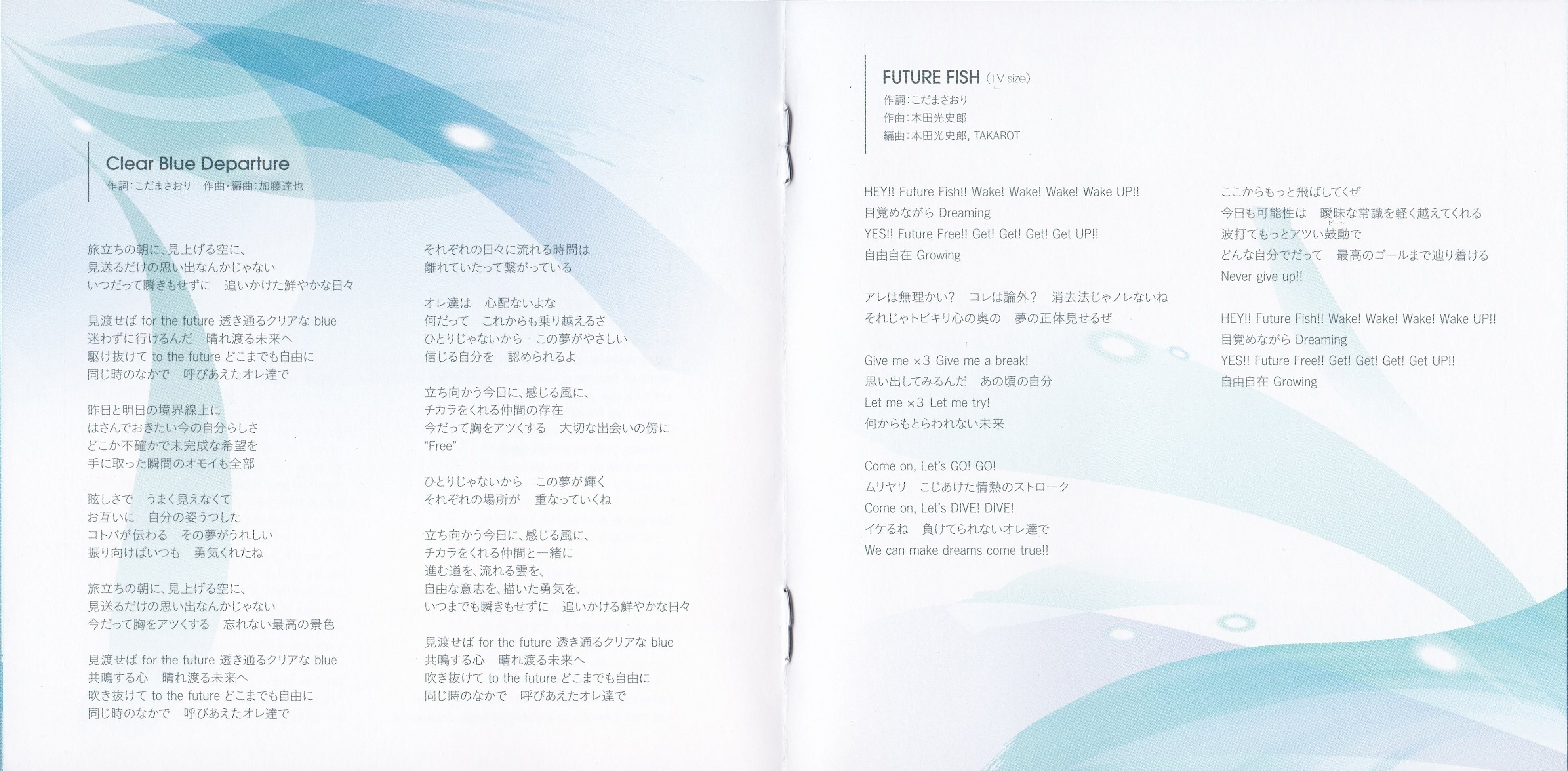 Song: Haruka Nanase (CV: Nobunaga Shimazaki), Makoto Tachibana (CV: Tatsuhisa Suzuki), Nagisa Hazuki (CV: Tsubasa Yonaga), Rei Ryugazaki (CV: Daisuke Hirakawa), Rin Matsuoka (CV: Mamoru Miyano), Sousuke Yamazaki (CV: Yoshimasa Hosoya), Aiichiro Nitori (CV: Kouki Miyata), Momotaro Mikoshiba (CV: Kenichi Suzumura)