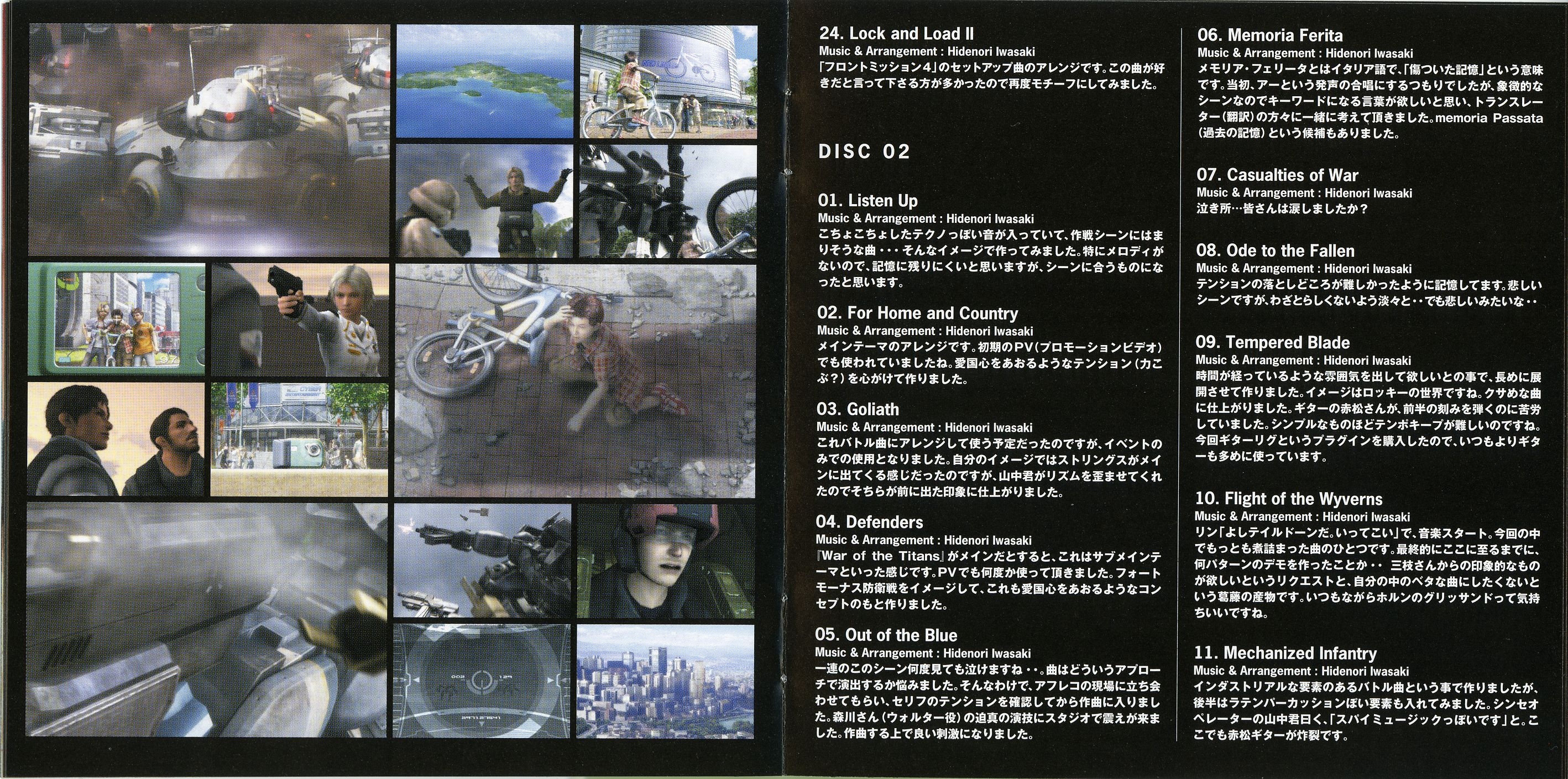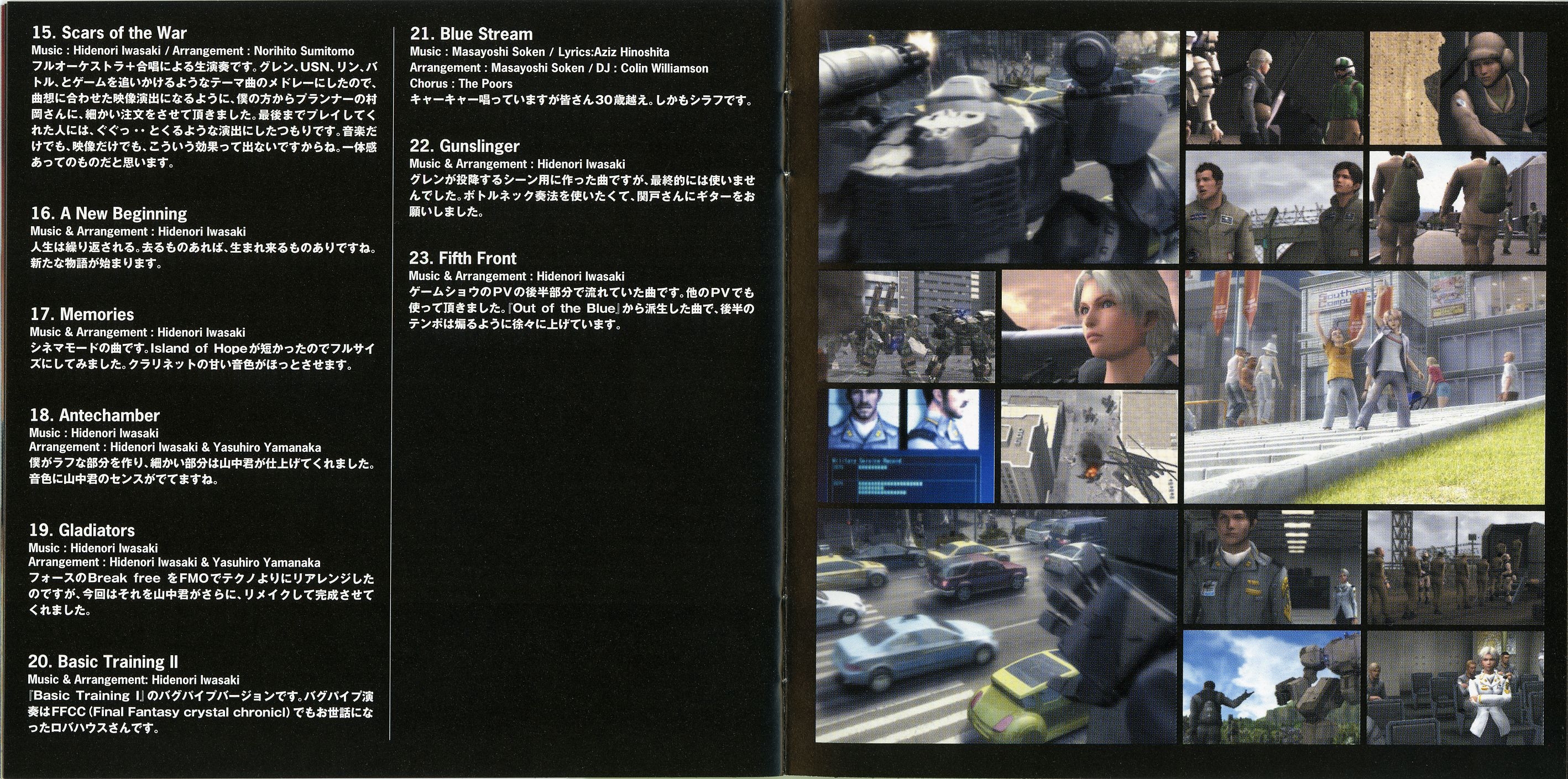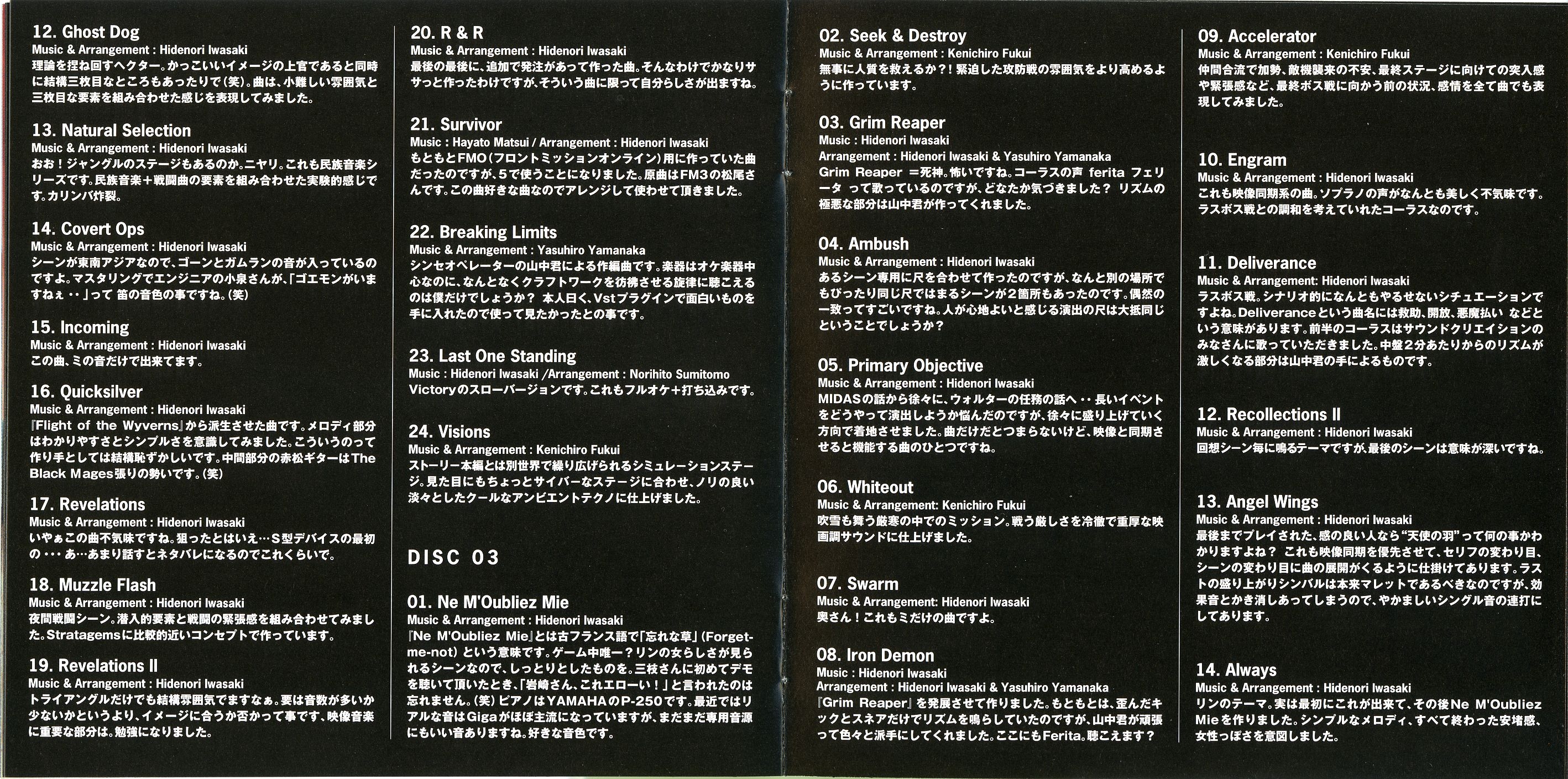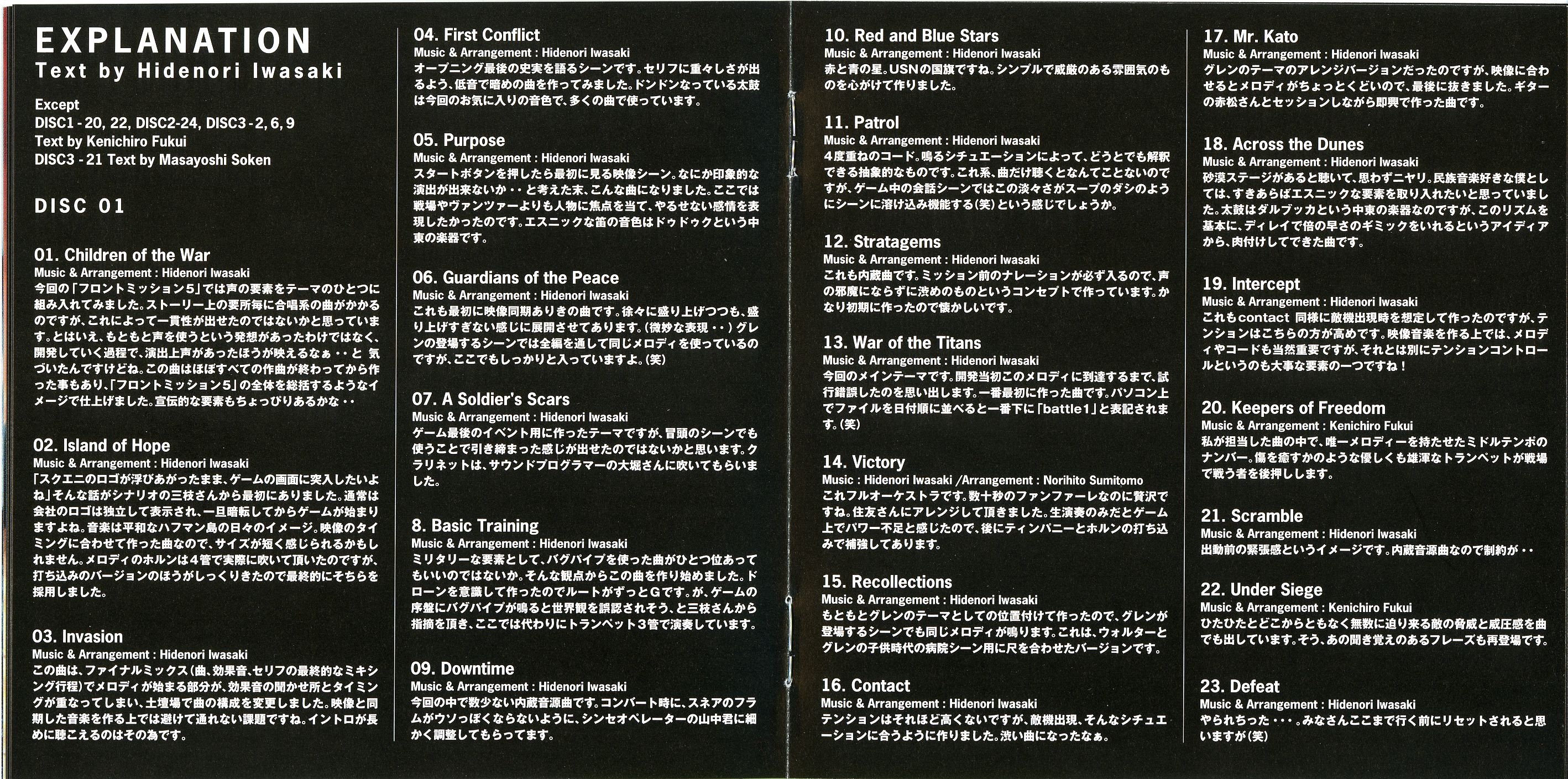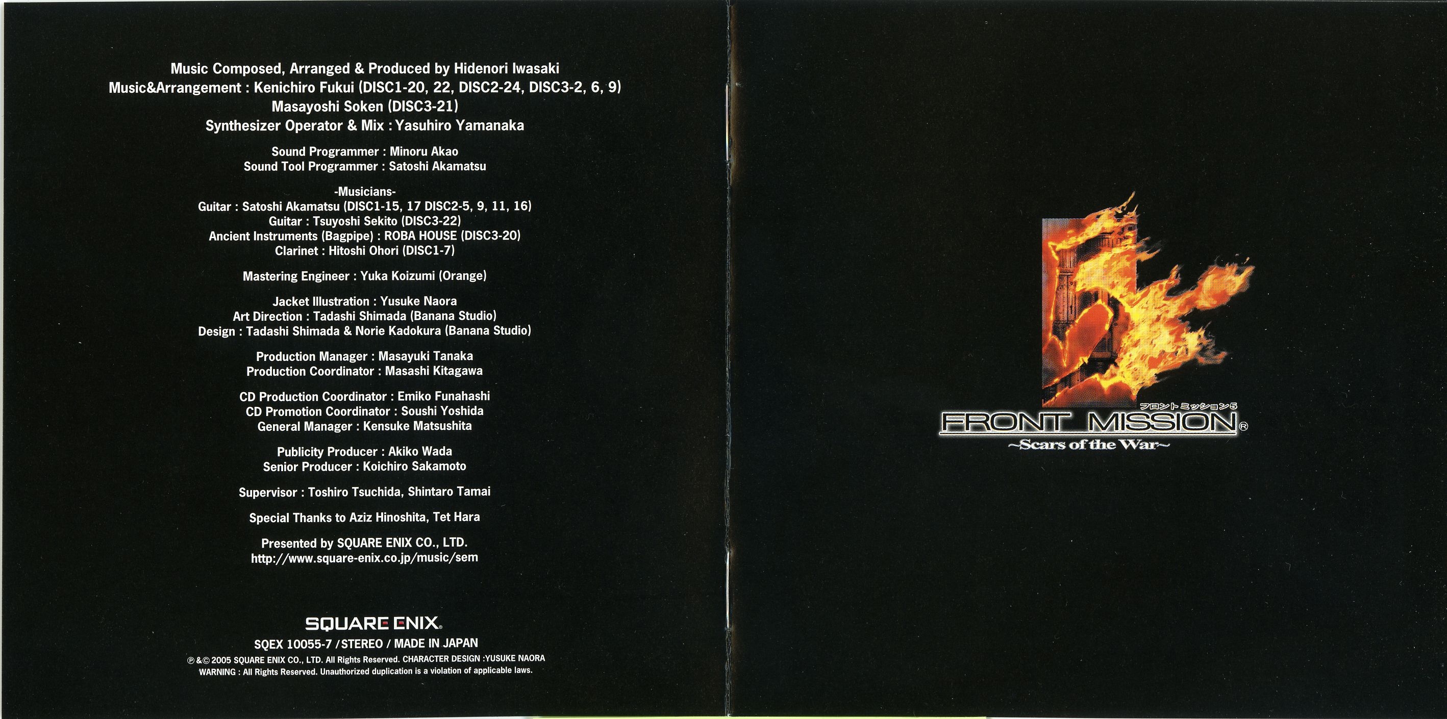Liner Notes: Hidenori Iwasaki (pg. 5-6, 11, 12, 14~17), Shintaro Tamai (Front Mission 5 Director) (pg. 7), Hiroyuki Saegusa (Front Mission 5 Scenario Writer) (pg. 8), Kenichiro Fukui (pg. 12, 15, 16), Masayoshi Soken (pg. 17)