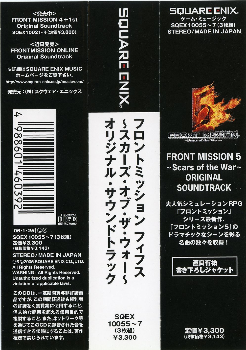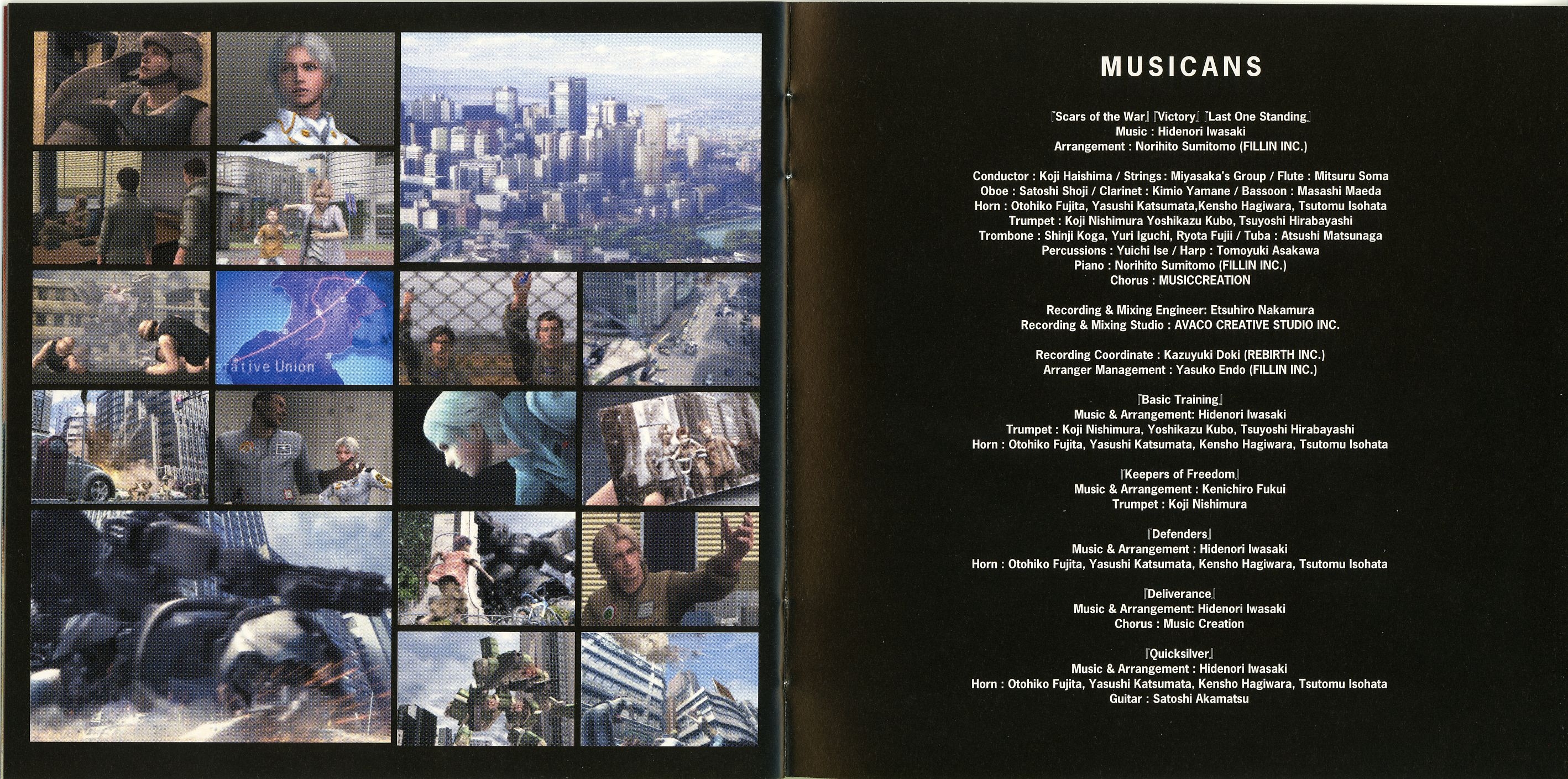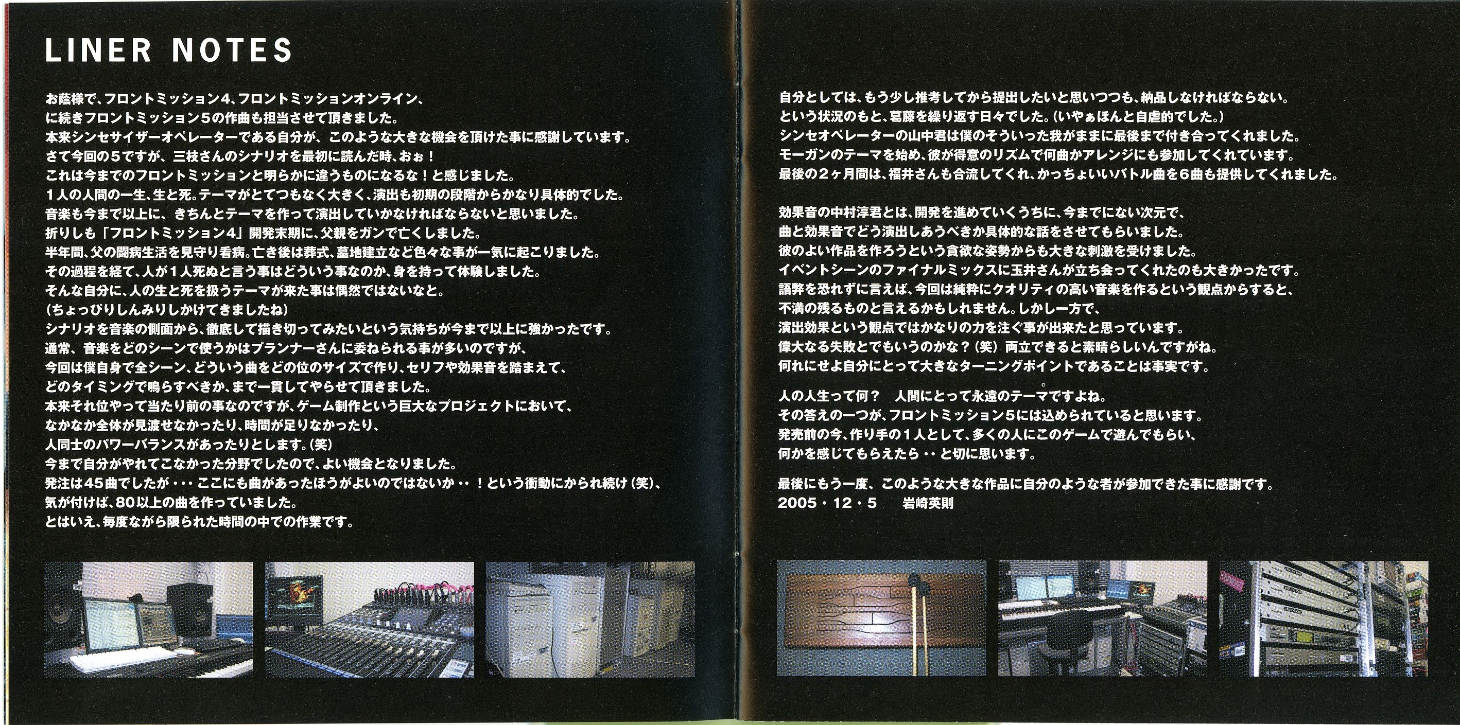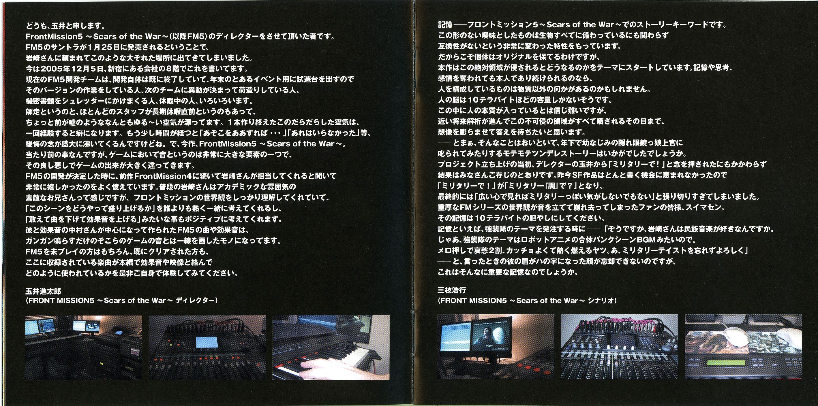 Liner Notes: Hidenori Iwasaki (pg. 5-6, 11, 12, 14~17), Shintaro Tamai (Front Mission 5 Director) (pg. 7), Hiroyuki Saegusa (Front Mission 5 Scenario Writer) (pg. 8), Kenichiro Fukui (pg. 12, 15, 16), Masayoshi Soken (pg. 17)