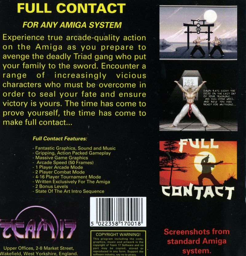Experience true arcade-quality action on the Amiga as you prepare to avenge the deadly Triad gang who put your family to the sword. Encounter a range of increasingly vicious characters who must be overcome in order to seal your fate and ensure victory is yours. The time has come to prove yourself, the time has come to make full contact...