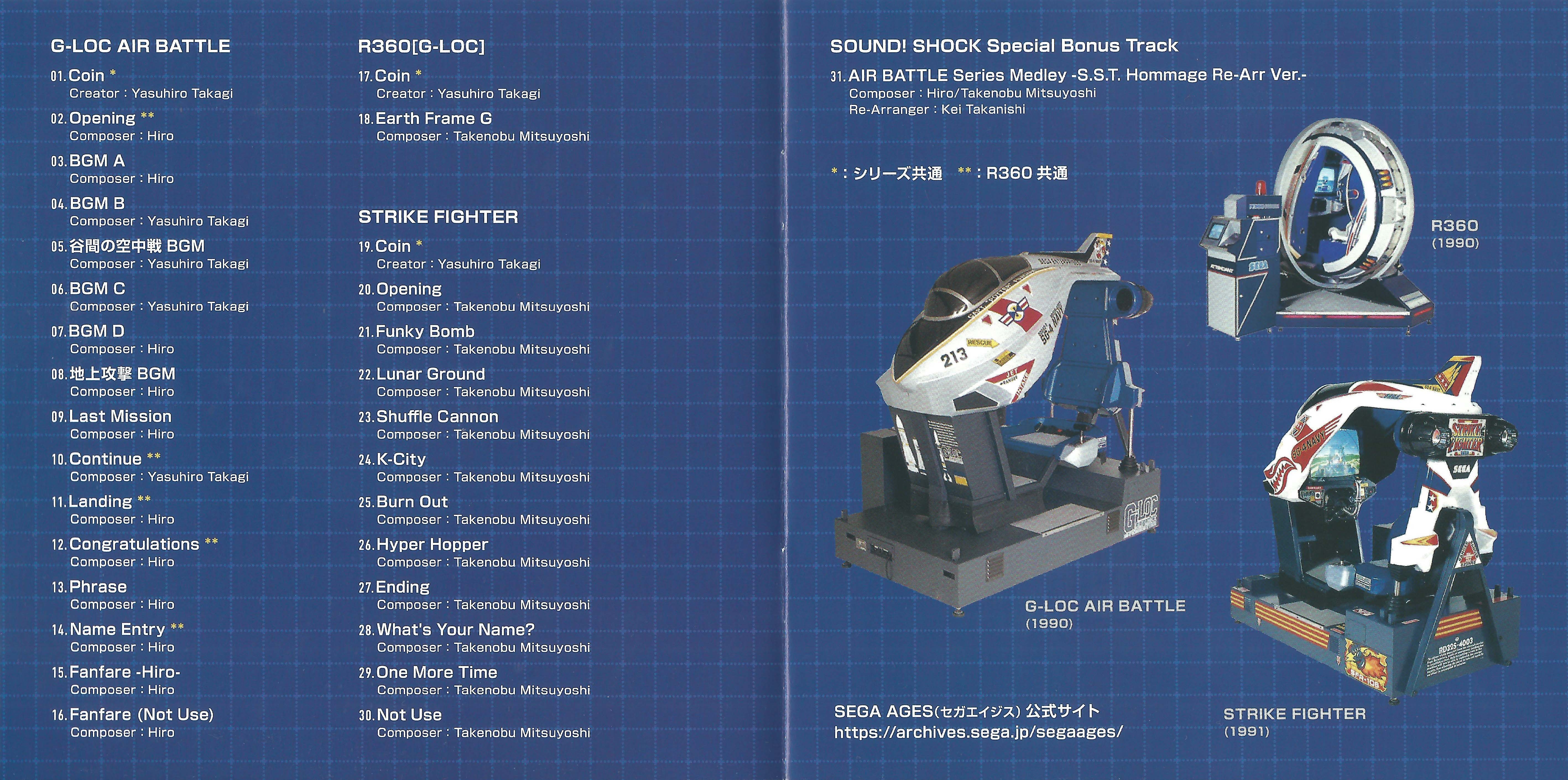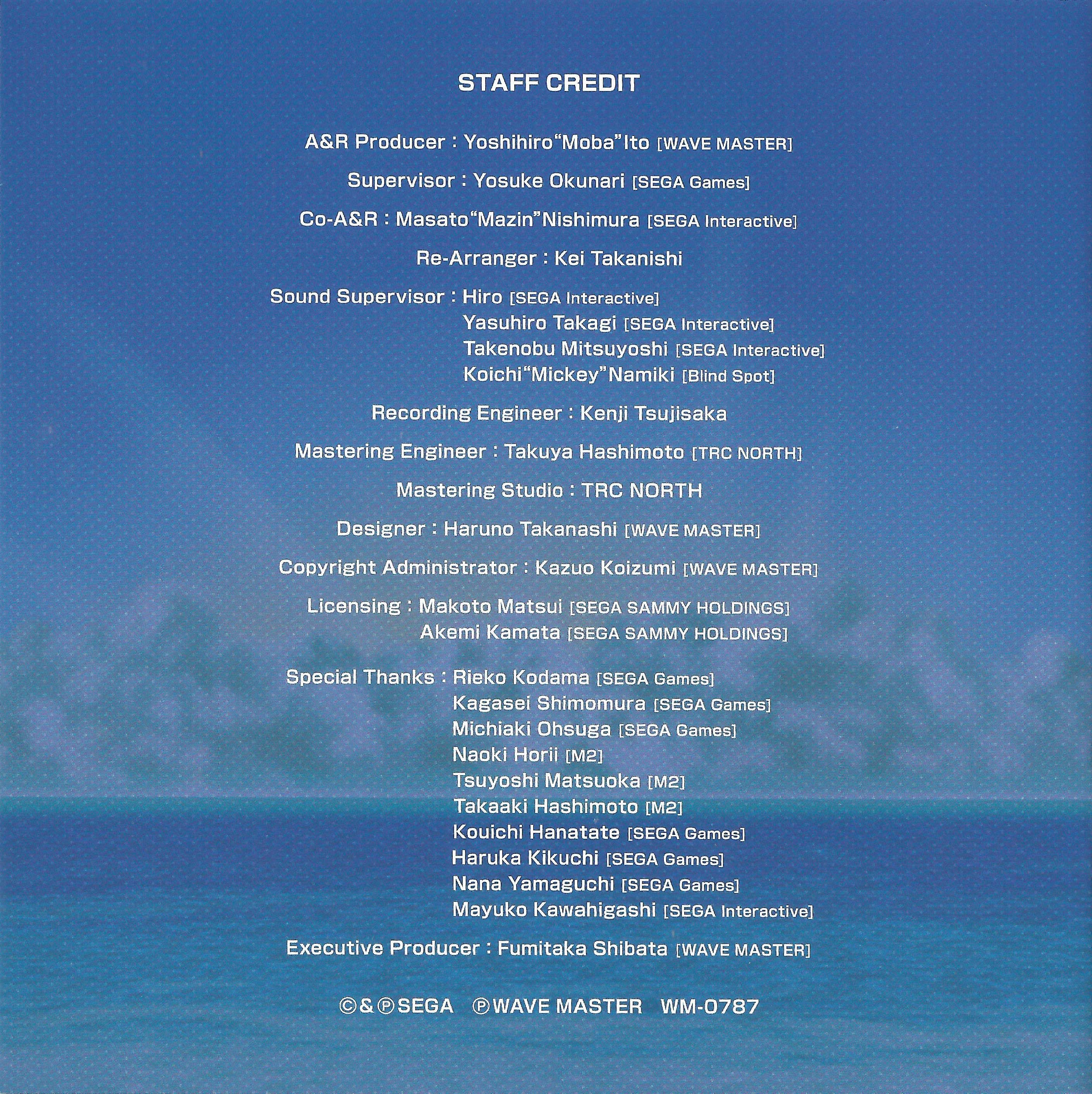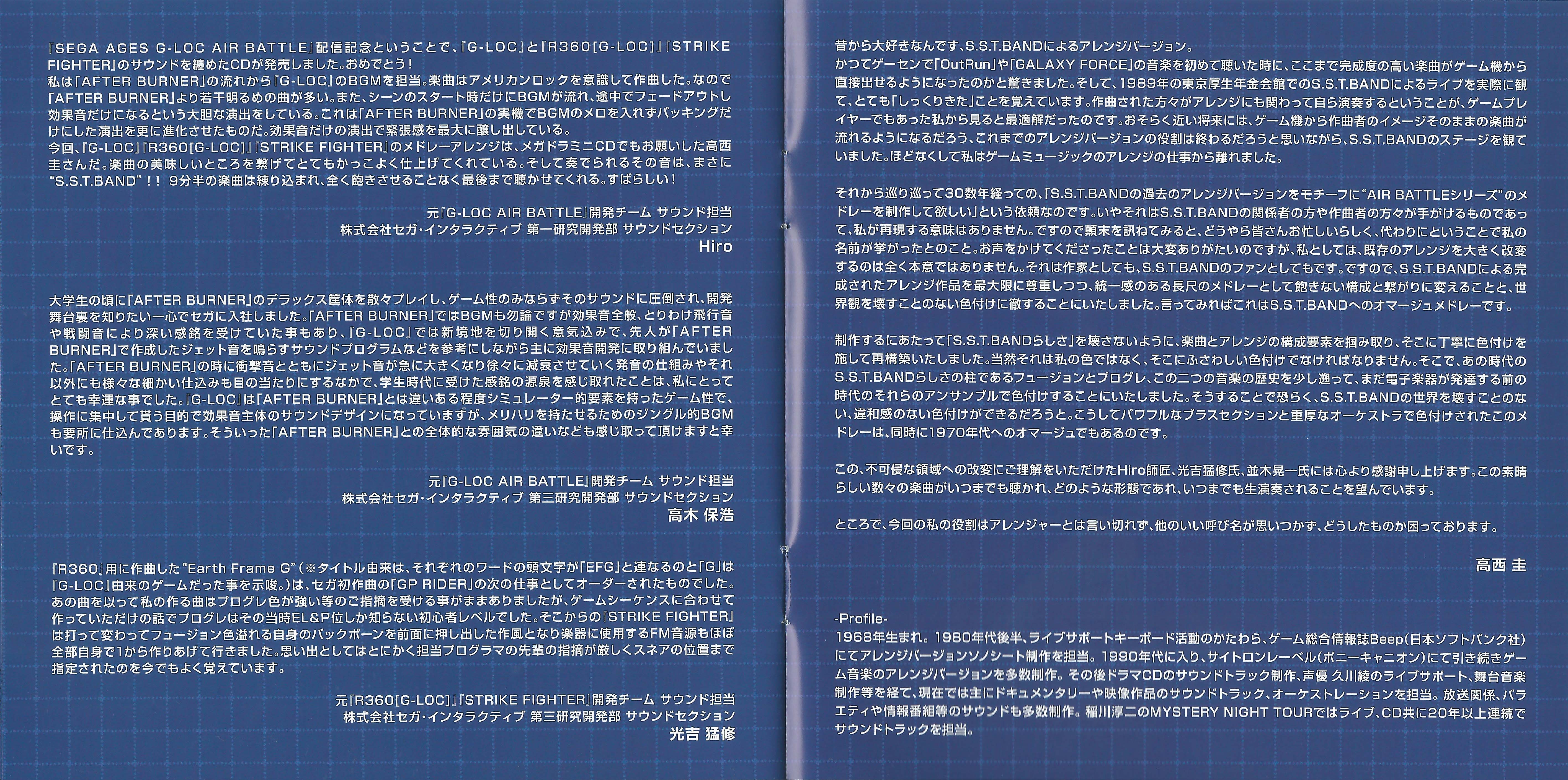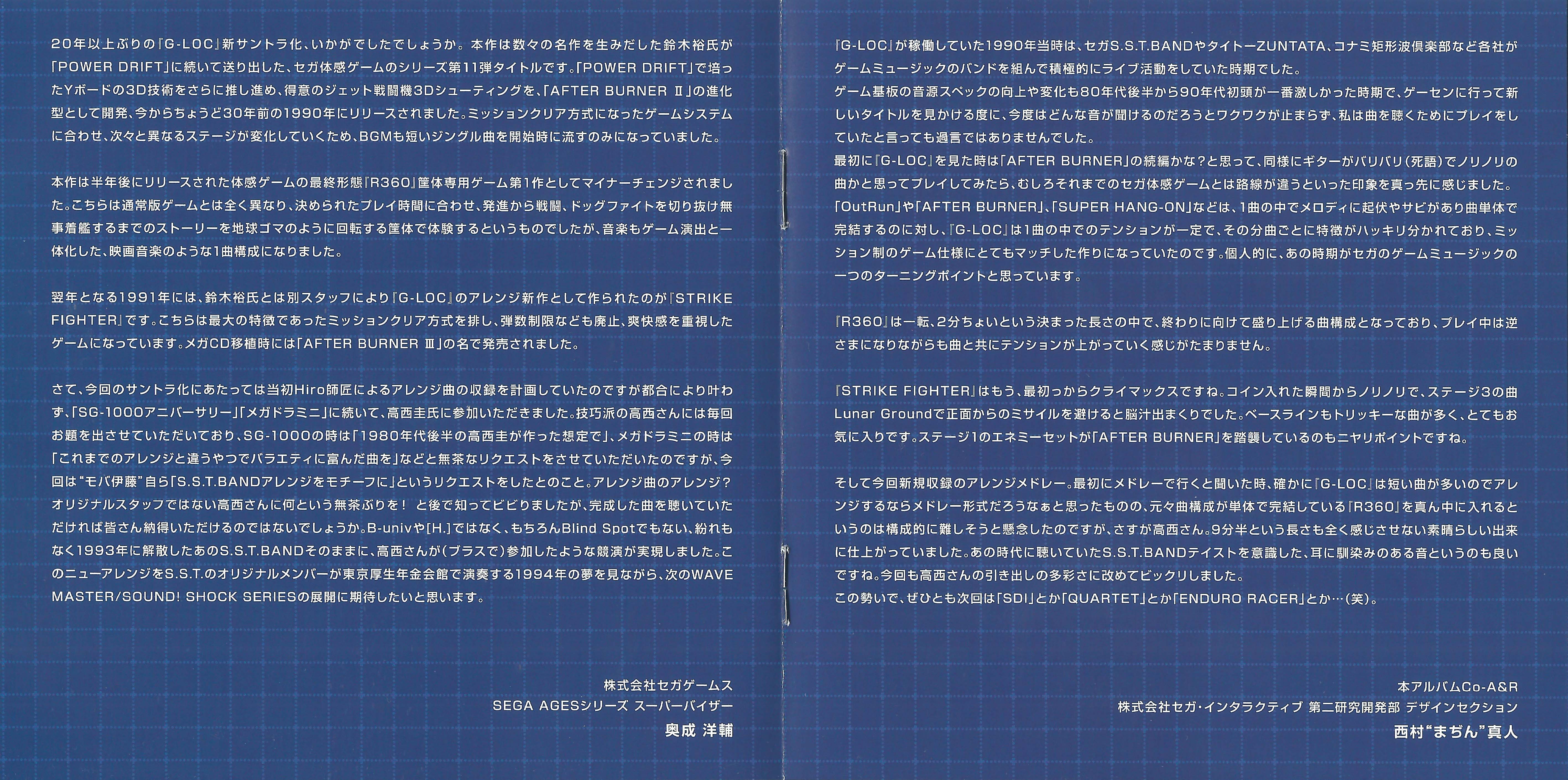 Booklet contains comments from composers Hiro, Yasuhiro Takagi and Takenobu Mitsuyoshi, as well as arranger Kei Takanishi, SEGA AGES series supervisor Yosuke Okunari and album co-A&R Masato "Mazin" Nishimura