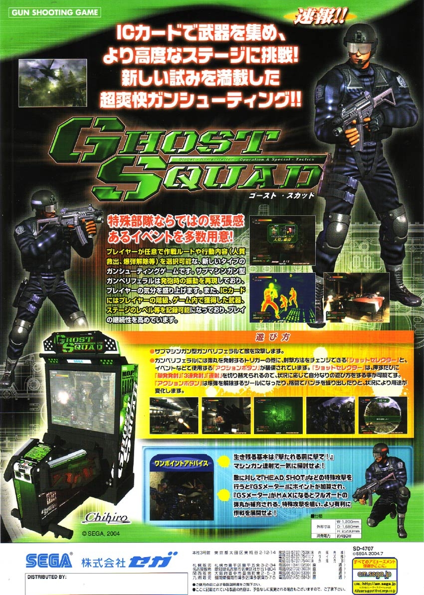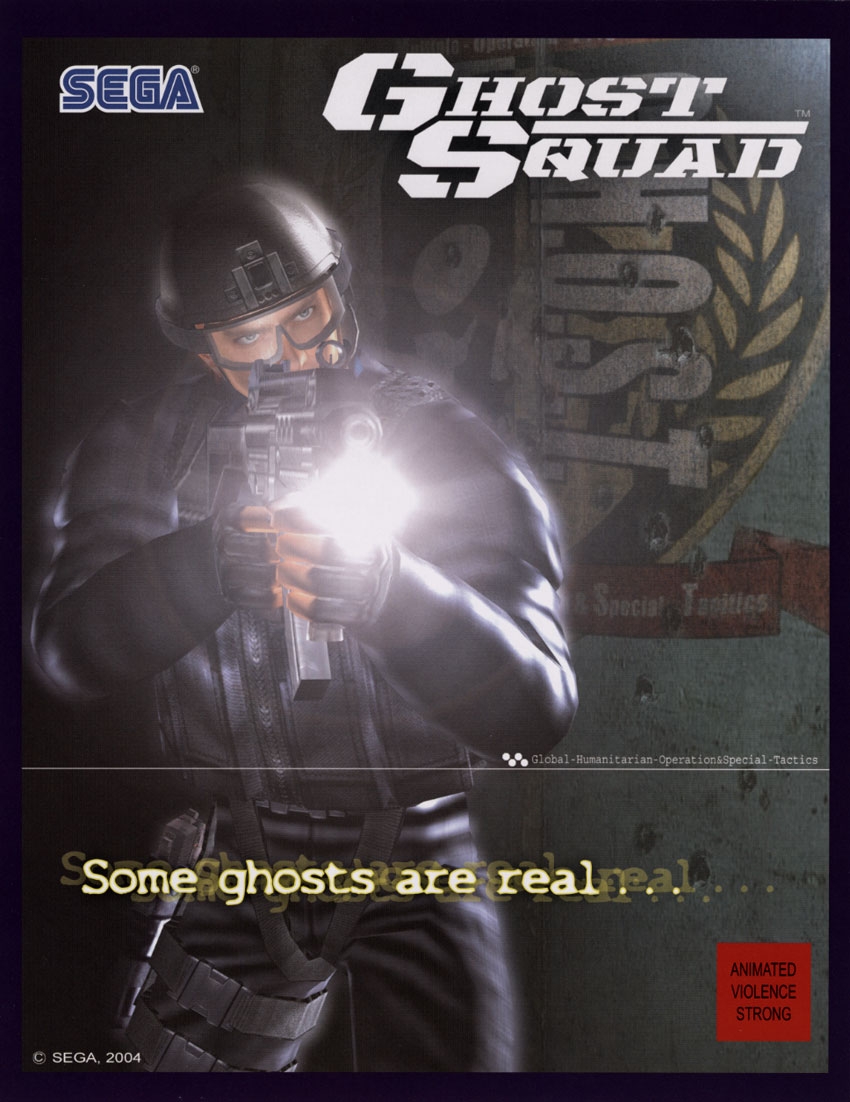 Sega released Ghost Squad for the arcade in 2004. Ghost Squad features a simulated IR light gun shaped similarly to the standard-issue weapon the game's protagonists use. This light gun is intended to function realistically: it features a working fire selector switch, a stock, force-feedback recoil, and iron sights. To ensure that the light gun fires accurately, a 20-second "calibration" mode is provided in which the game adjusts for any jostling or damage to the rifle's light-emitting components.