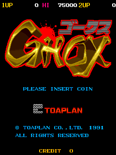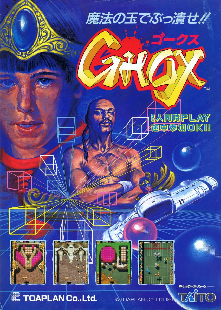 Ghox is an action game reminiscent of Devilish in which the players assume control of Axis (P1) and Bilious (P2), two men from the Eastern Country summoned by King Gitane of the Akuria empire, from a top-down perspective where the main objective on each stage is to break as many bricks and obstacles as possible from the playfield with a single ball by using the walls and/or the paddle to ricochet the ball back to eliminate them, while a boss at the end of every seventh stage must be fought before progressing any further in an effort to overthrow the evil magician Jagula from conquering the world along with his legion of unleashed evil spirits from the netherworld, in addition of rescuing the goddess Lucia from her captivity.