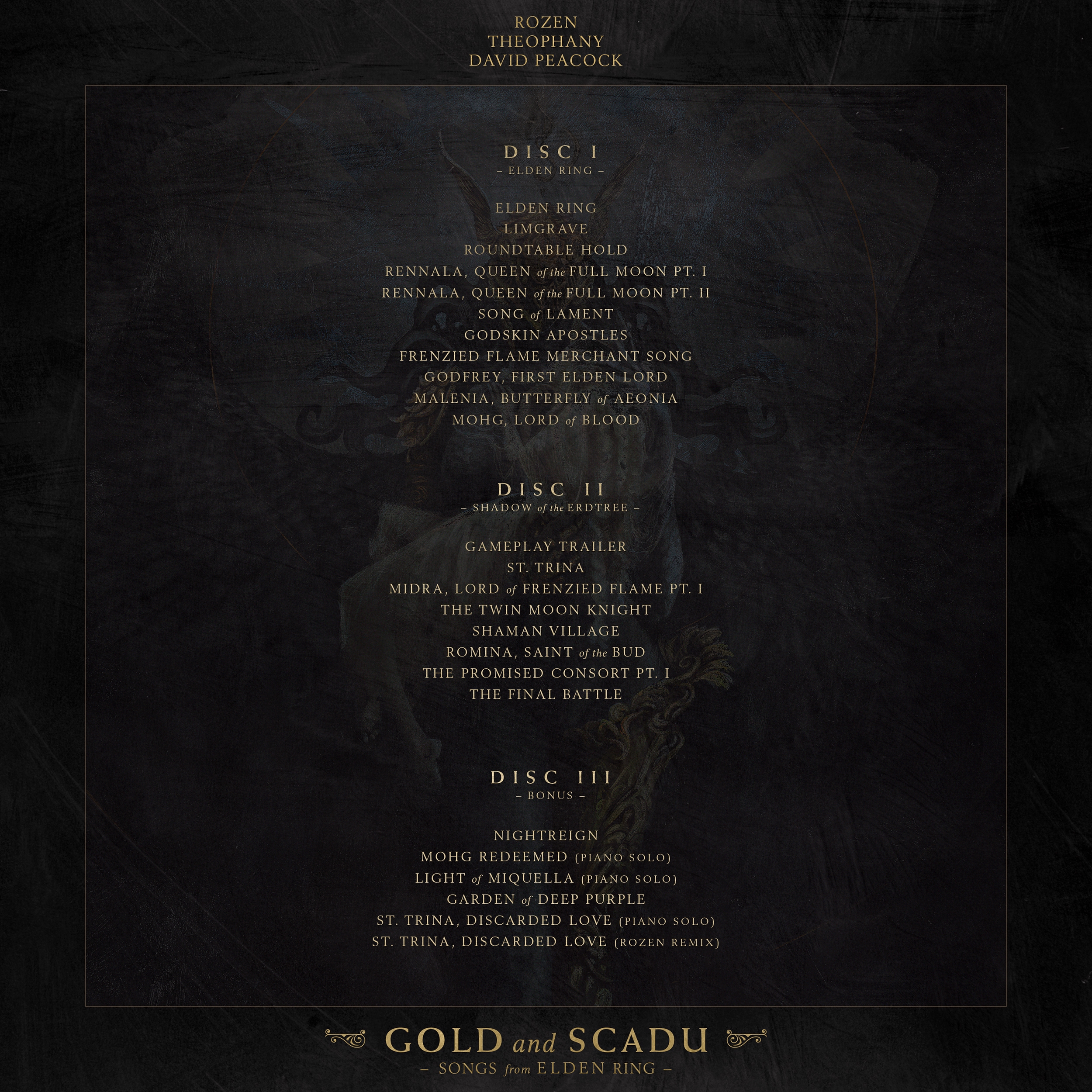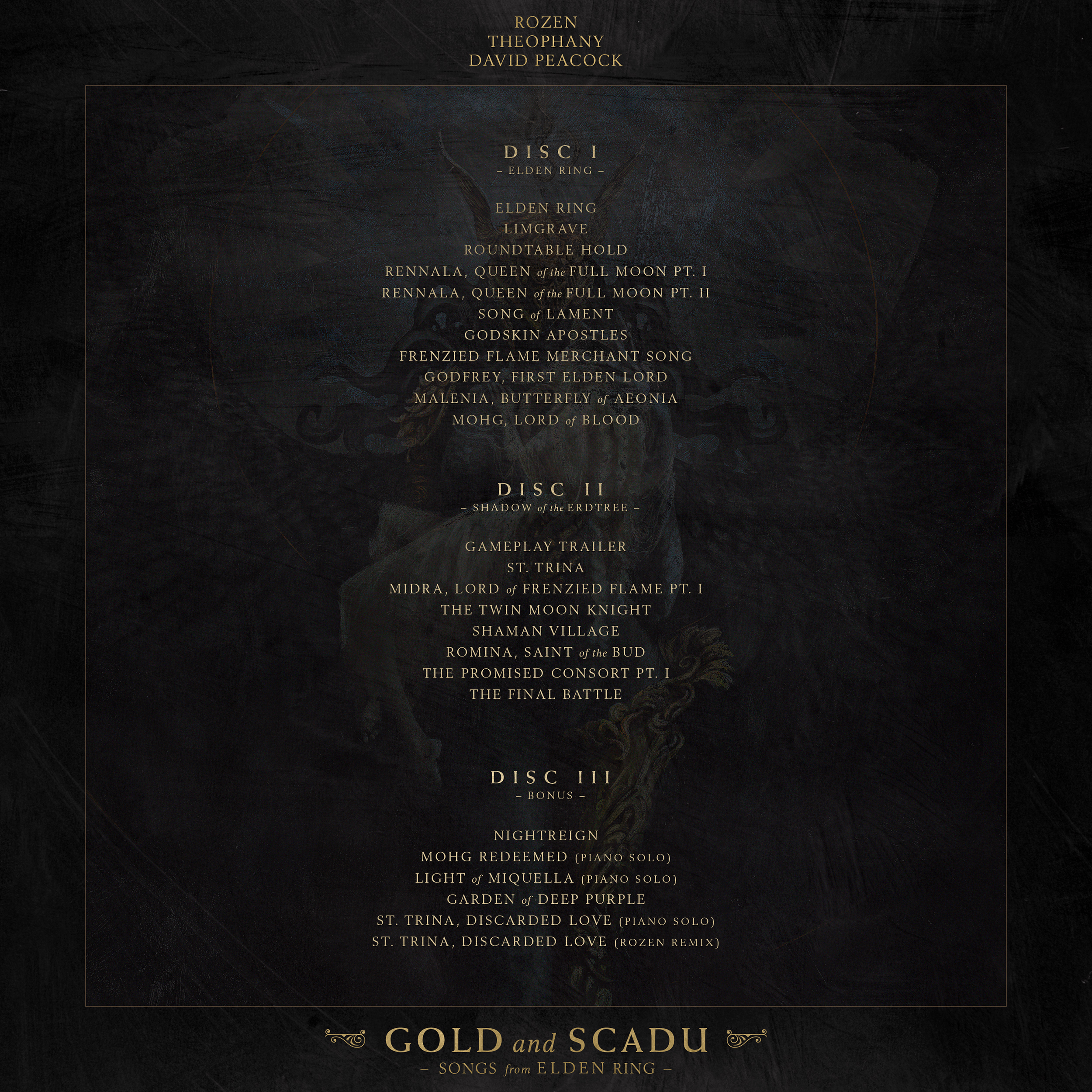 Gold and Scadu” (pronounced "shadow") is the result of a year-long collaboration between ROZEN, Theophany, and David Peacock. Featuring 25 arrangements from Elden Ring, Shadow of the Erdtree, and Nightreign, the album explores the haunting beauty, mythic grandeur, and emotional depth of the Lands Between.