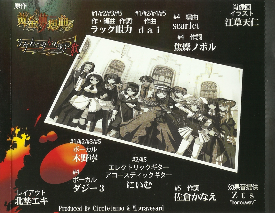 Contains the opening theme to the Umineko no Naku Koro ni fighting game spinoff "Ougon Musoukyoku" and arrangements from Umineko no Naku Koro ni Chiru.
