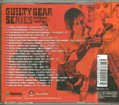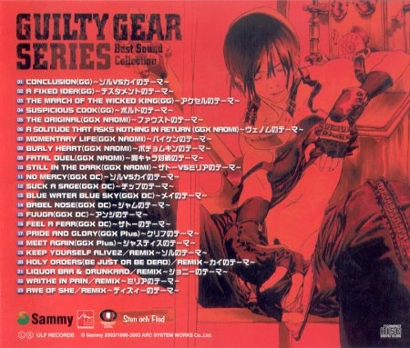 A best collection of Guilty Gear game tracks from the original Guilty Gear, Guilty Gear X (NAOMI Arcade version), Guilty Gear X (Dreamcast version), and Guilty Gear X Plus. Also has 5 new remixes.