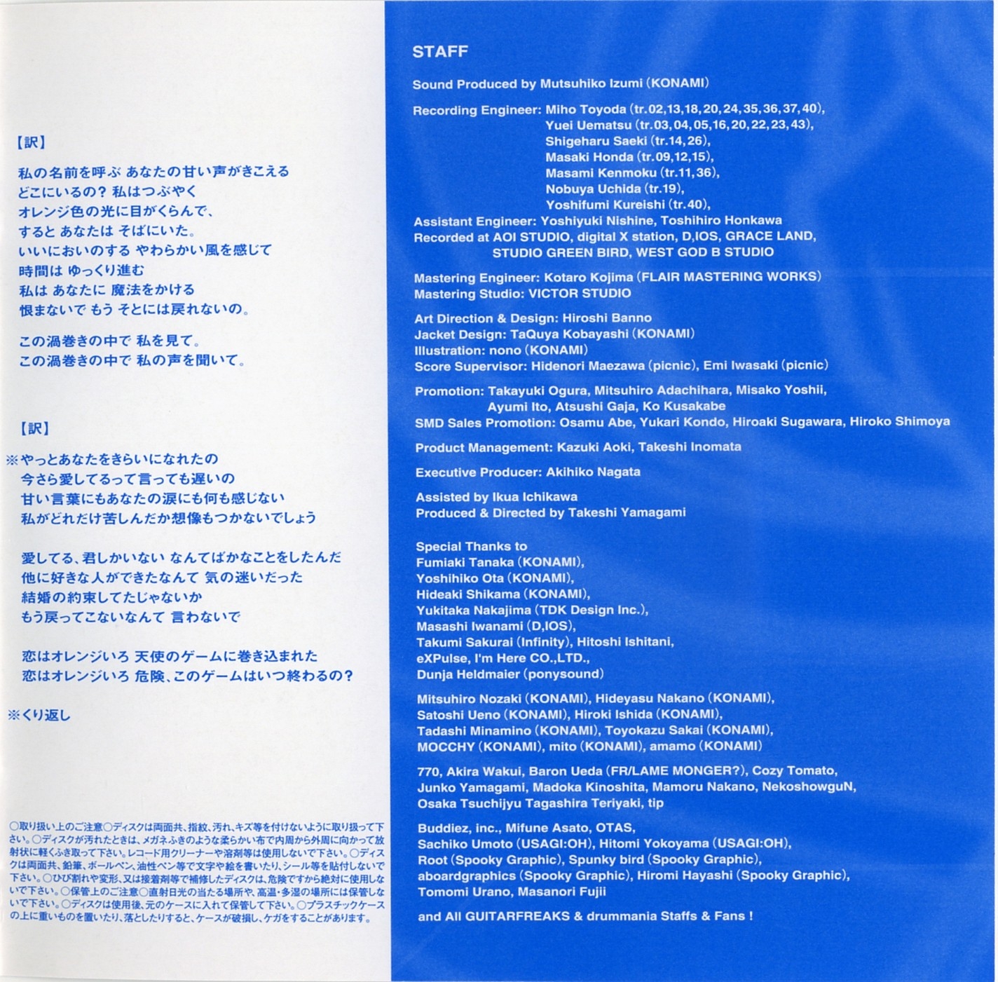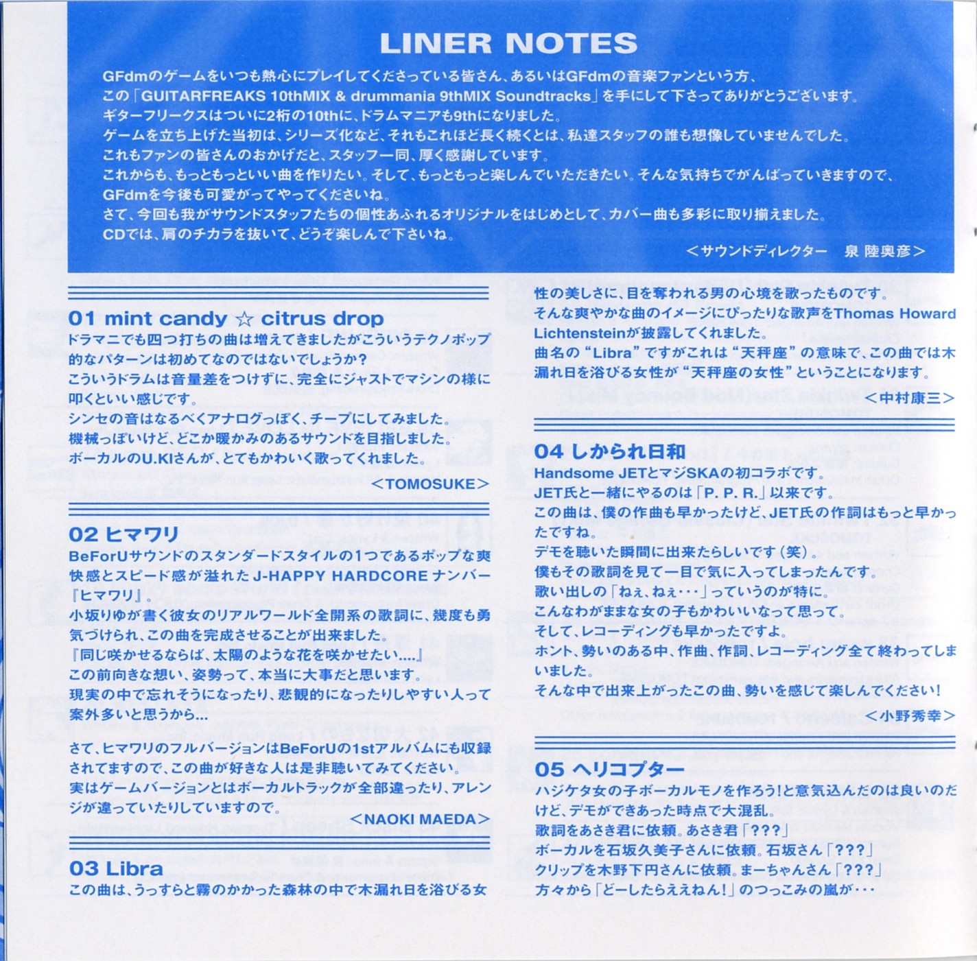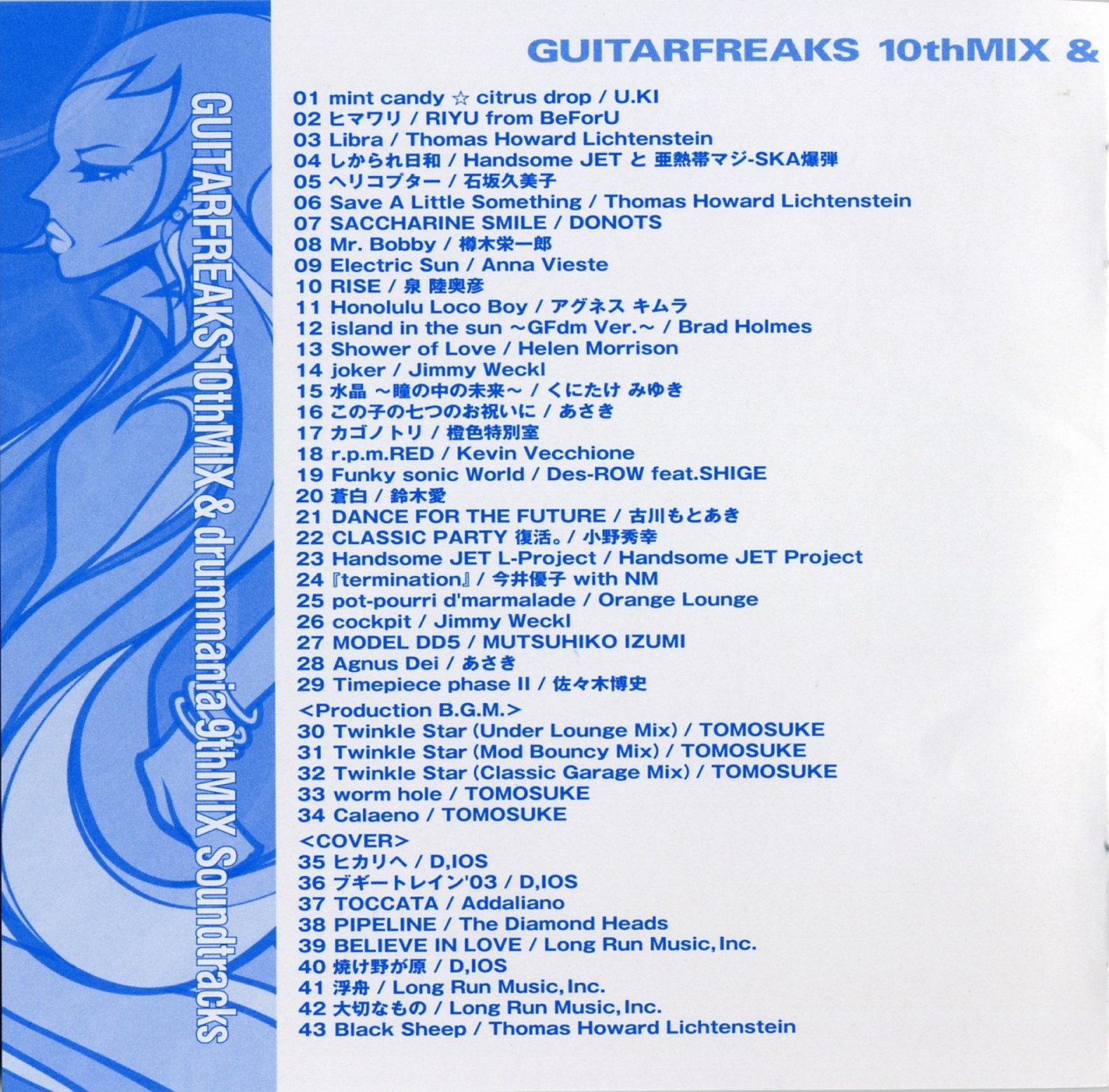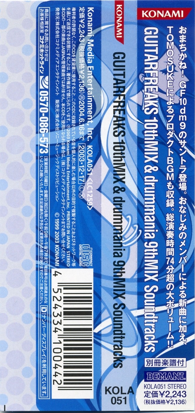 Special Thanks to Fumiaki Tanaka (KONAMI), Yoshihiko Ota (KONAMI), Hideaki Shikama (KONAMI), Yukitaka Nakajima (TDK Design Inc.), Masashi Iwanami (D,IOS), Takumi Sakurai (Infinity), Hitoshi Ishitani, eXPulse, I'm Here CO.,LTD., Dunja Heldmaier (ponysound), Mitsuhiro Nozaki (KONAMI), Hideyasu Nakano (KONAMI), Satoshi Ueno (KONAMI), Hiroki Ishida (KONAMI), Tadashi Minamino (KONAMI), Toyokazu Sakai (KONAMI), MOCCHY (KONAMI), mito (KONAMI), amamo (KONAMI), 770, Akira Wakui, Baron Ueda (FR/LAME MONGER?), Cozy Tomato, Junko Yamagami, Madoka Kinoshita, Mamoru Nakano, NekoshowguN, Osaka Tsuchijyu Tagashira Teriyaki, tip, Buddiez, inc ., Mifune Asato, OTAS, Sachiko Umoto (USAGI:OH), Hitomi Yokoyama (USAGI:OH), Root (Spooky Graphic), Spunky bird (Spooky Graphic), aboardgraphics (Spooky Graphic), Hiromi Hayashi (Spooky Graphic), Tomomi Urano, Masanori Fujii and All GUITARFREAKS & drummania Staffs & Fans !