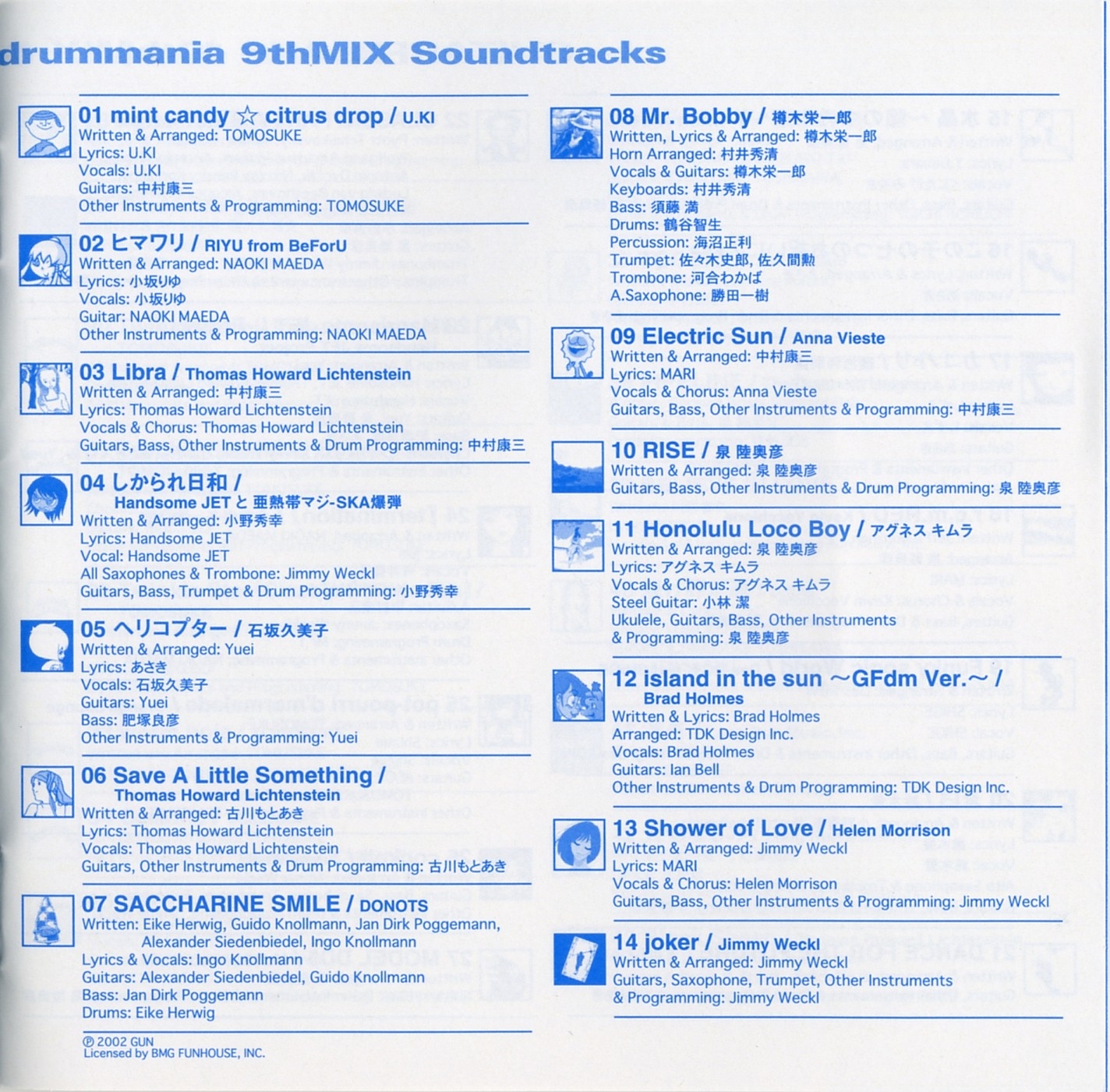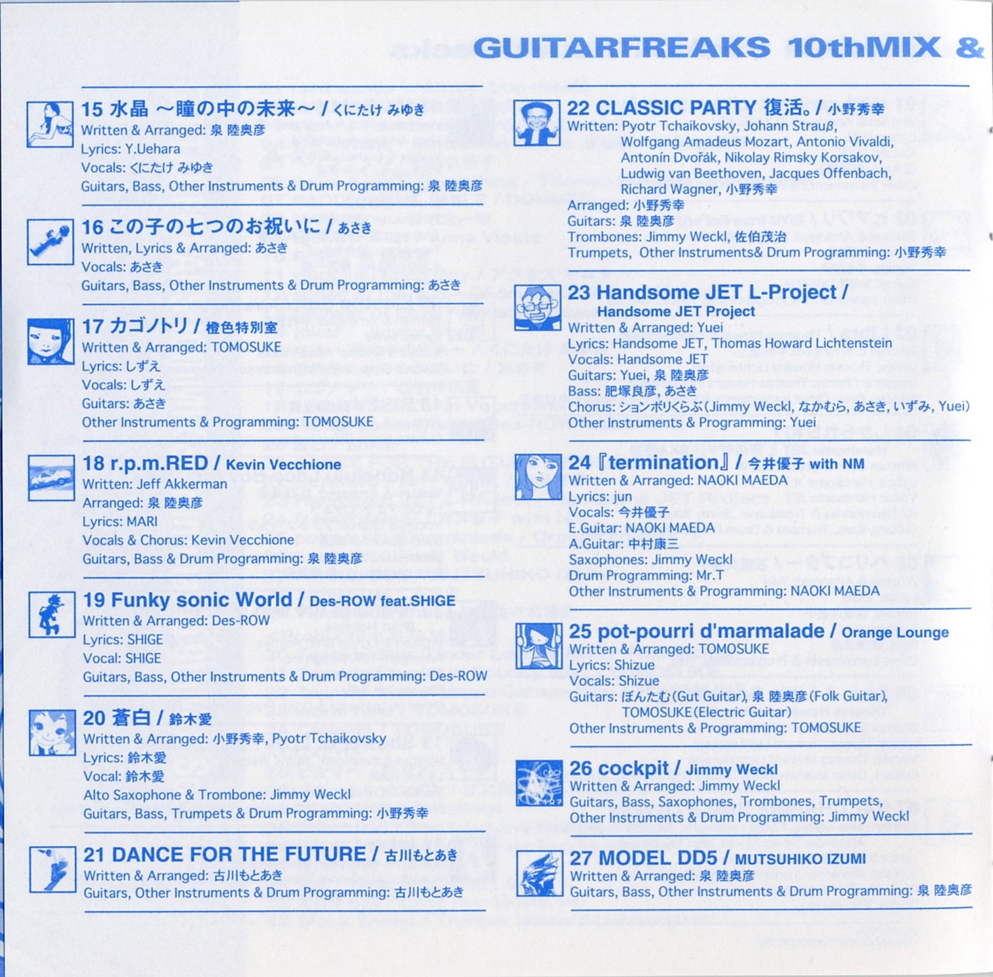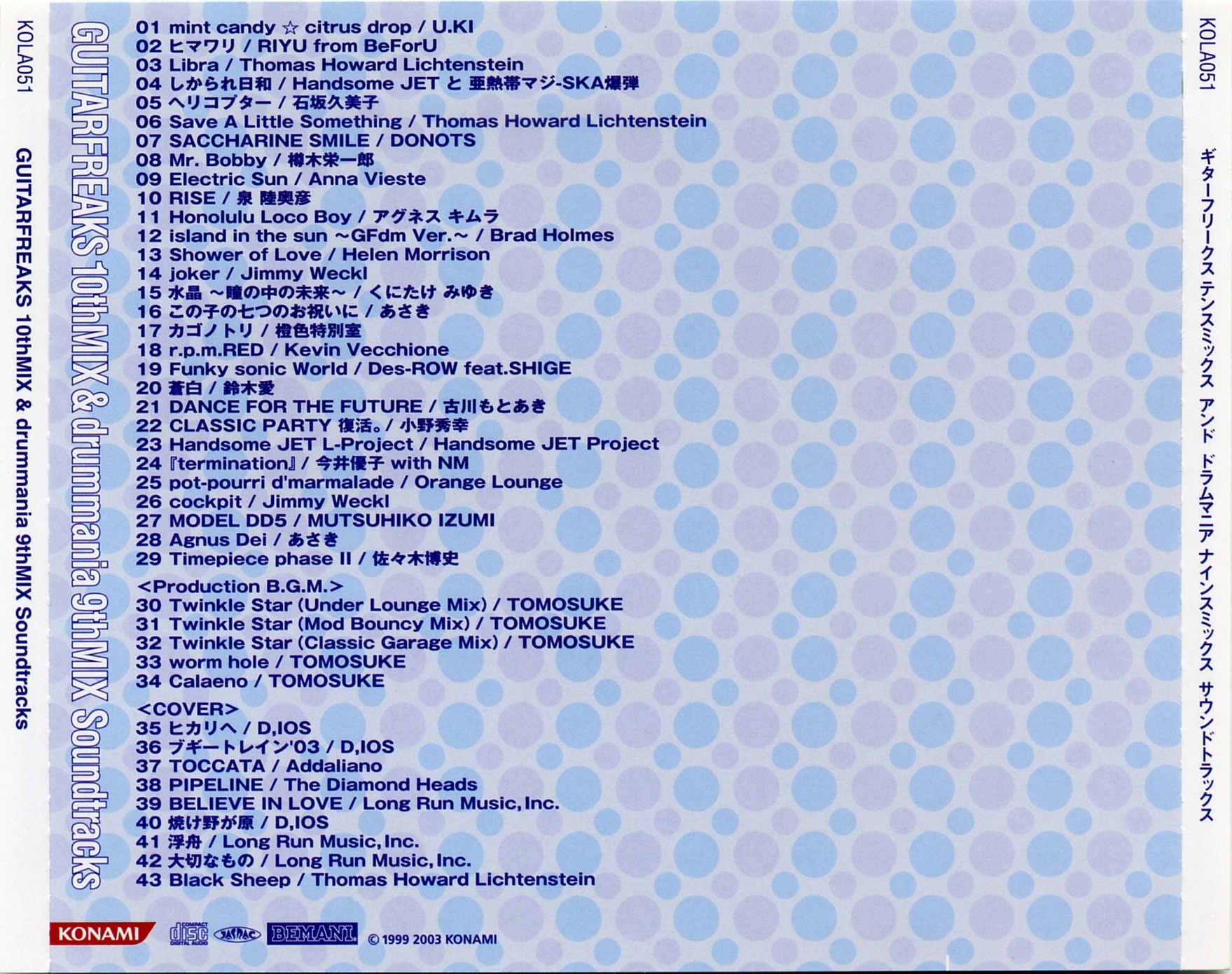 Special Thanks to Fumiaki Tanaka (KONAMI), Yoshihiko Ota (KONAMI), Hideaki Shikama (KONAMI), Yukitaka Nakajima (TDK Design Inc.), Masashi Iwanami (D,IOS), Takumi Sakurai (Infinity), Hitoshi Ishitani, eXPulse, I'm Here CO.,LTD., Dunja Heldmaier (ponysound), Mitsuhiro Nozaki (KONAMI), Hideyasu Nakano (KONAMI), Satoshi Ueno (KONAMI), Hiroki Ishida (KONAMI), Tadashi Minamino (KONAMI), Toyokazu Sakai (KONAMI), MOCCHY (KONAMI), mito (KONAMI), amamo (KONAMI), 770, Akira Wakui, Baron Ueda (FR/LAME MONGER?), Cozy Tomato, Junko Yamagami, Madoka Kinoshita, Mamoru Nakano, NekoshowguN, Osaka Tsuchijyu Tagashira Teriyaki, tip, Buddiez, inc ., Mifune Asato, OTAS, Sachiko Umoto (USAGI:OH), Hitomi Yokoyama (USAGI:OH), Root (Spooky Graphic), Spunky bird (Spooky Graphic), aboardgraphics (Spooky Graphic), Hiromi Hayashi (Spooky Graphic), Tomomi Urano, Masanori Fujii and All GUITARFREAKS & drummania Staffs & Fans !