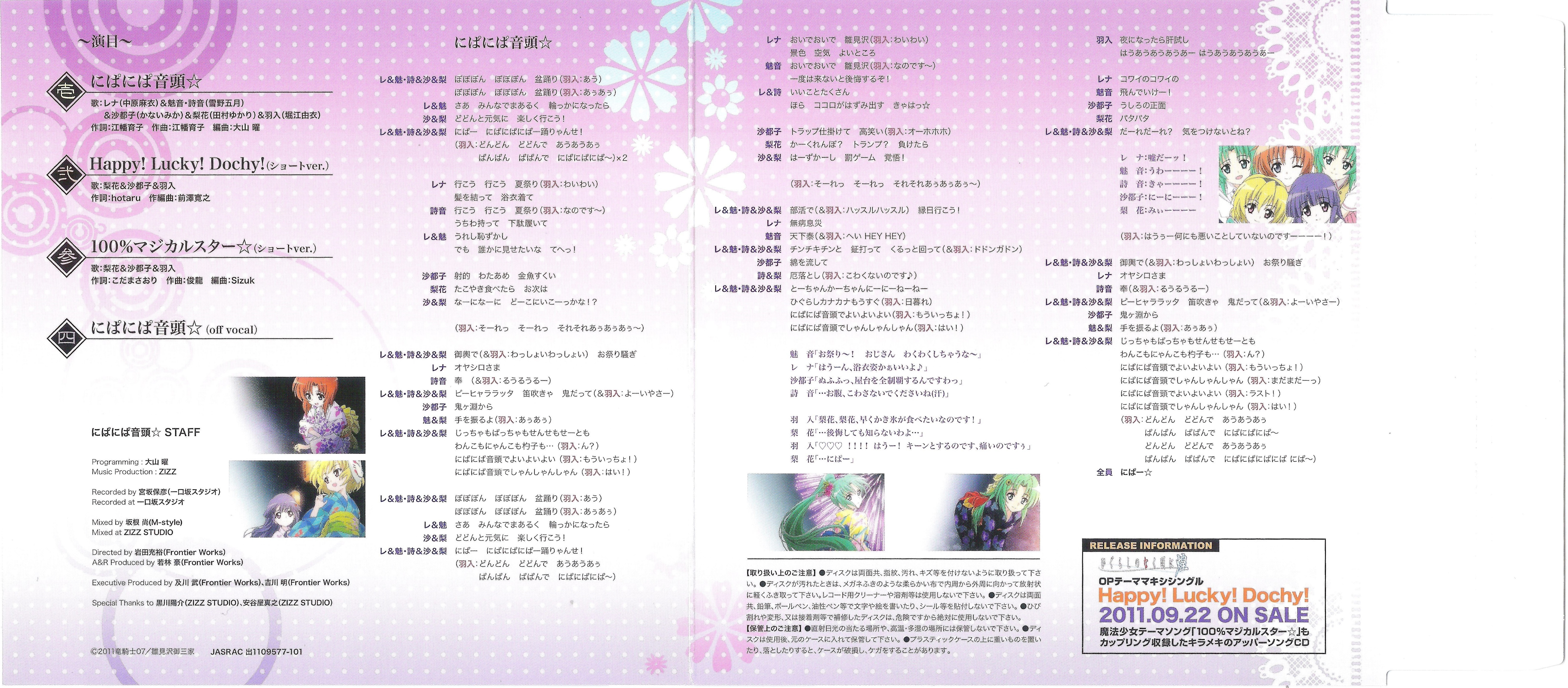 Vocals: Rena (CV: Mai Nakahara), Mion/Shion (CV: Satsuki Yukino), Satoko (CV: Mika Kanai), Rika (CV: Yukari Tamura) & Hanyuu (CV: Yui Horie)