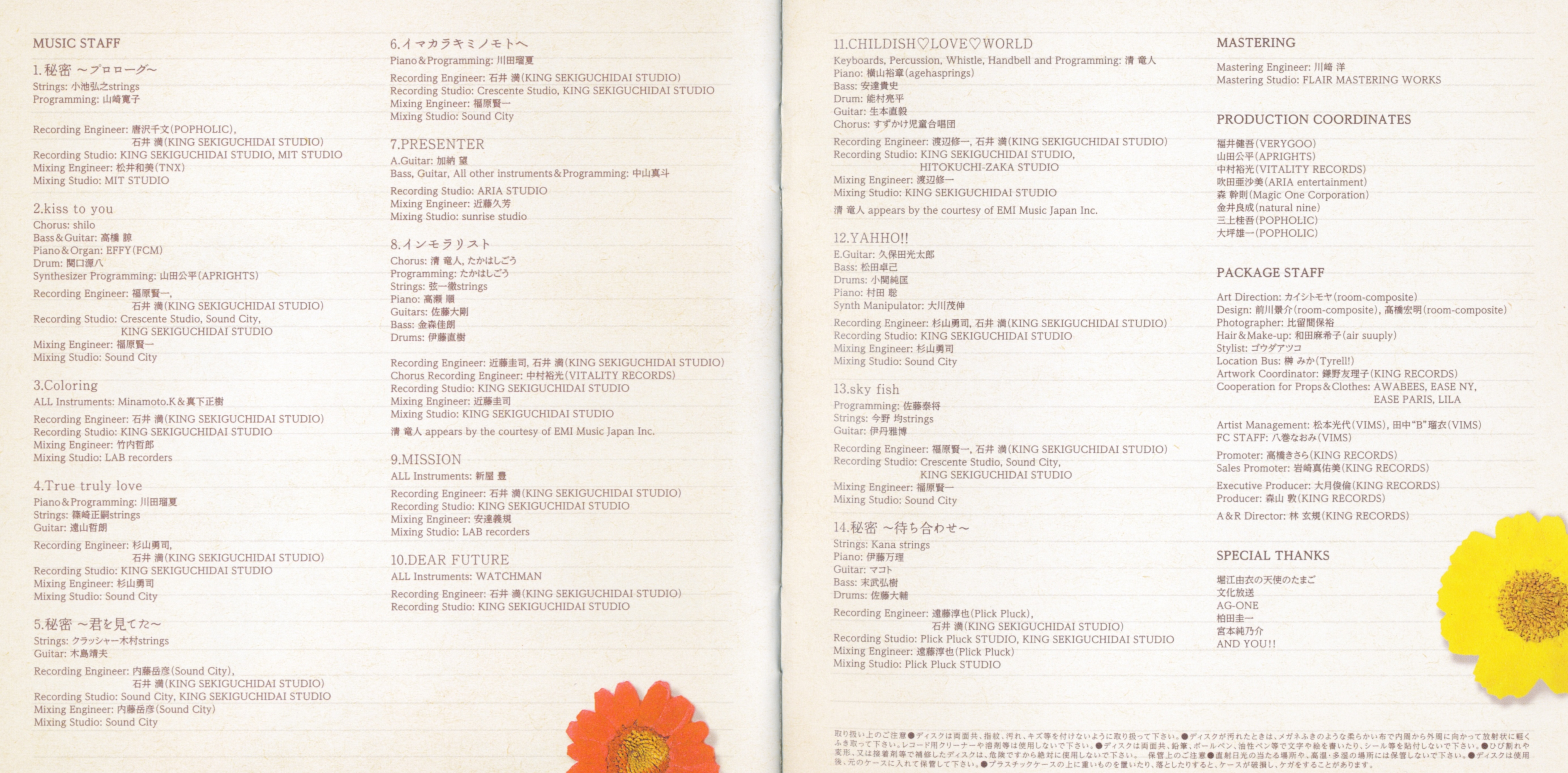 Recording Engineer: Takehiko Naito (Sound City), Chifumi Karasawa (KING SEKIGUCHIDAI STUDIO)