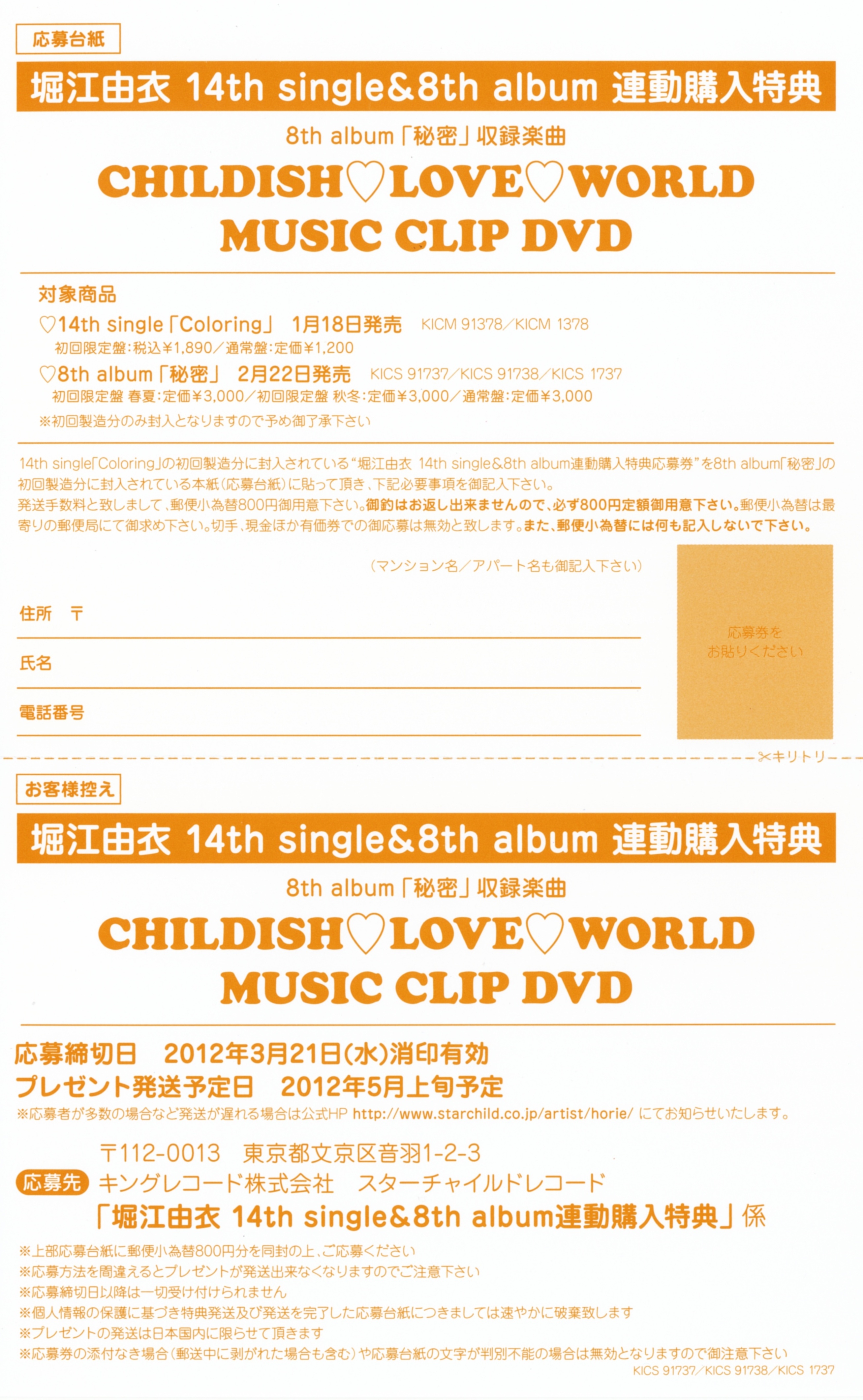 - First Press Bonus: A coupon for combined purchase of Yui Horie's 14th single "Coloring" & 8th album "Himitsu"
