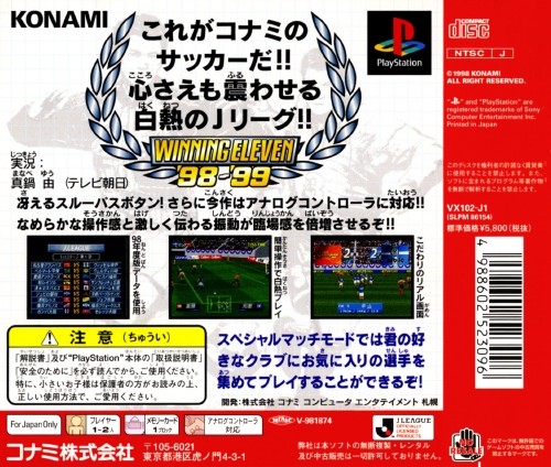 J.League Winning Eleven '98-'99 is the officially licensed action soccer game based on the second stage of the 1998 J.League season. It is the follow-up to J.league '97 and Winning Eleven 3. The series is well known for its smooth gameplay and simplicity of controls.
