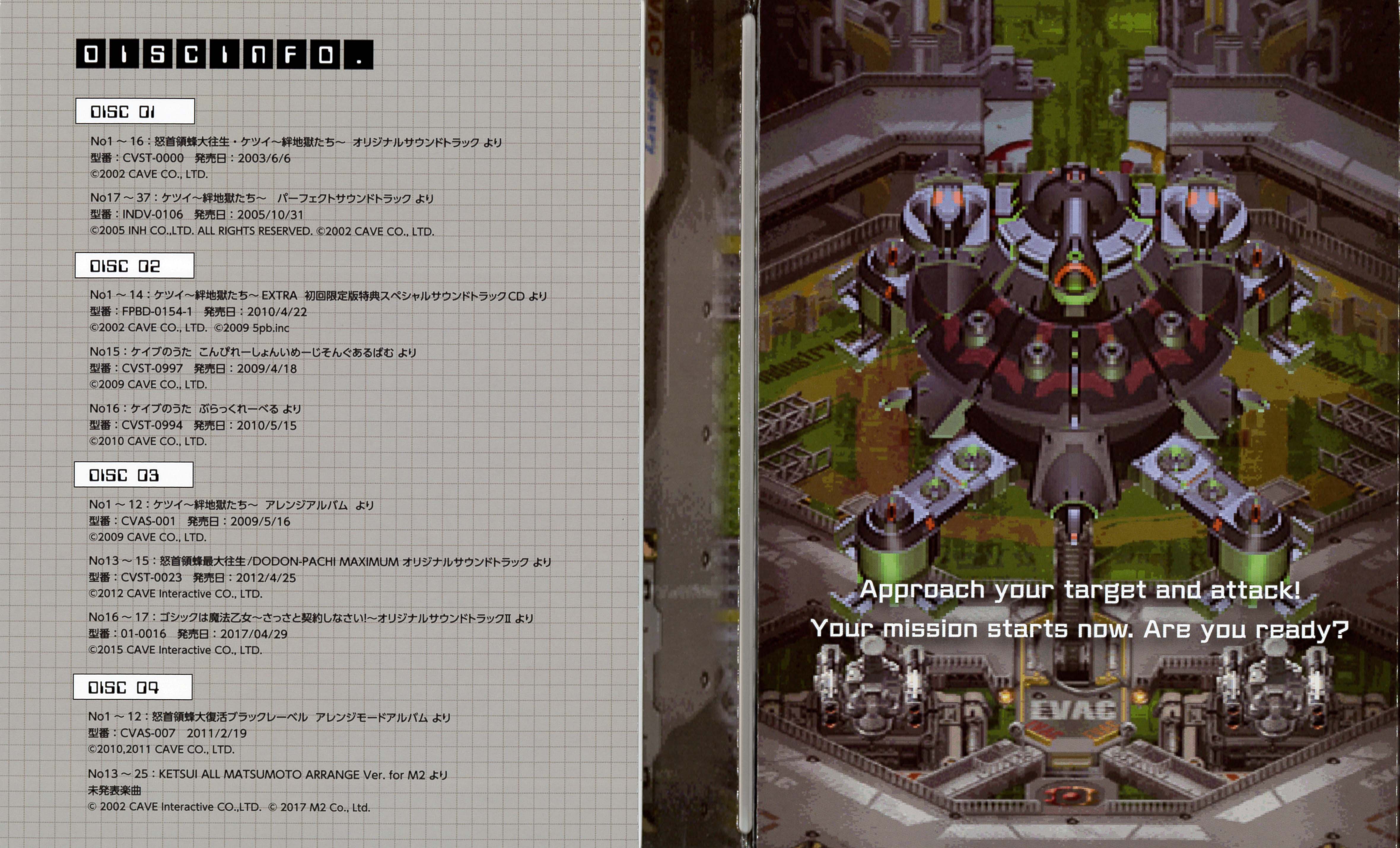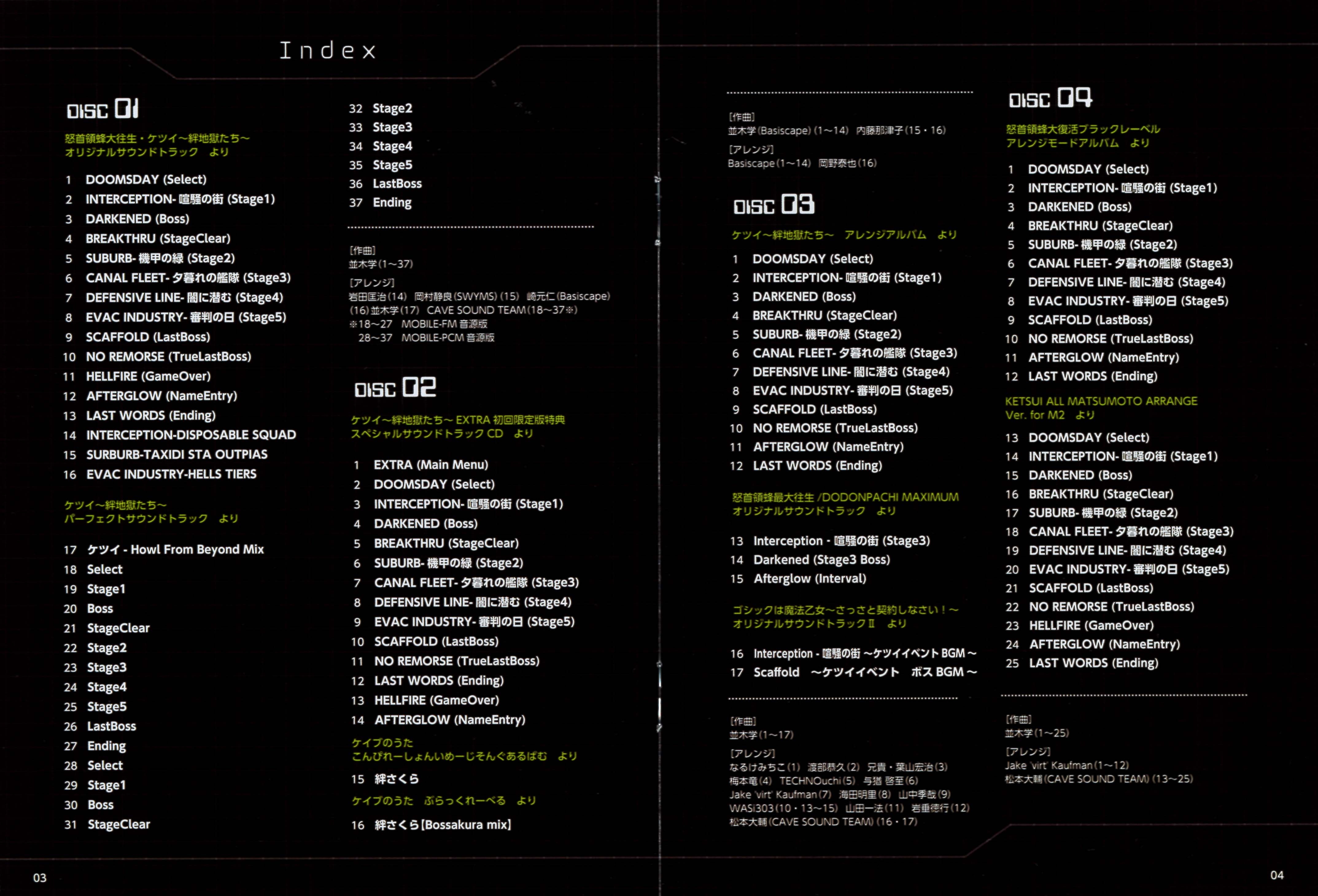 *Tracks 13 to 25 were previously unreleased, newly arranged tracks for the M2 ShotTriggers release of Ketsui Deathtiny -Kizuna Jigoku Tachi-.