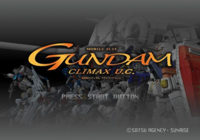 Mobile Suit Gundam: Climax U.C. is an action game set in the original Universal Century Gundam timeline. Players can experience the events in Chronicle or Progress mode, or take any unlocked pilot and MS into VS Mode against a human opponent. In Chronicle mode the players chooses a Gundam series to play through. Initially only the series protagonist (i.e. Amuro Ray or Kamille Bidan) is playable, but completing a series will unlock minor characters and antagonists as playable for the events. In Progress Mode the player plays as Kamina Tachibana, an ensign of either the Earth Federation or Principality of Zeon whose military career starts during the attack on Jaburo. The player can select Kamina's personality, the mech he pilots during a mission, and how to distribute his skill points after a mission. Performing well on a mission and using weaker mobile suits will give Kamina more skill points to distribute, and piloting specific mechs will unlock the ability to acquire specific Active Skills. Kamina's stages run the full length of the Universal Century timeline, including his retirement during the 30 years of peace following Char's Counterattack and the new conflict during Gundam F91. Up to 12 personalized Kaminas can be saved for VS or the free battle Extra mode.