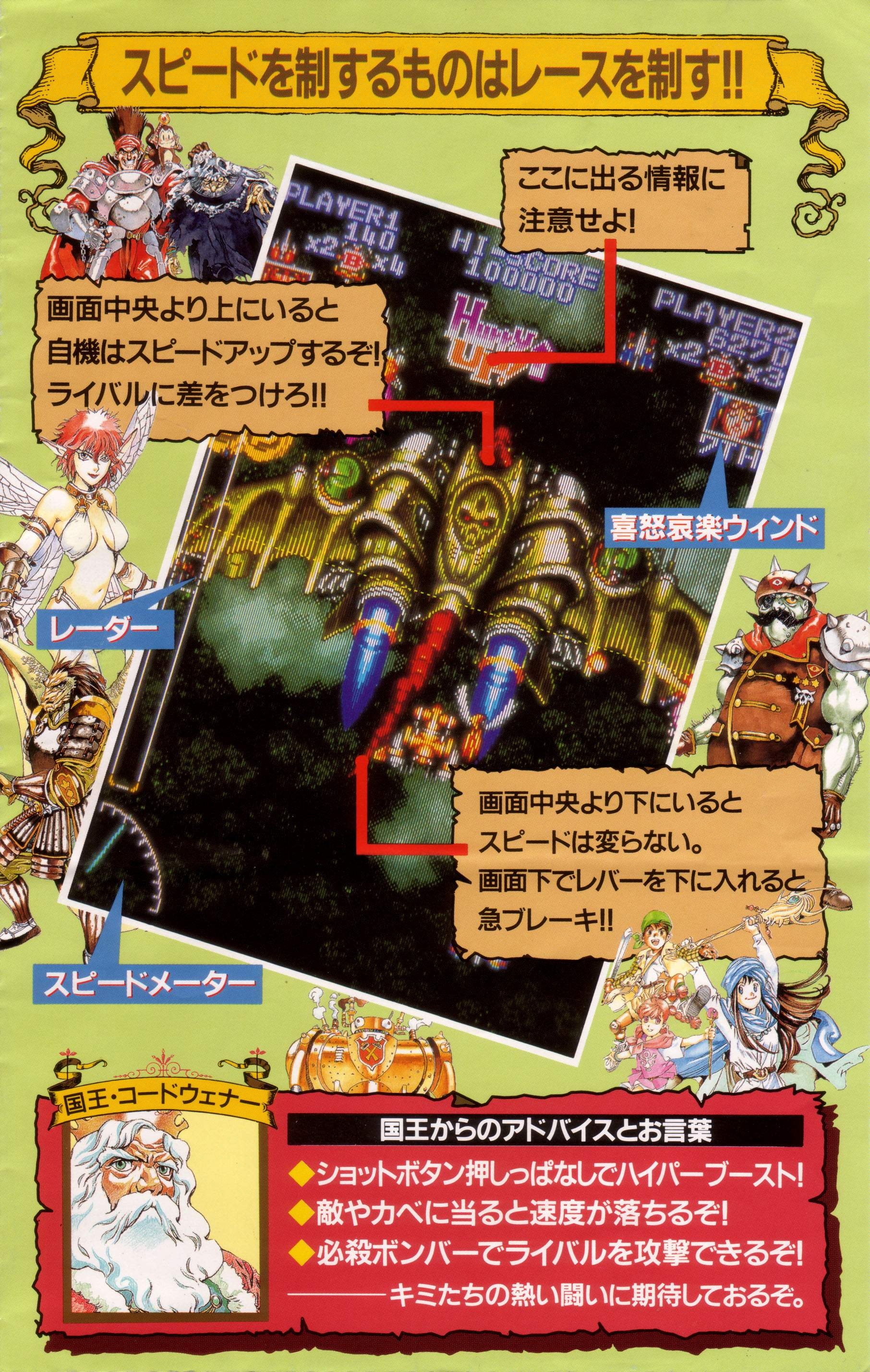 The game consists of a vertically scrolling field where the player races against seven contestants while shooting enemies and avoiding enemy bullets. Tapping the fire button fires the player's weapons; holding it down gives the player a speed boost. In addition to these speed boosts, overall speed will increase or decrease depending on screen position (the higher up the player craft is onscreen, the faster it travels). Overall speed decreases every time a life is lost or the next stage is reached.
