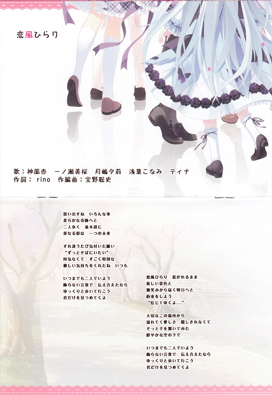 Composer: Satoshi Hono / Vocals: Ann Jinpou (CV: Iroha Natsumine), Mio Ichinose (CV: Yuika Ayabe), Yuri Tsukishima (CV: Konoe Yozora), Konami Asaba (CV: Aoi Uehara), Tina (CV: Yun Sachi) / Lyrics: rino
