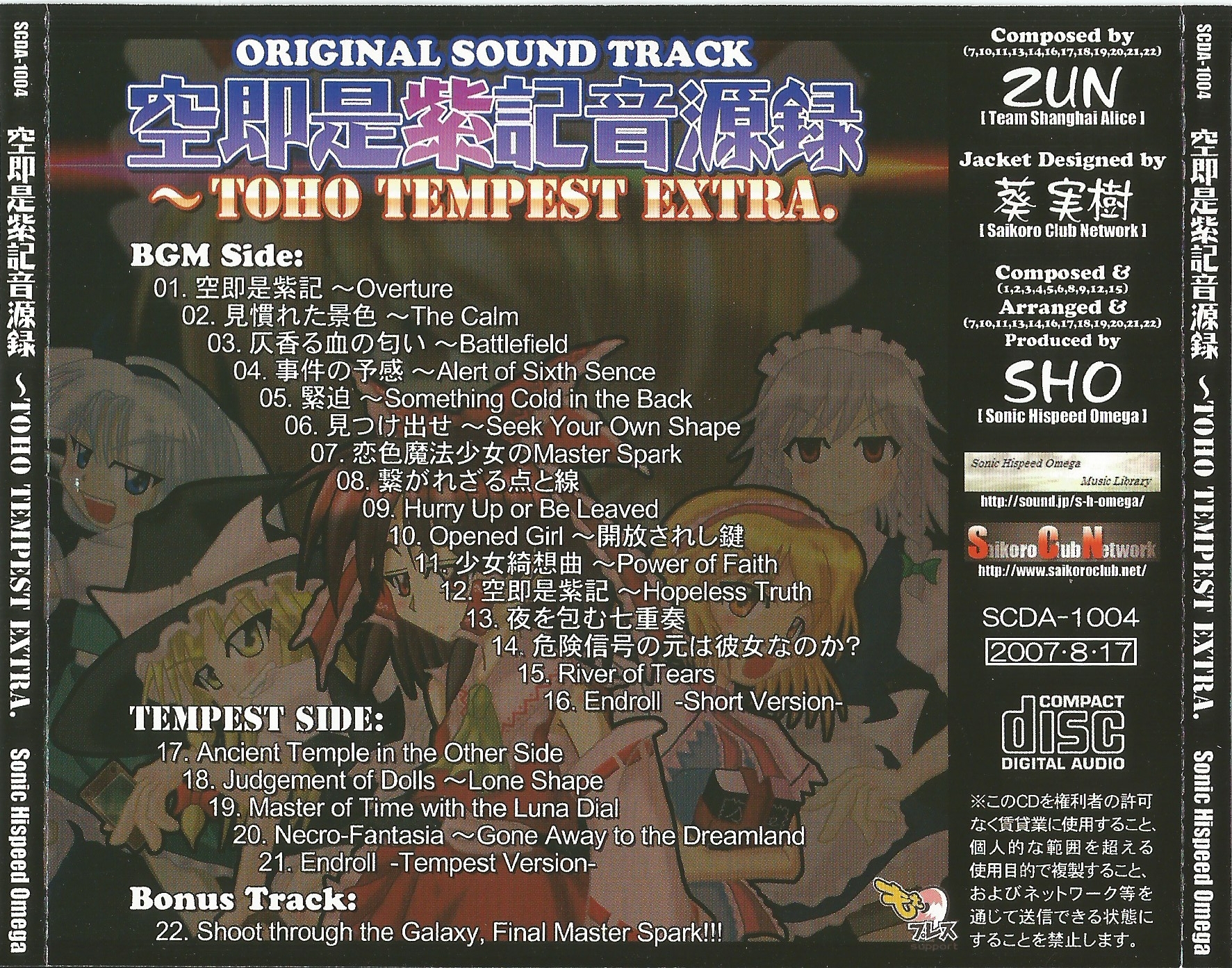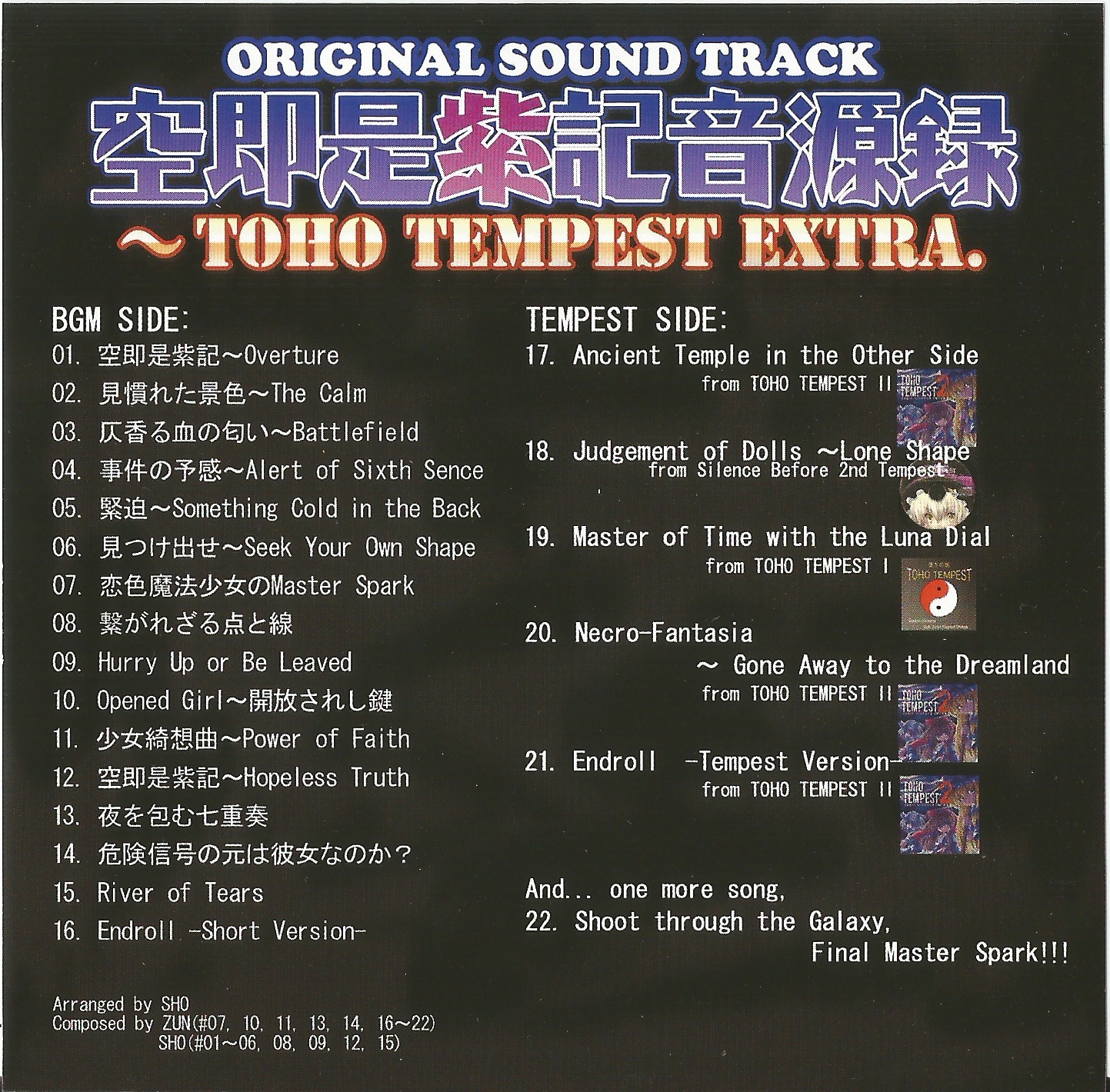 Comic Market 72 (C72) release. Contains the soundtrack to the "action sound novel game" Kuusokuzeshiki ~ Emptiness in the True Memory (tracks 1~16). Track 17 onwards is the TEMPEST Side.