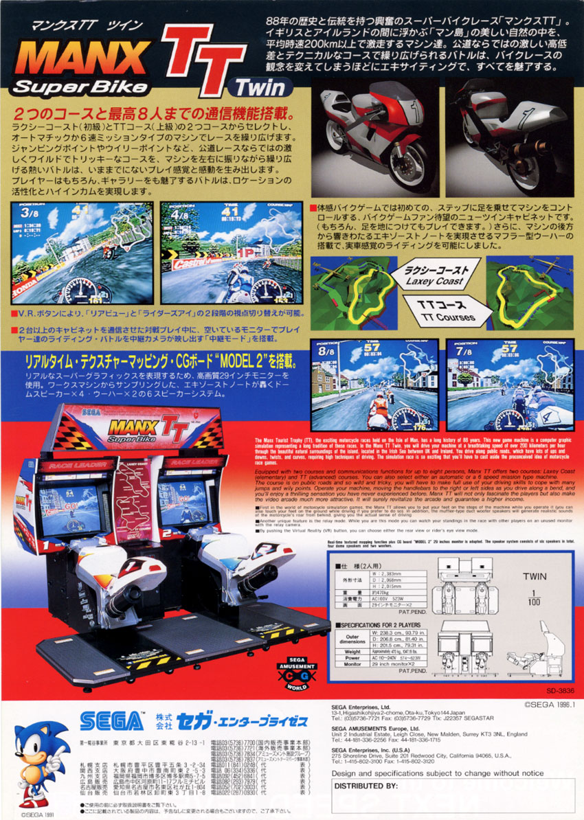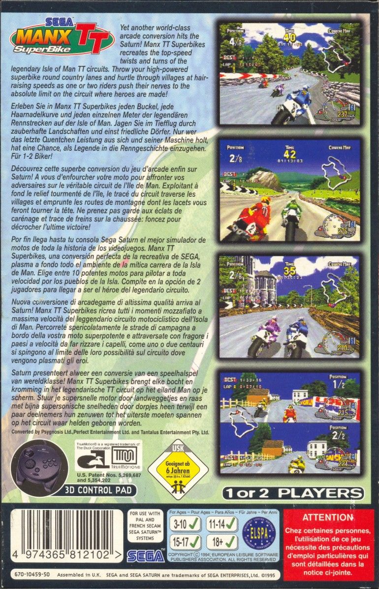Yet another world-class arcade conversion hits the Saturn! Manx TT Superbikes recreates the top-speed twists and turns of the legendary Isle of Man TT circuits.