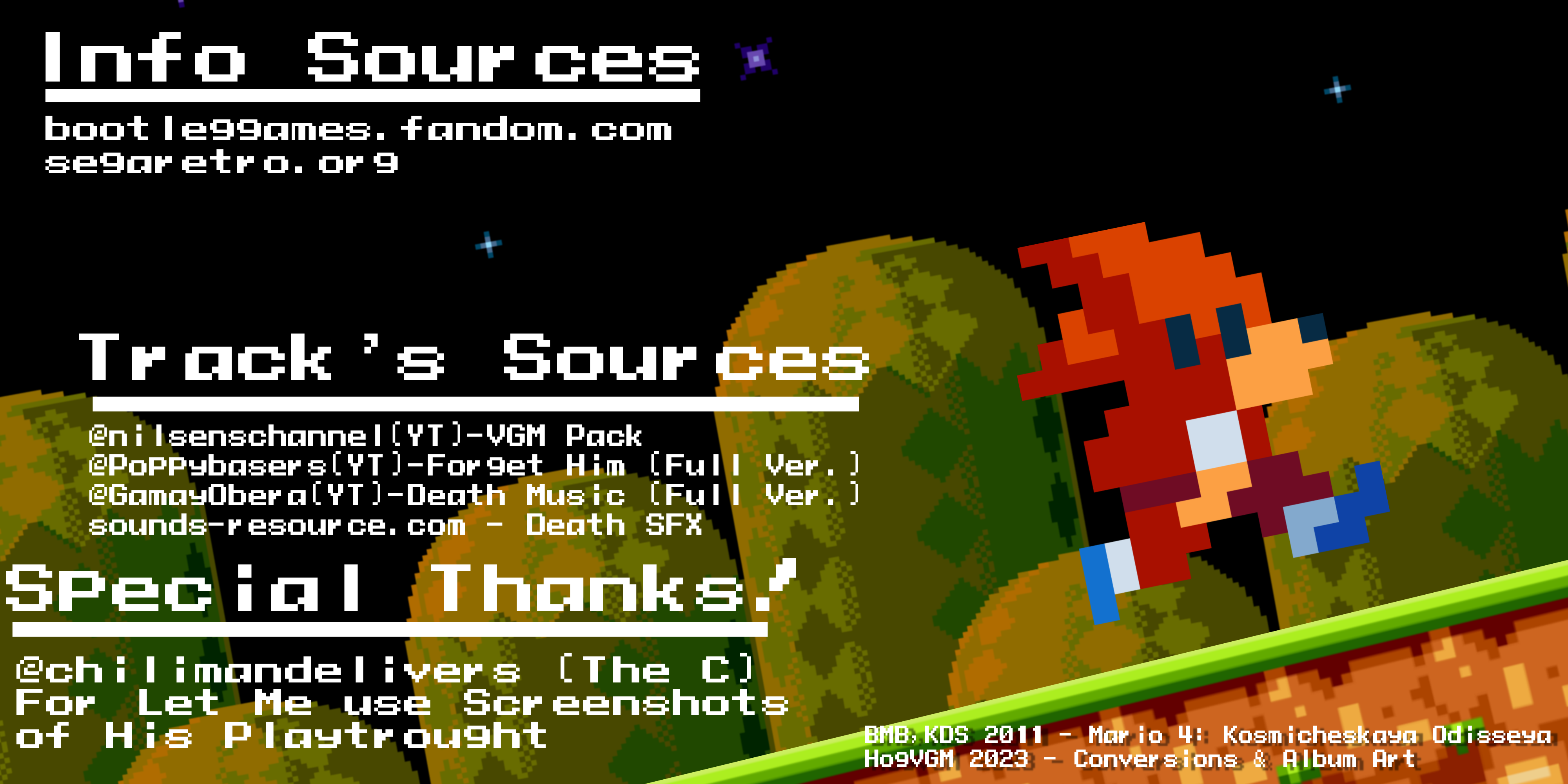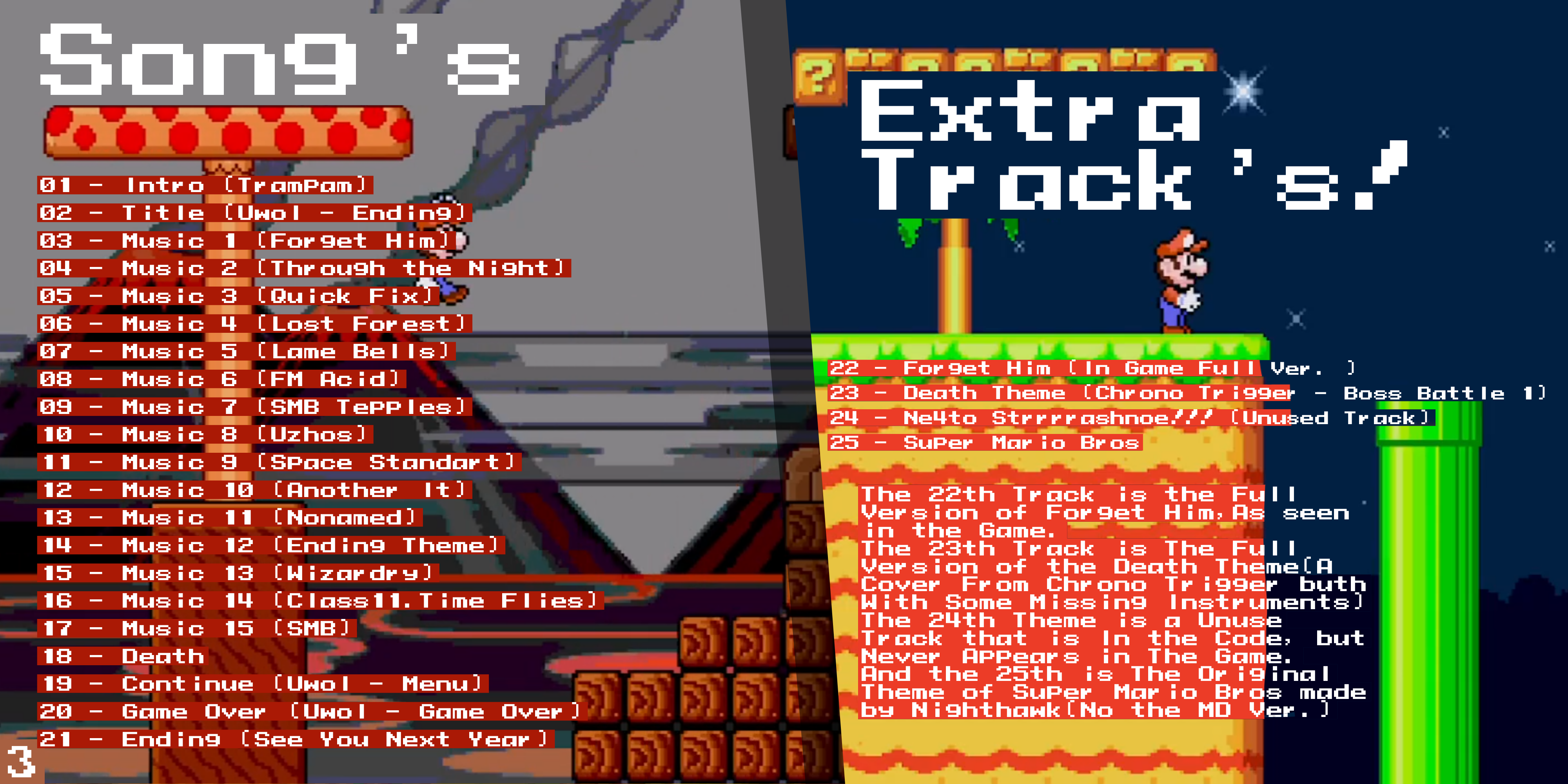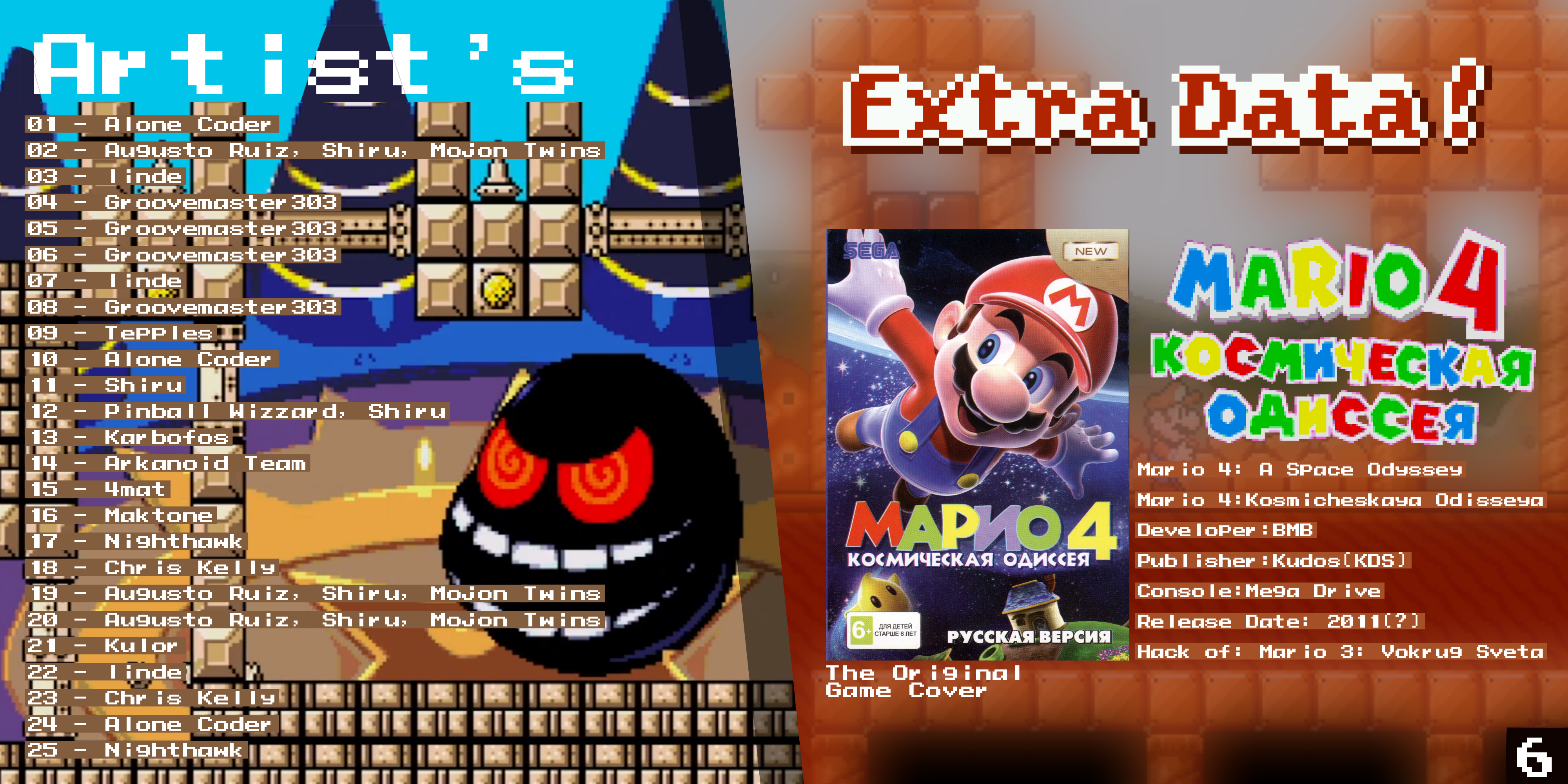 The Soundtrack of Mario 4: A Space Odyssey, the Sequel of Mario 3: Around the World, Developed by BMB, And Published by KDS in 2011, for the SEGA Mega Drive (Bootleg Game)