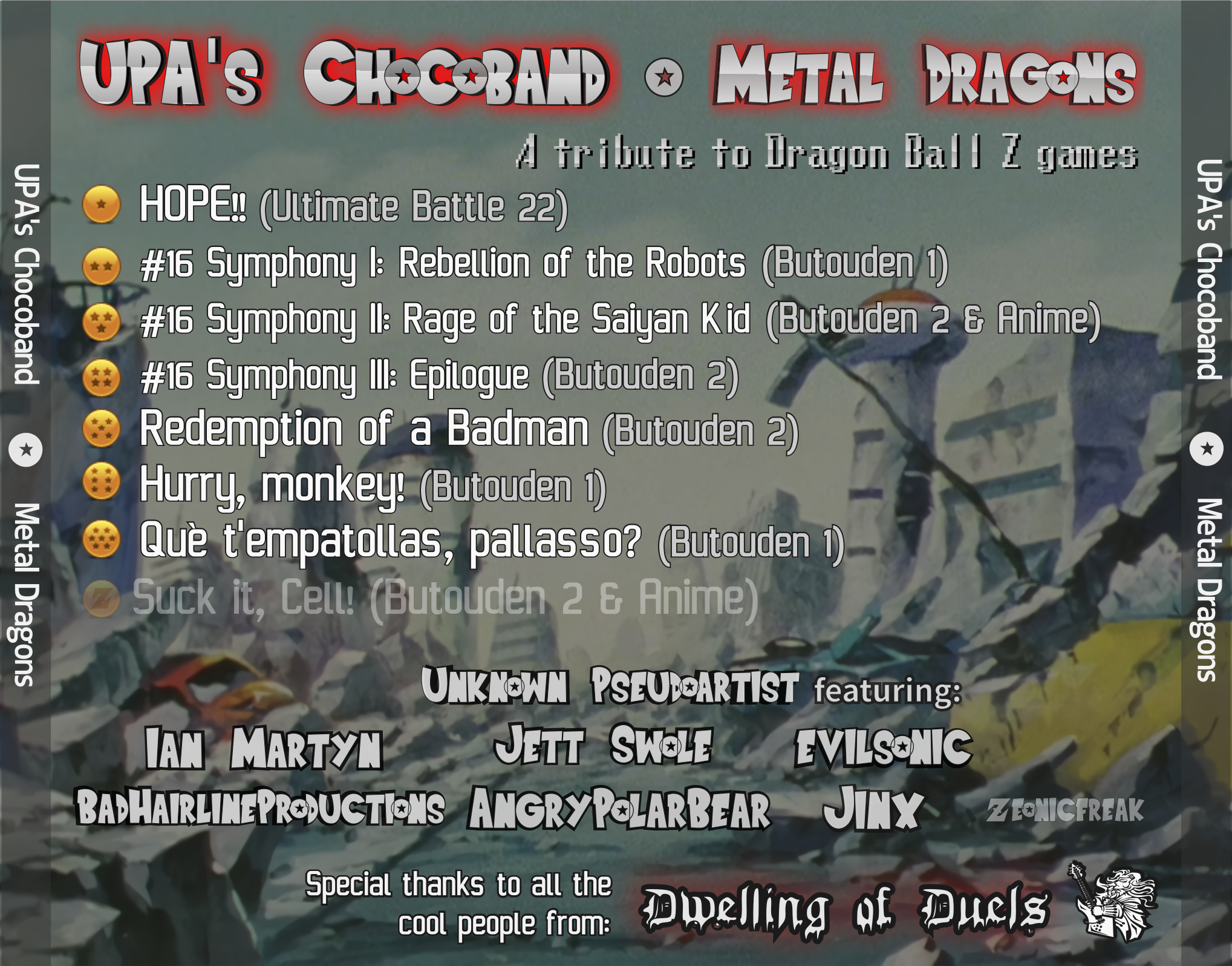 "Metal Dragons" is a small album with metal covers of some old Dragon Ball Z videogames like the Super Butouden saga (SNES) and Ultimate Battle 22 (PSX).
