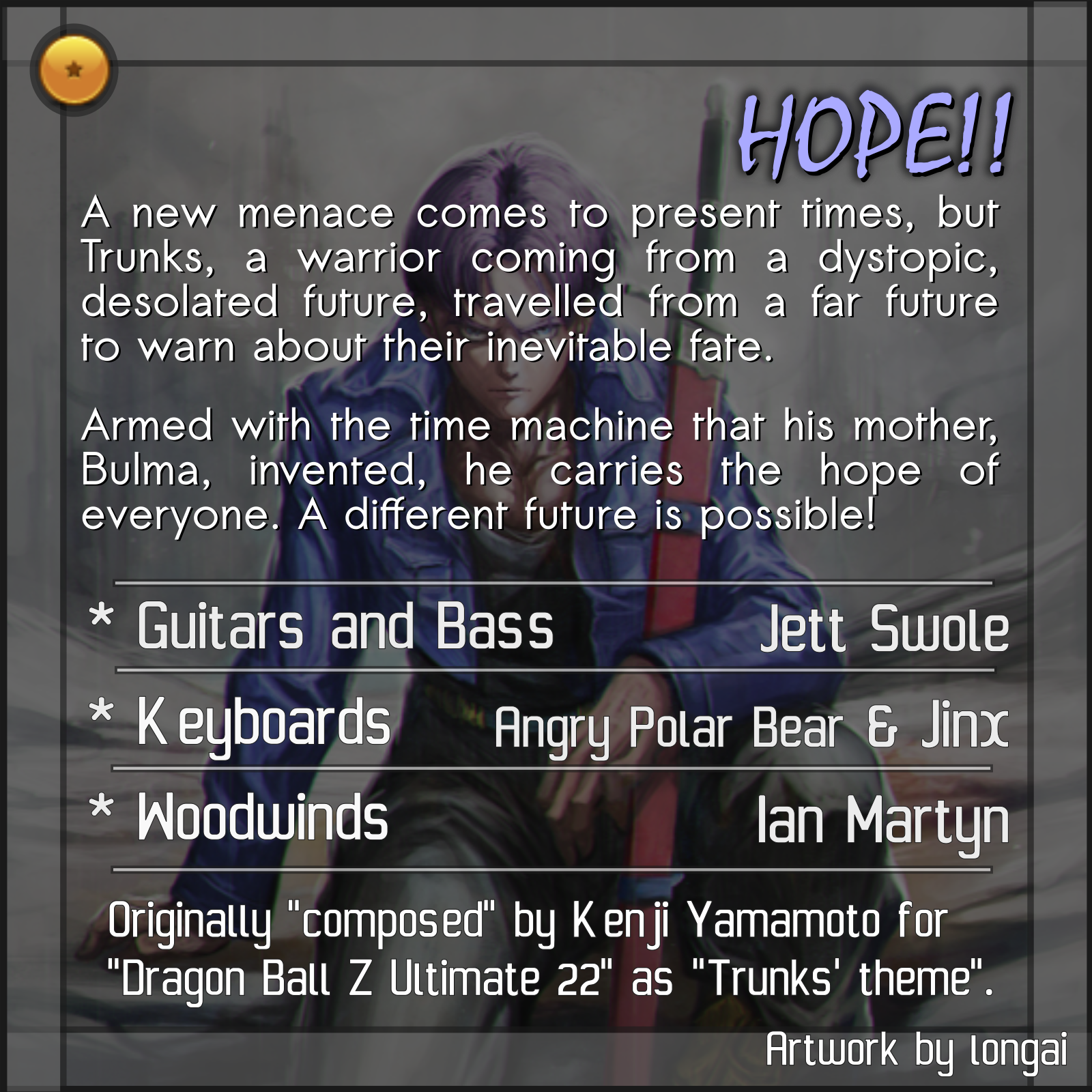 Originally "composed" by Kenji Yamamoto for "Dragon Ball Z Ultimate 22" as "Trunks' theme".