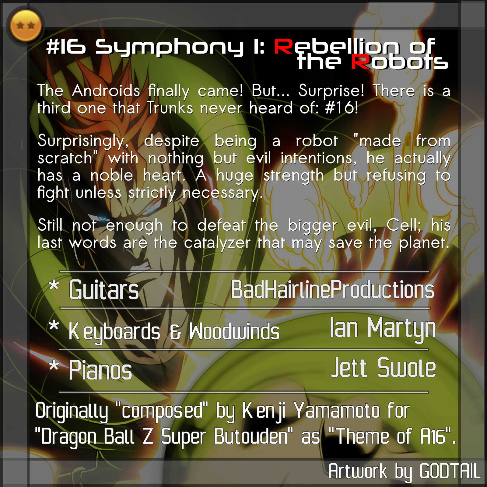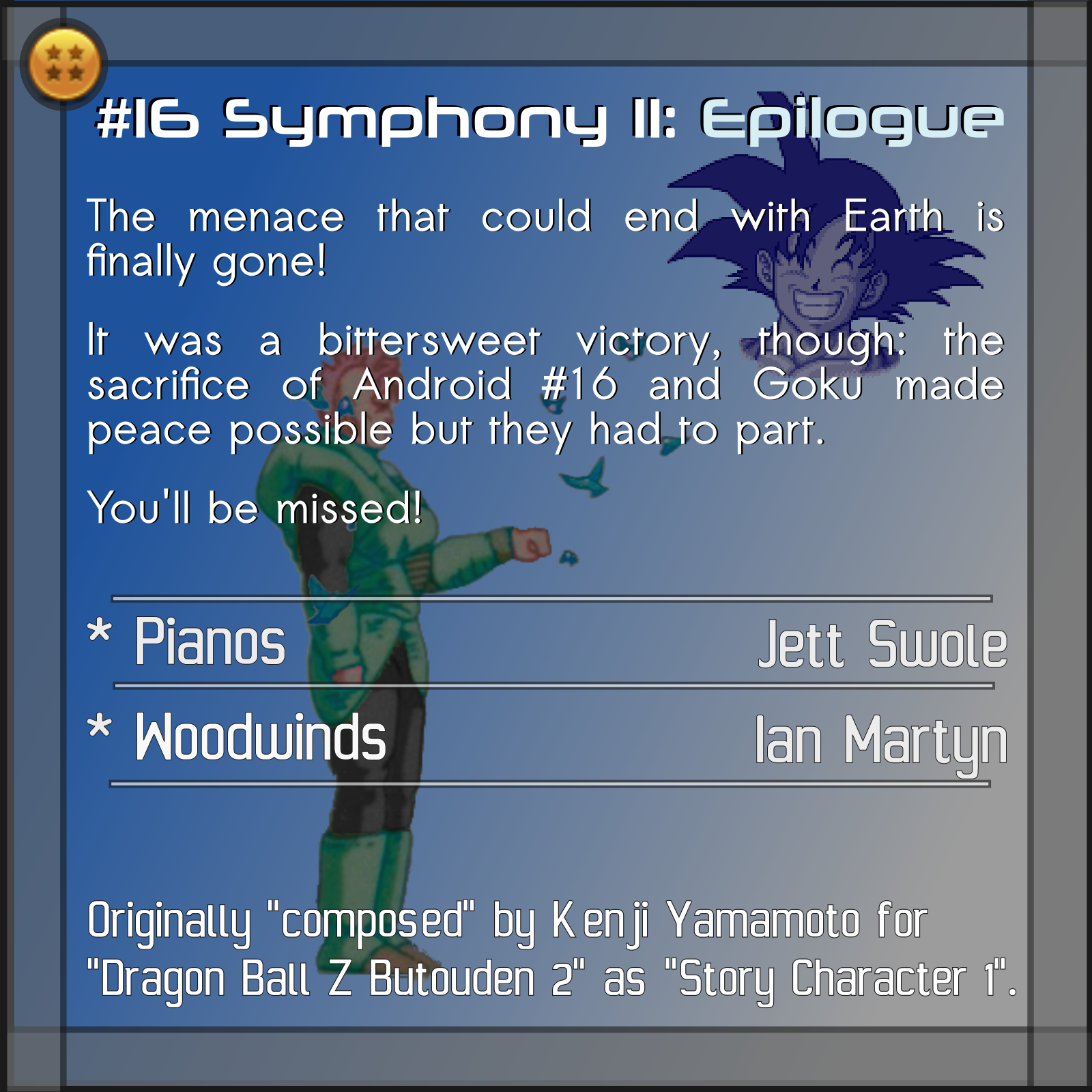 Originally "composed" by Kenji Yamamoto for "Dragon Ball Z Super Butouden" as "Theme of A16".