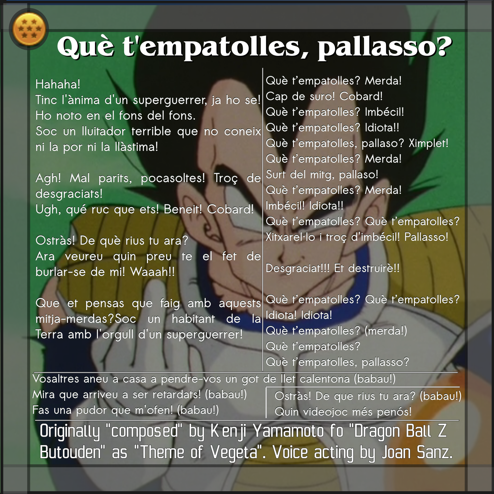 Originally "composed" by Kenji Yamamoto fo "Dragon Ball Z Butouden" as "Theme of Vegeta". Voice acting by Joan Sanz.