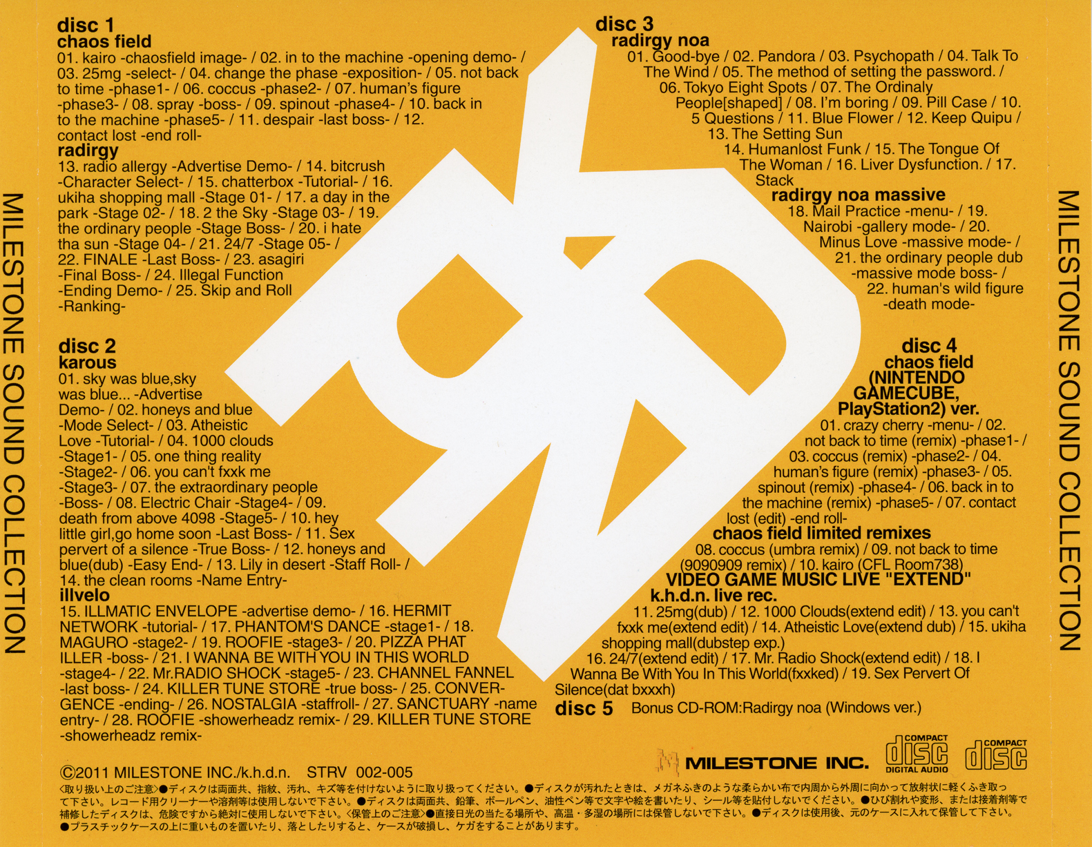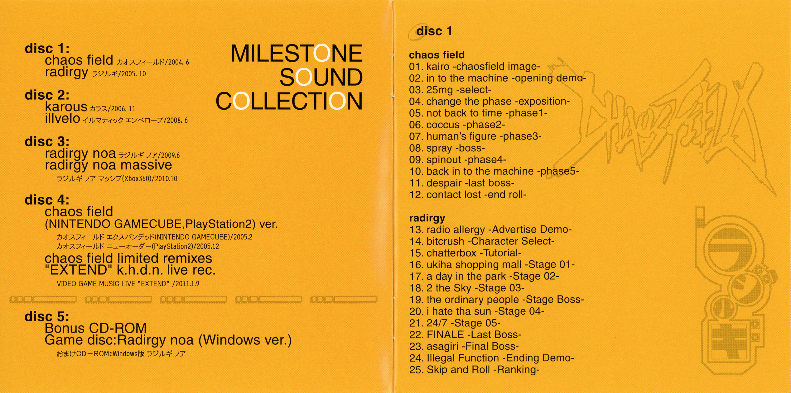 Includes remixes/extra songs from Chaosfield (GC/PS2), Radirgy (GC/PS2), and Radirgy Noa Massive (XBOX360)