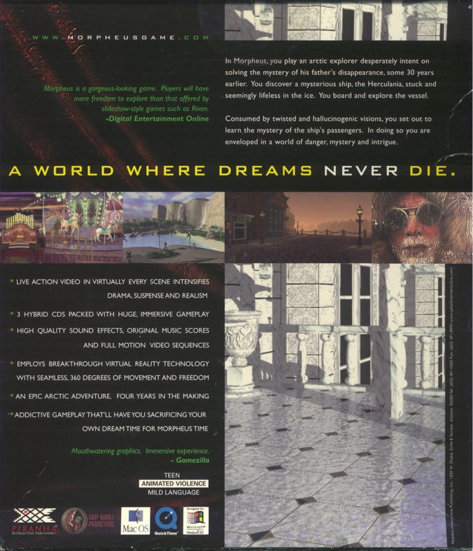 Morpheus takes place in the Arctic circle. You are an explorer, searching for your father, who disappeared thirty years ago while searching for the privately owned yacht, Herculania. You are confronted by ghosts from the past as you search the ship for clues to your father's disappearance, and the mysterious fate of all the passengers who boarded the Herculania. It's a world where dreams never die...even when the dreamer is long gone.