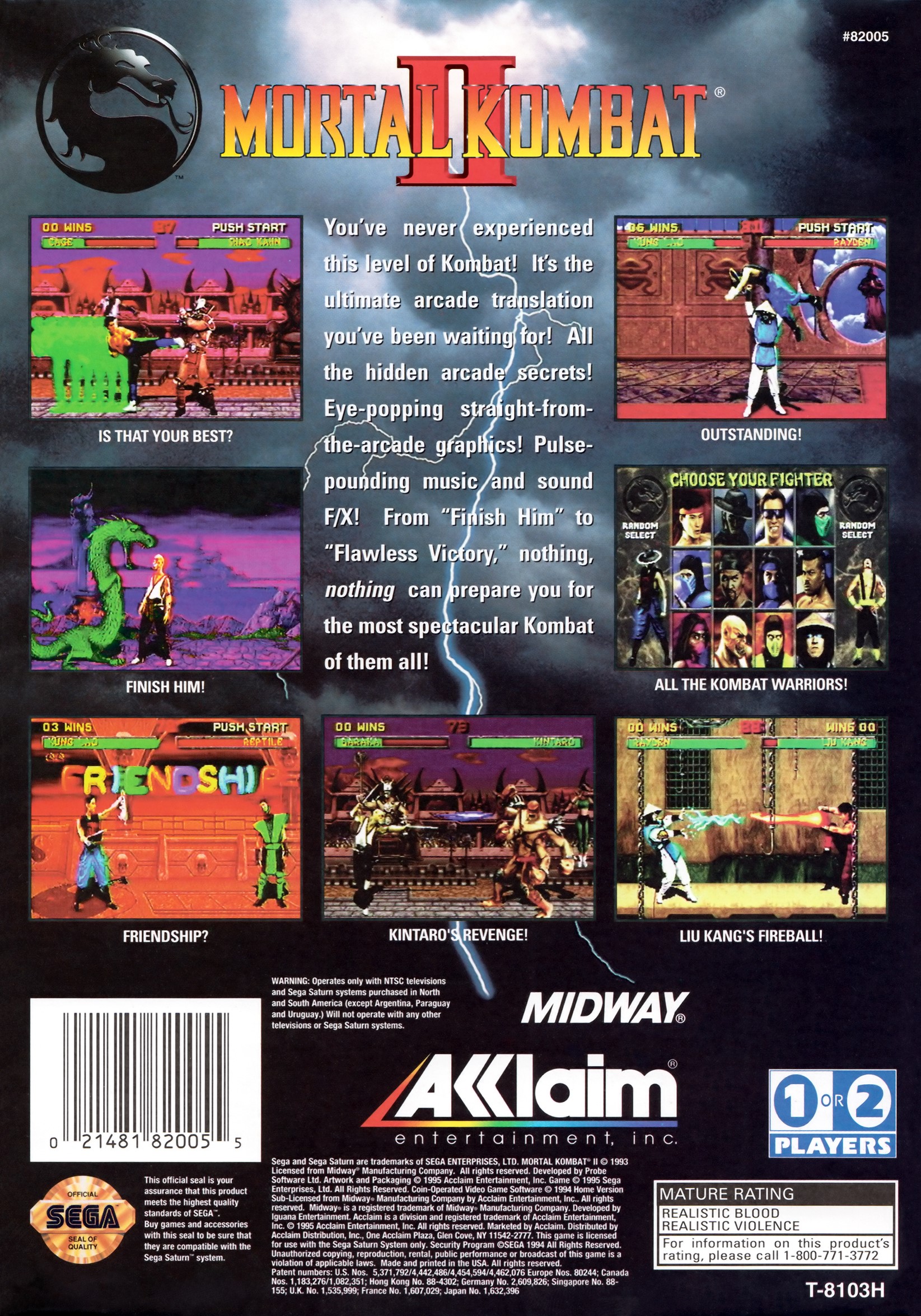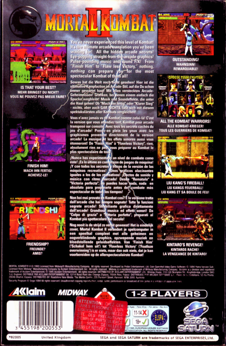 The Mortal Kombat fighters, plus several new ones, return for a tournament held by the evil Shang Tsung of the Outworld. The action is one-on-one as before, and famed for its high level of violence and blood (other than the sanitised Nintendo version). There are 5 difficulty levels and optional credits, as well as the usual two player mode including same character duels.
