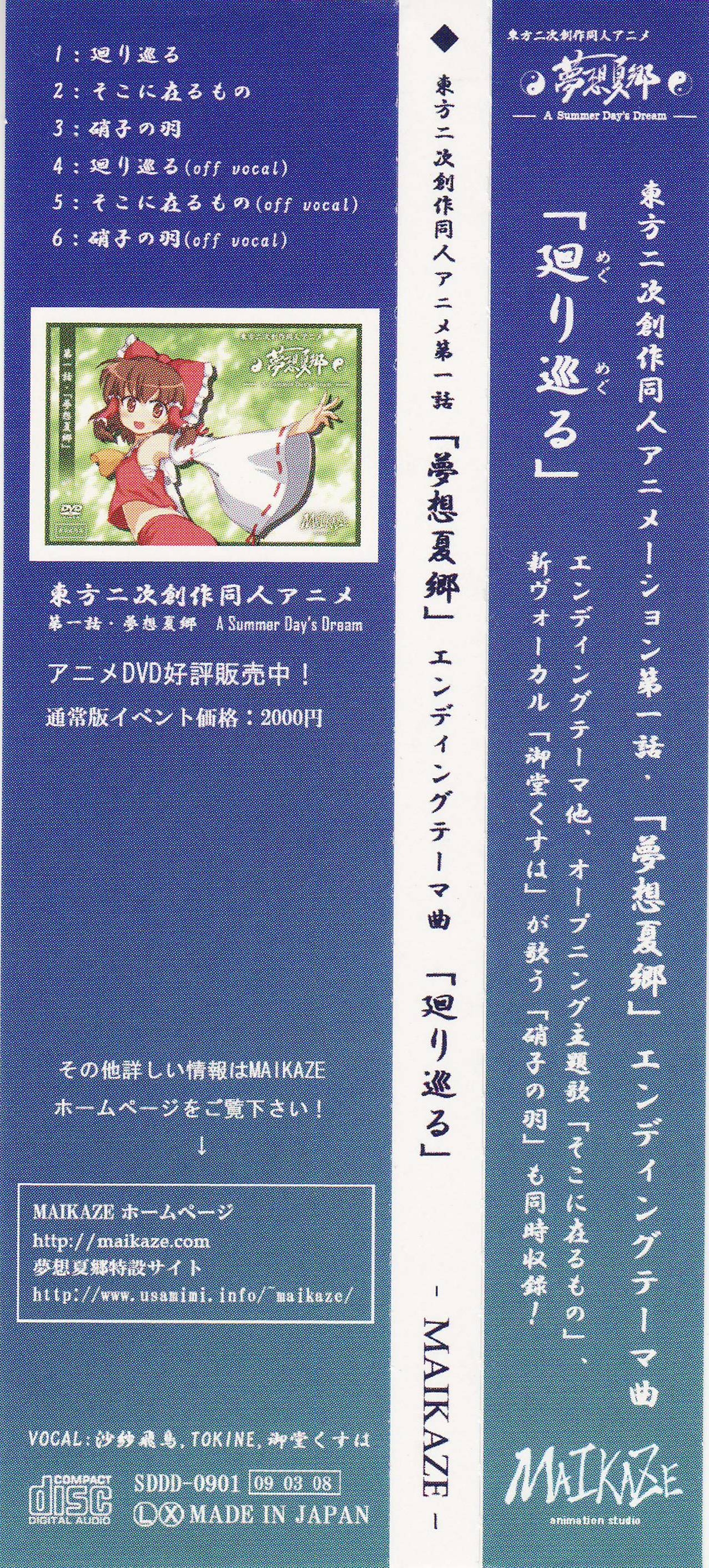 Reitaisai 6 release. Contains the ending and opening themes to MAIKAZE's doujin Touhou anime project, plus a new song by Kusuha Mido.