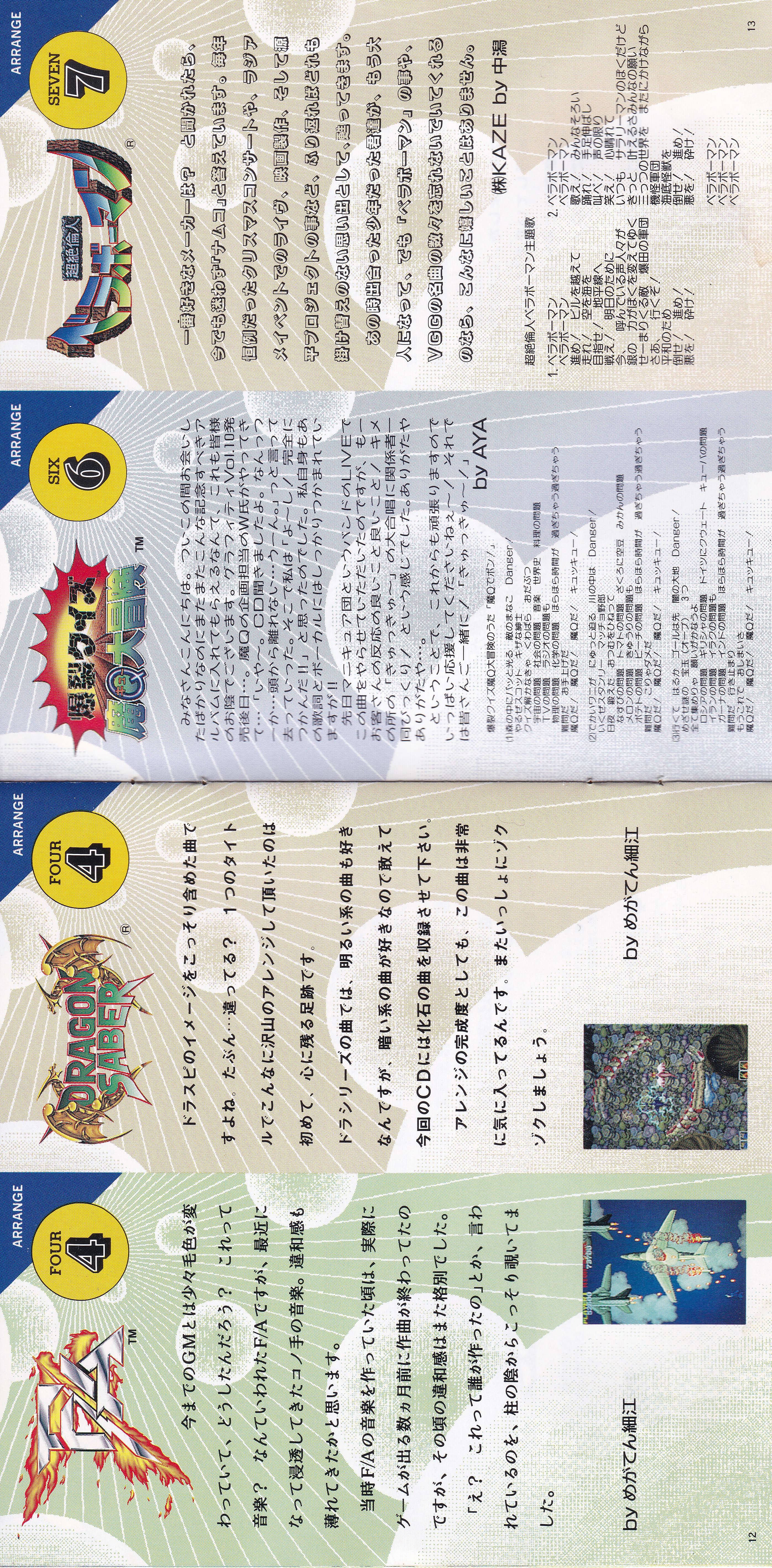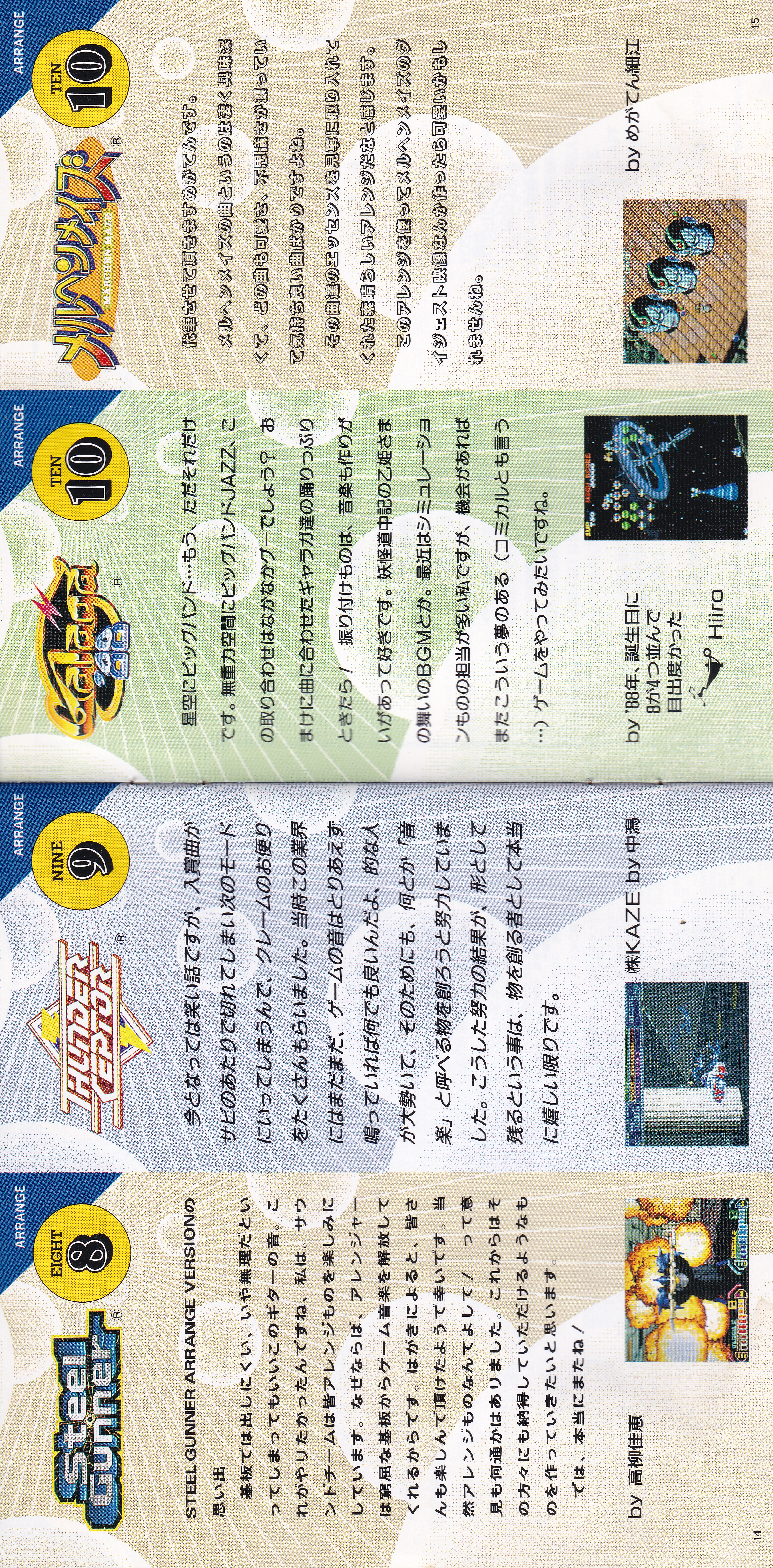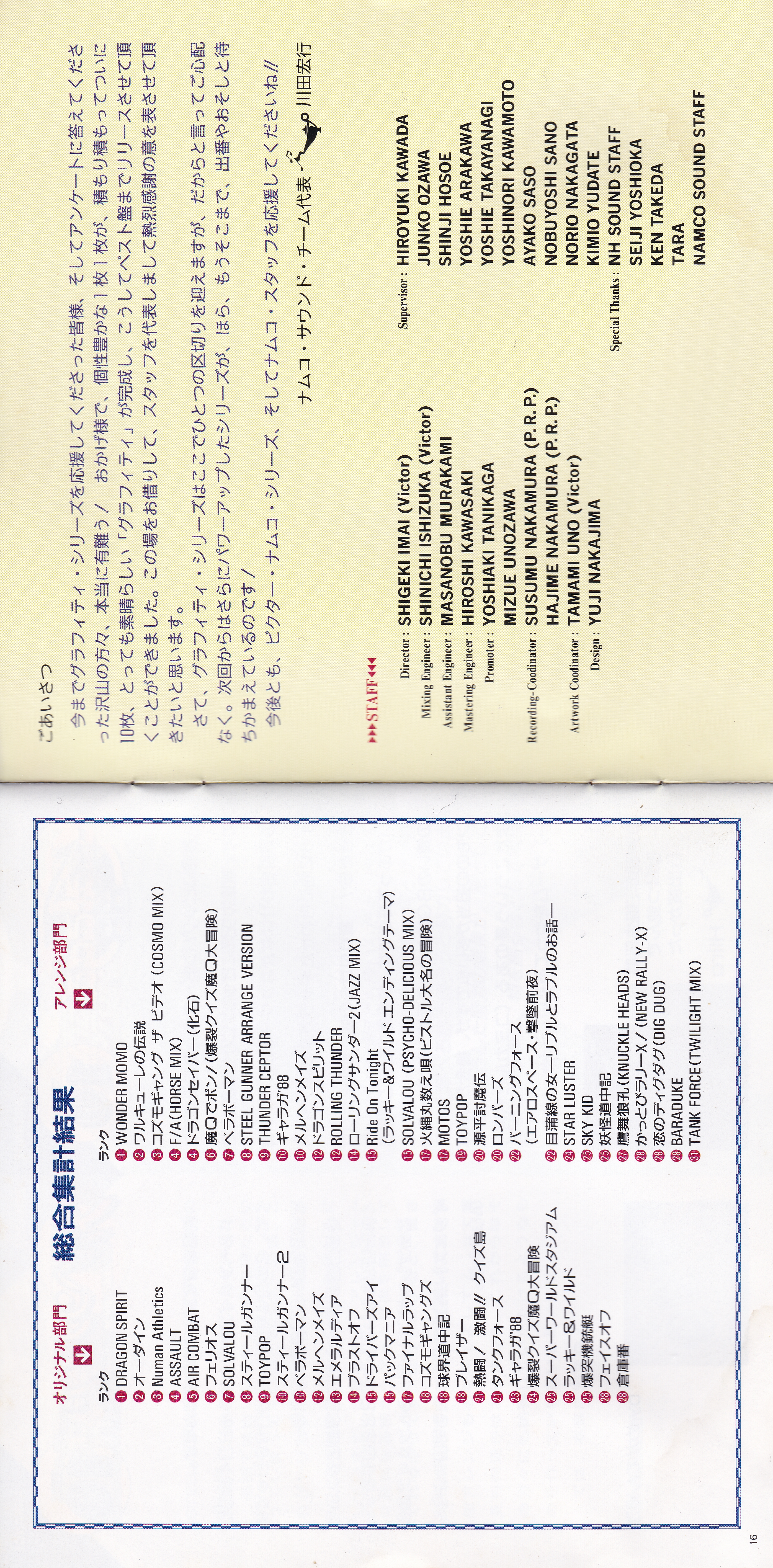 Liner Notes: MEGATEN Hosoe (pg. 3, 4, 5, 12, 15), sanodg (pg. 4), Hiiro (pg. 5, 6, 11, 15), Kawagen (pg. 6), Yoshie Takayanagi (pg. 7, 8, 14), ZUN (pg. 7), KAZE by Nakagata (pg. 8, 13, 14), Kimio Yudate (pg. 10), Strong Yoshie (pg. 11), AYA (pg. 13), Hiroyuki Kawada (Namco Sound Team Representative) (pg. 17)
