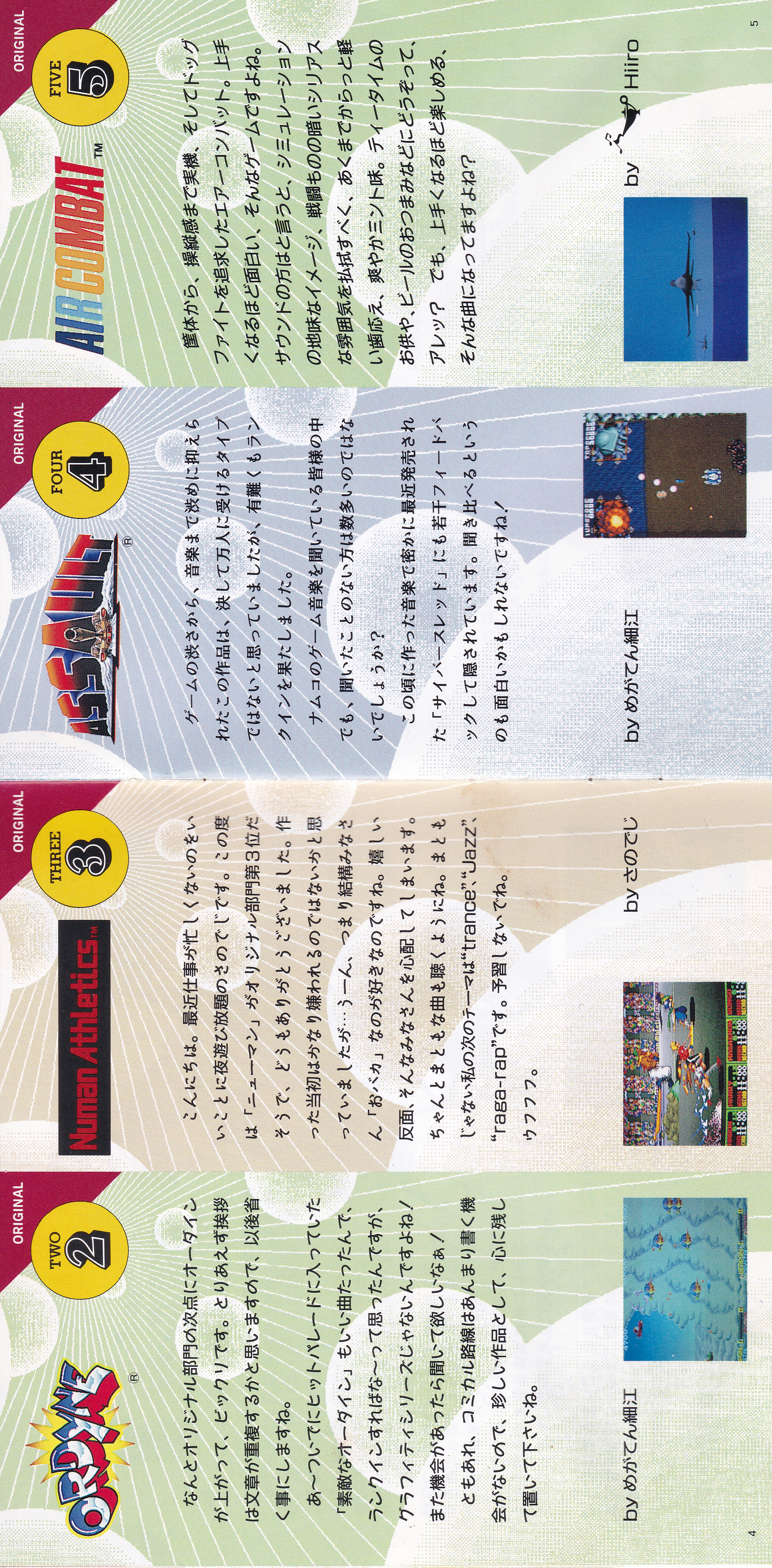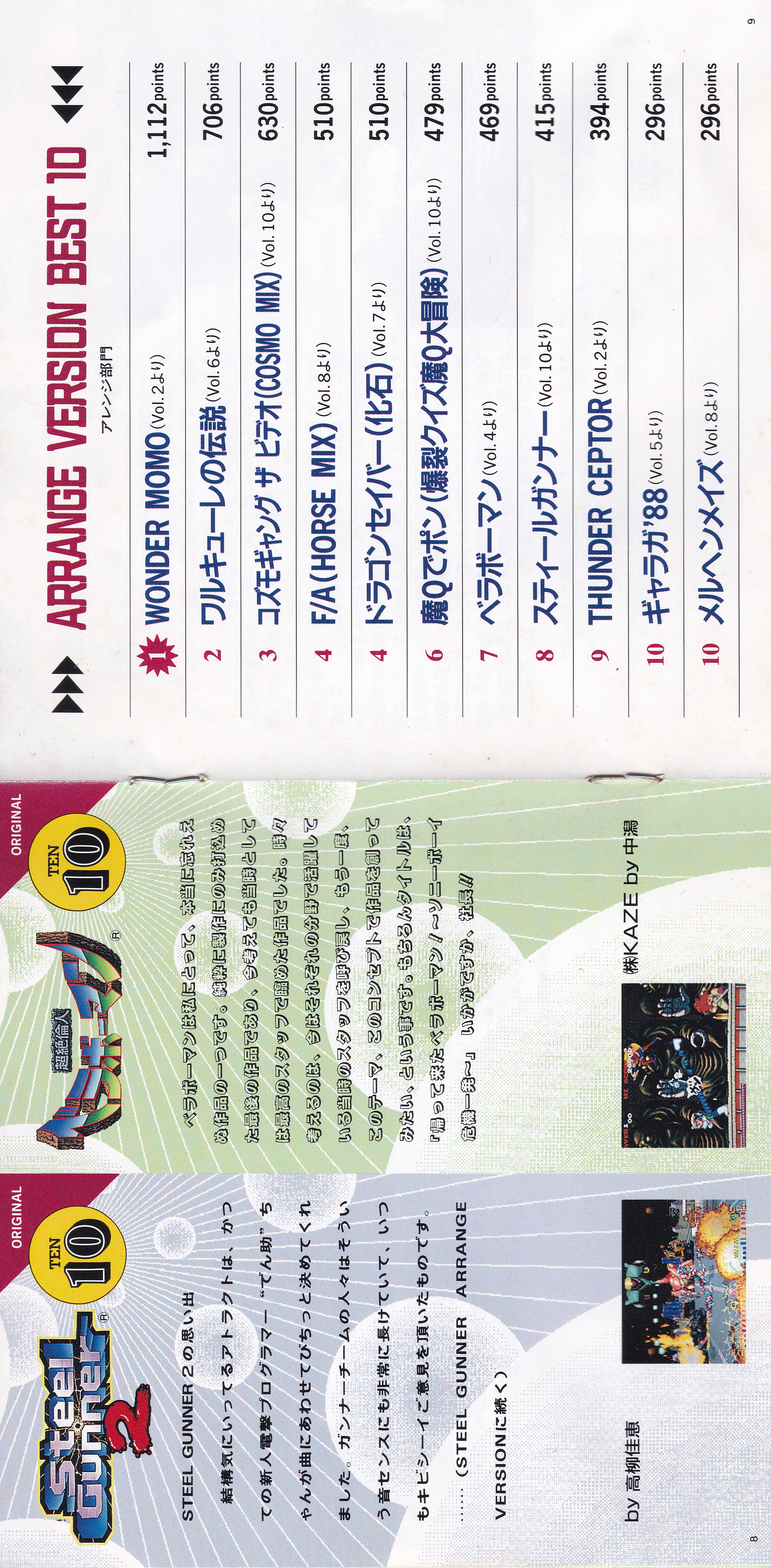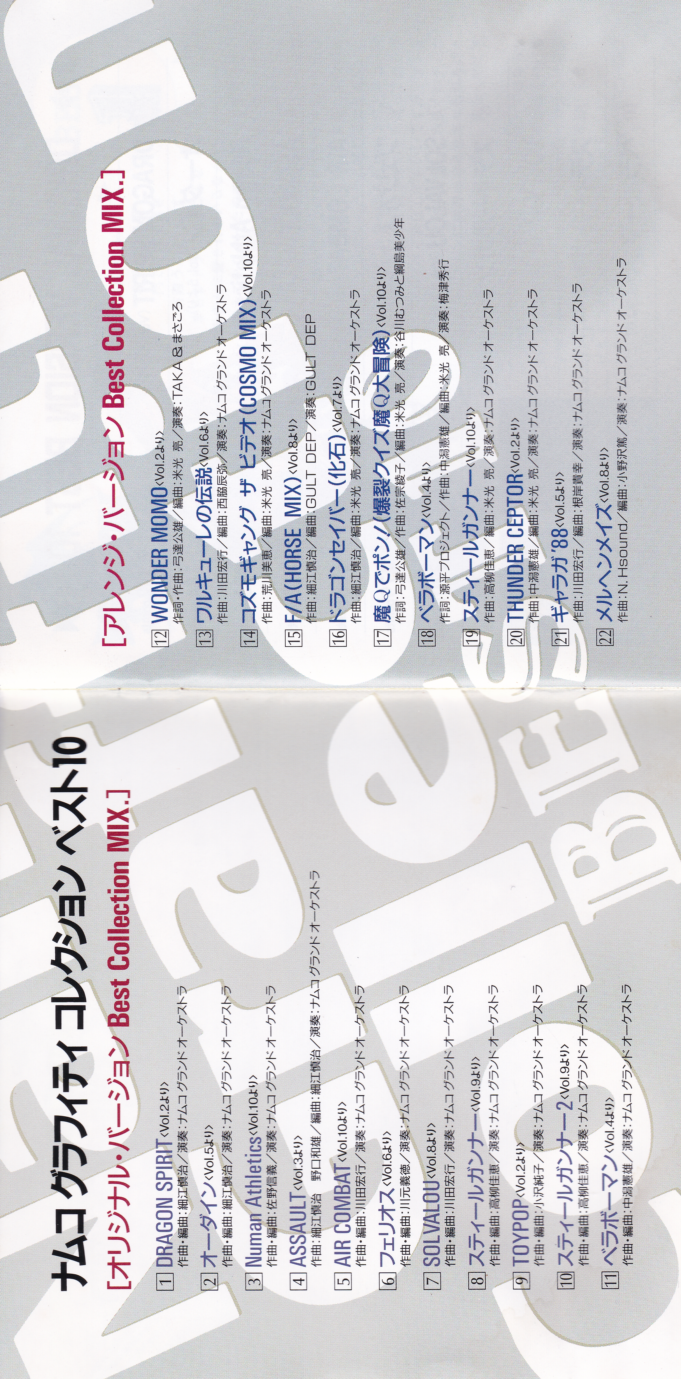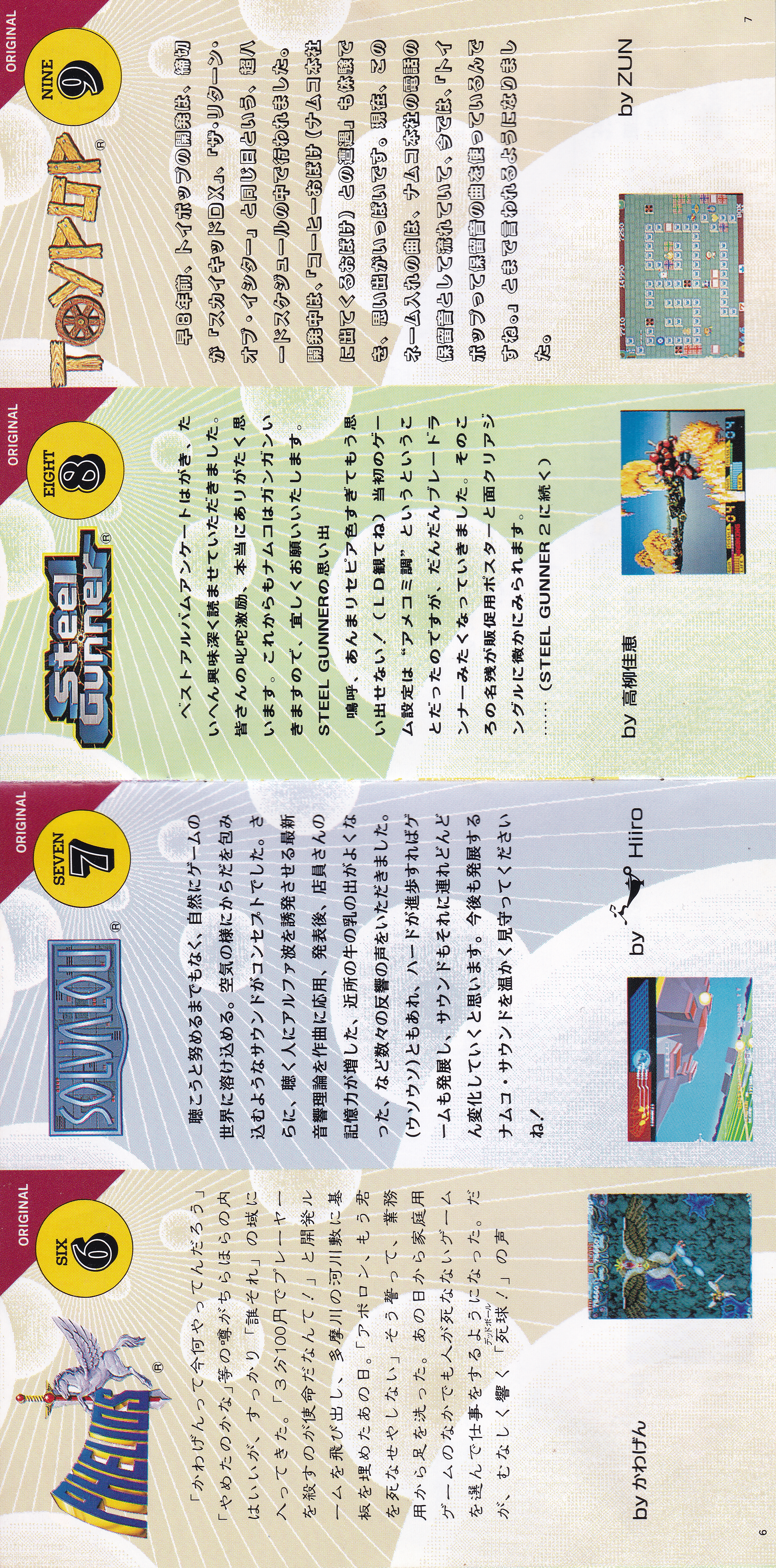 Liner Notes: MEGATEN Hosoe (pg. 3, 4, 5, 12, 15), sanodg (pg. 4), Hiiro (pg. 5, 6, 11, 15), Kawagen (pg. 6), Yoshie Takayanagi (pg. 7, 8, 14), ZUN (pg. 7), KAZE by Nakagata (pg. 8, 13, 14), Kimio Yudate (pg. 10), Strong Yoshie (pg. 11), AYA (pg. 13), Hiroyuki Kawada (Namco Sound Team Representative) (pg. 17)