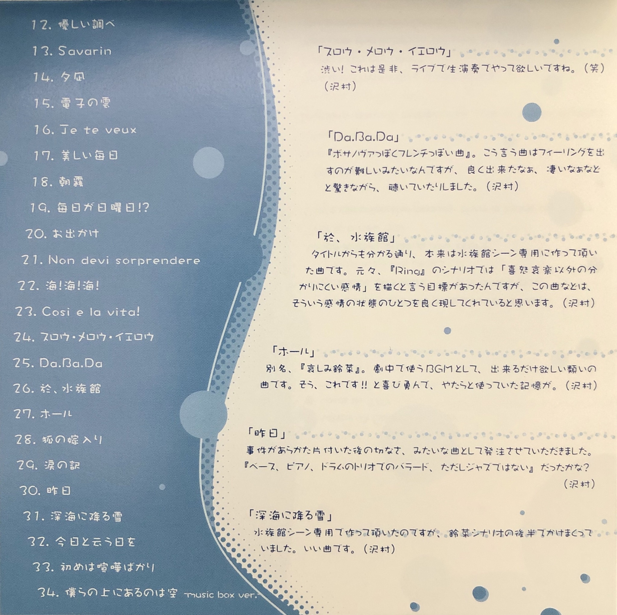 Tracks 3 and 9 on disc 1 are erroneously interchanged on the printed tracklist. Track 9 is the version with Japanese lyrics.