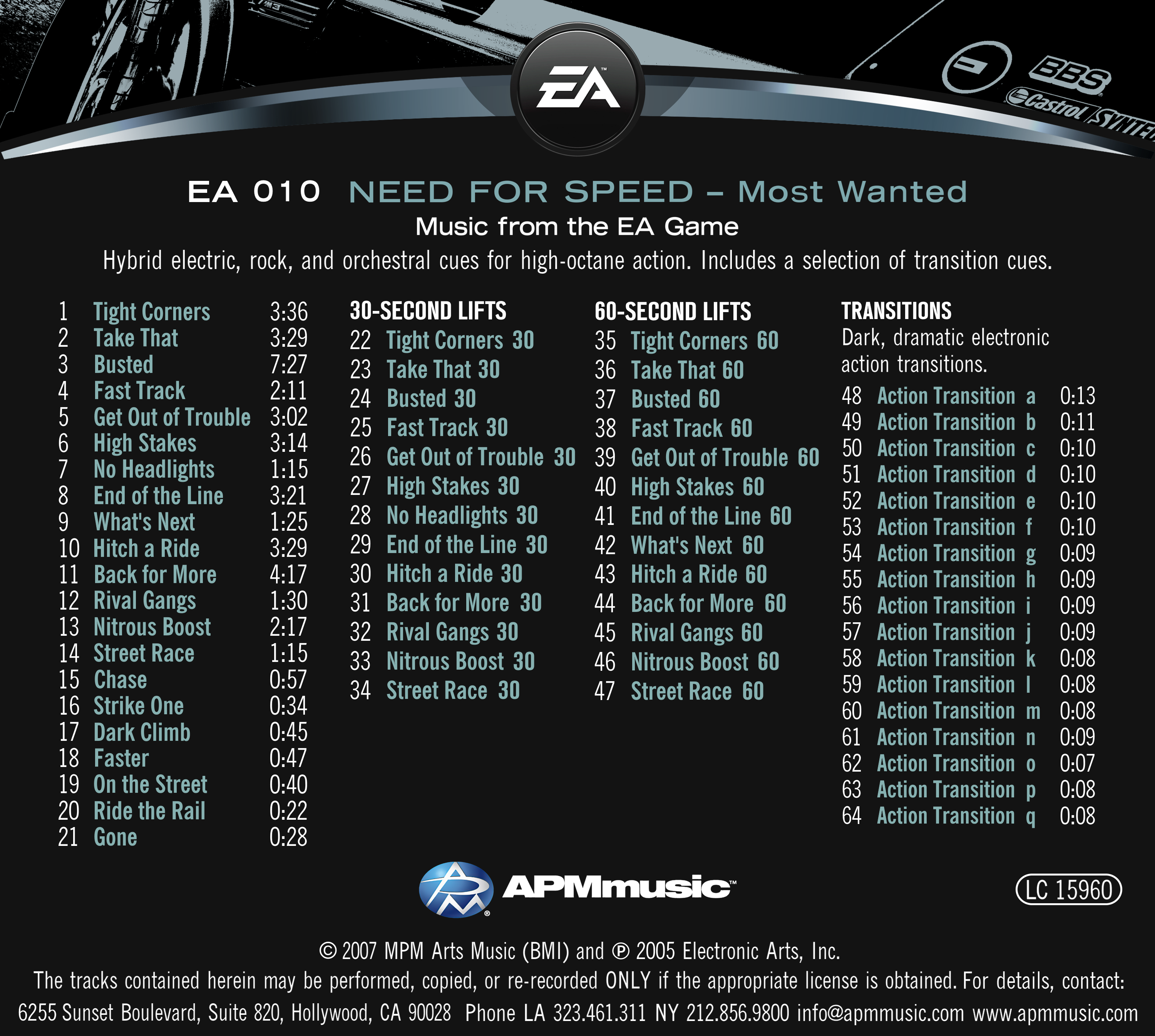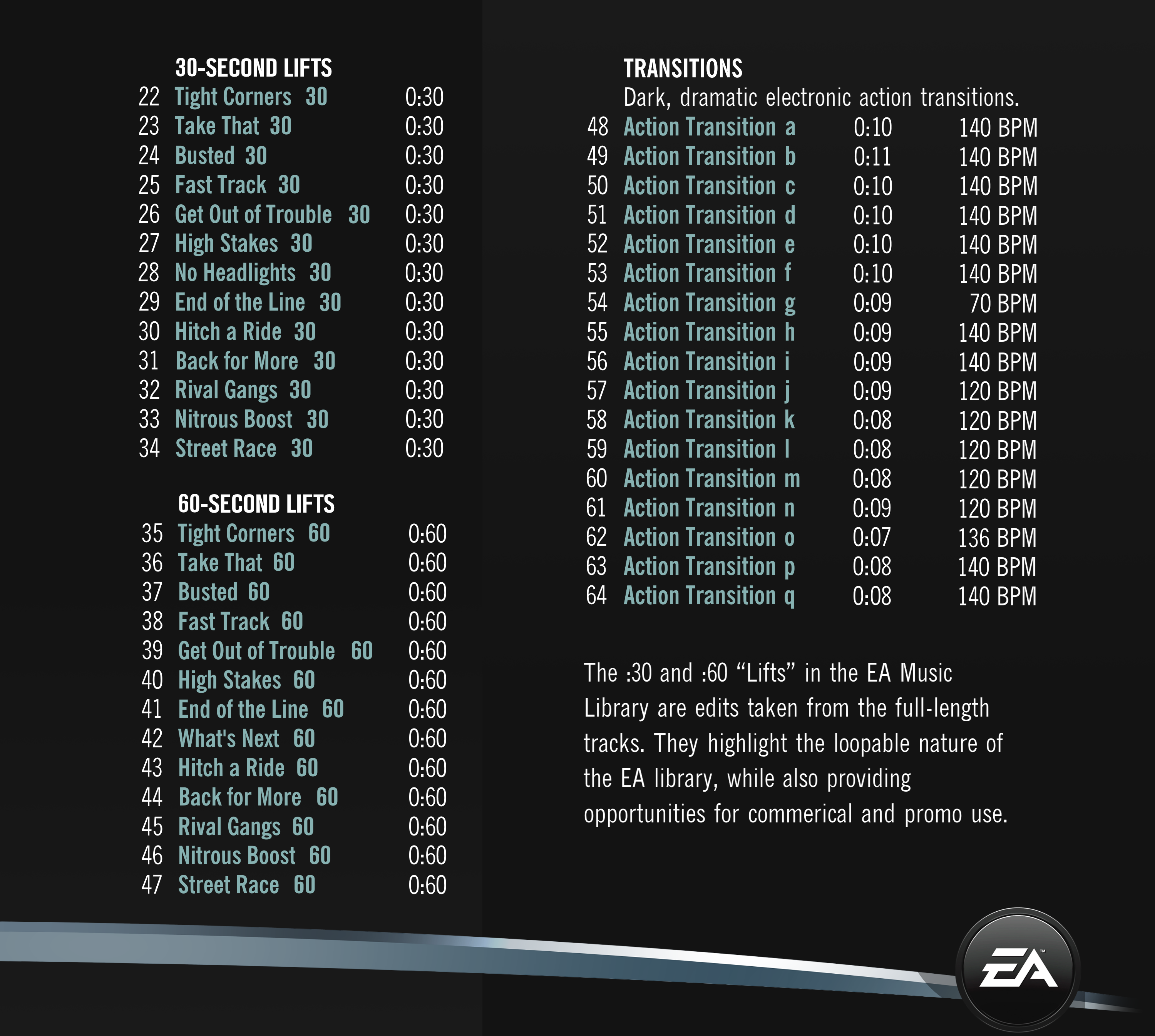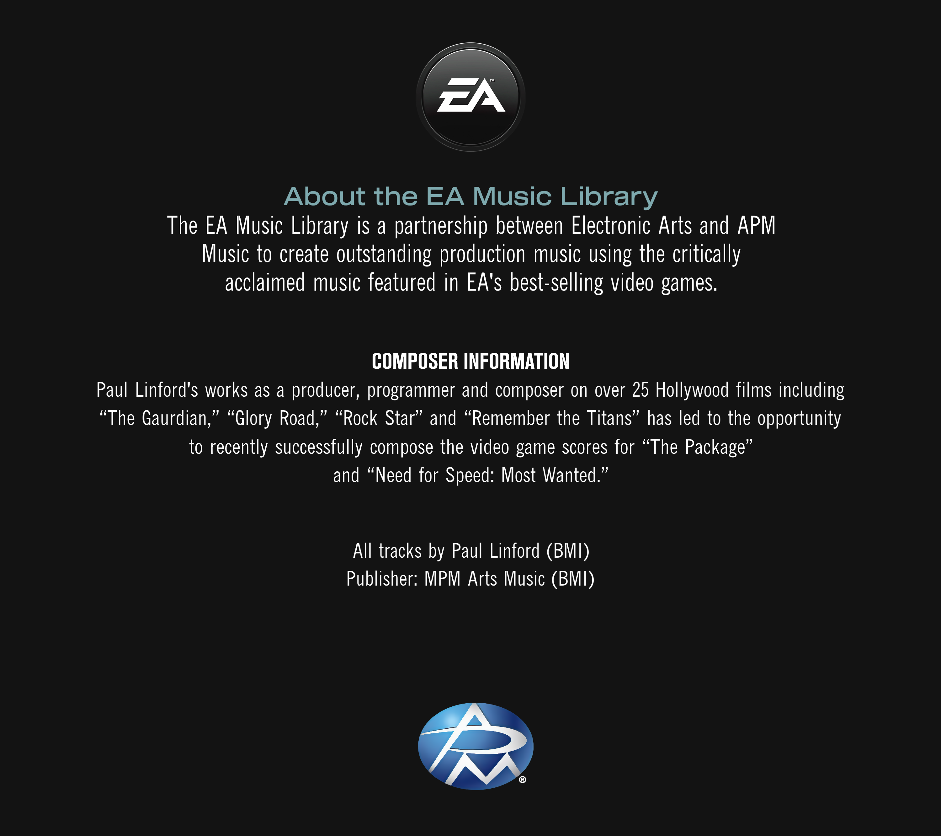 The EA Music Library is a partnership between Electronic Arts and APM Music to create outstanding production music using the critically acclaimed music featured in EA's best-selling video games.