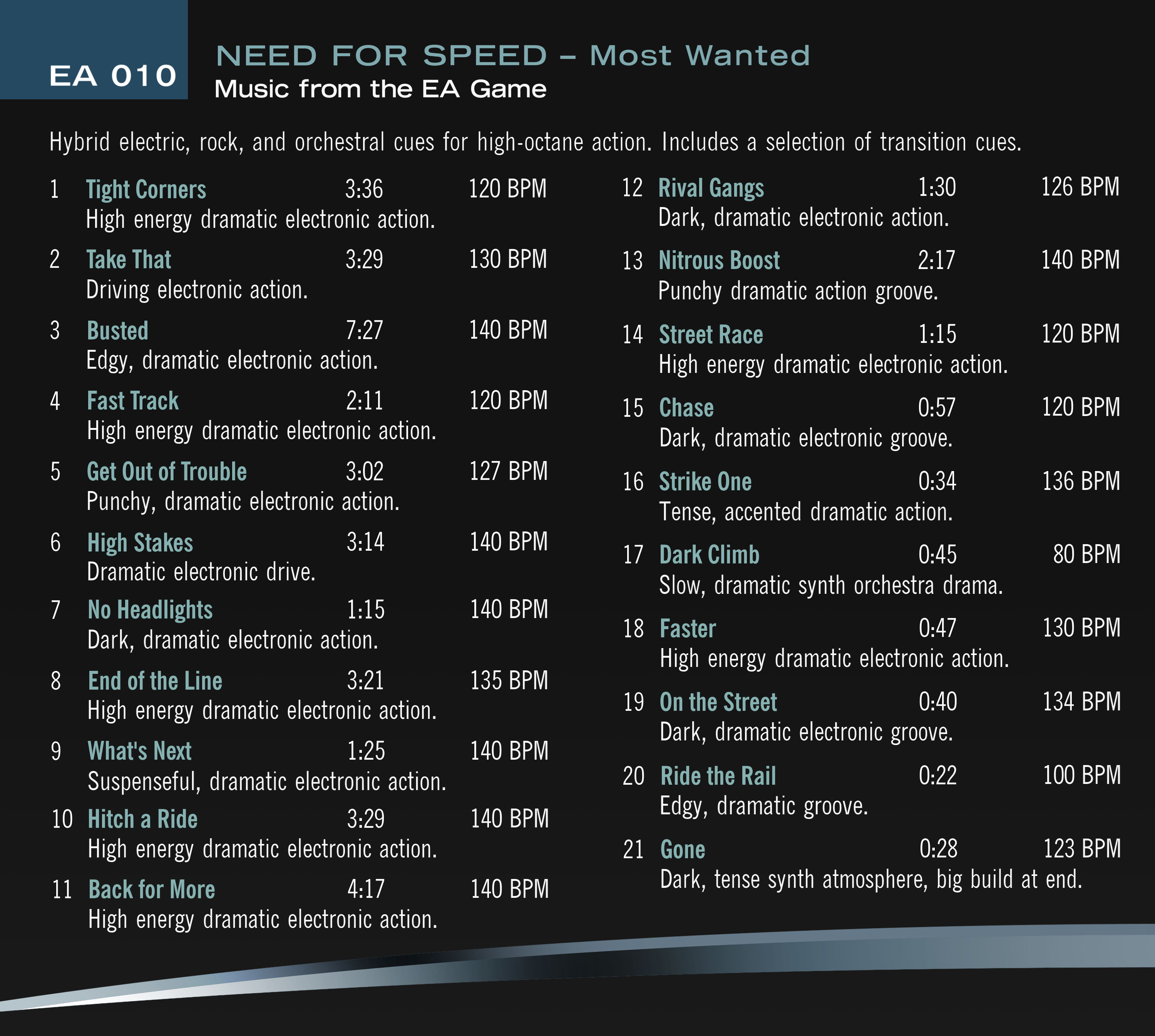 "Hybrid electric, rock, and orchestral cues for high-octane action. Includes a selection of transition cues."