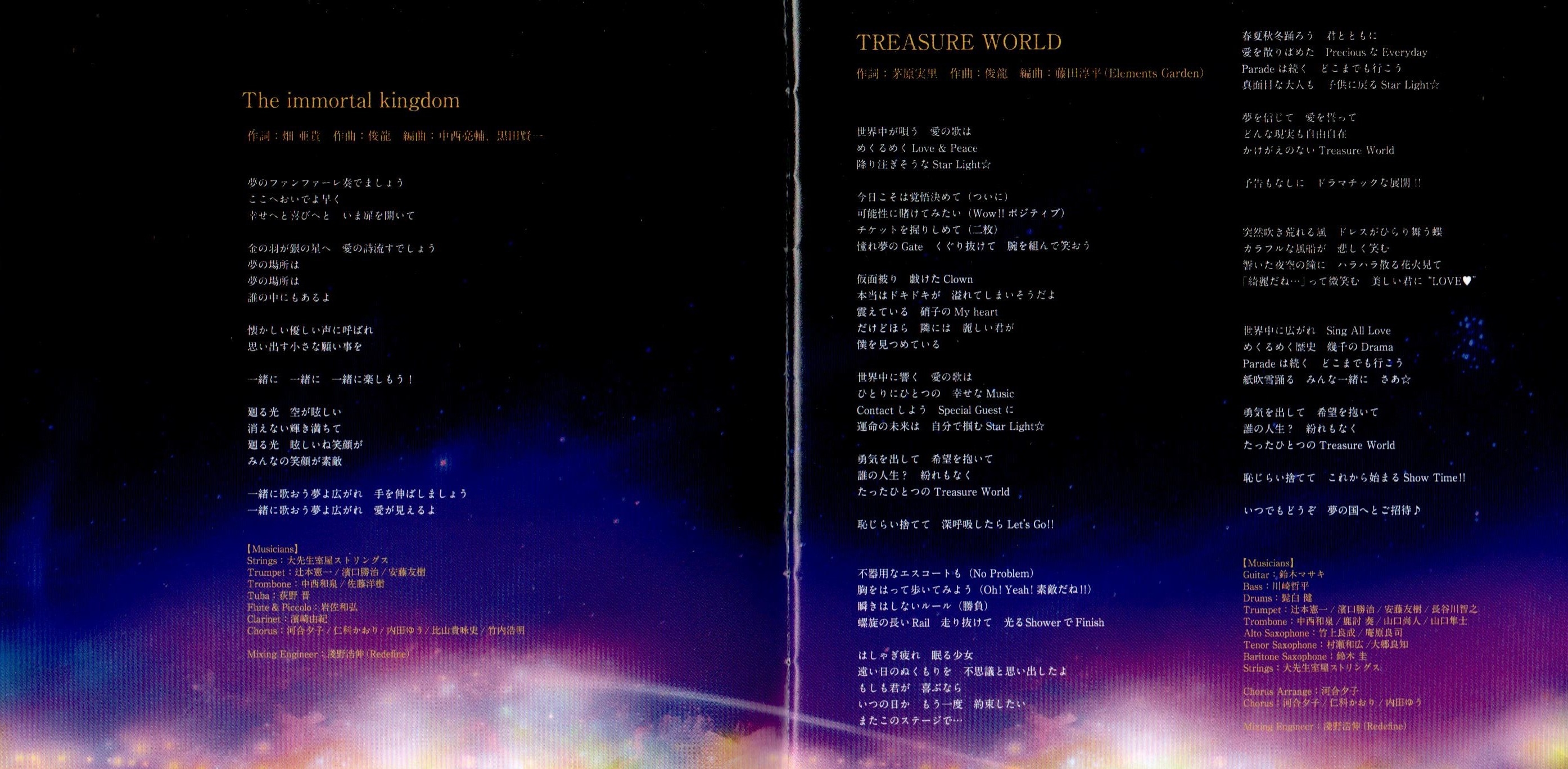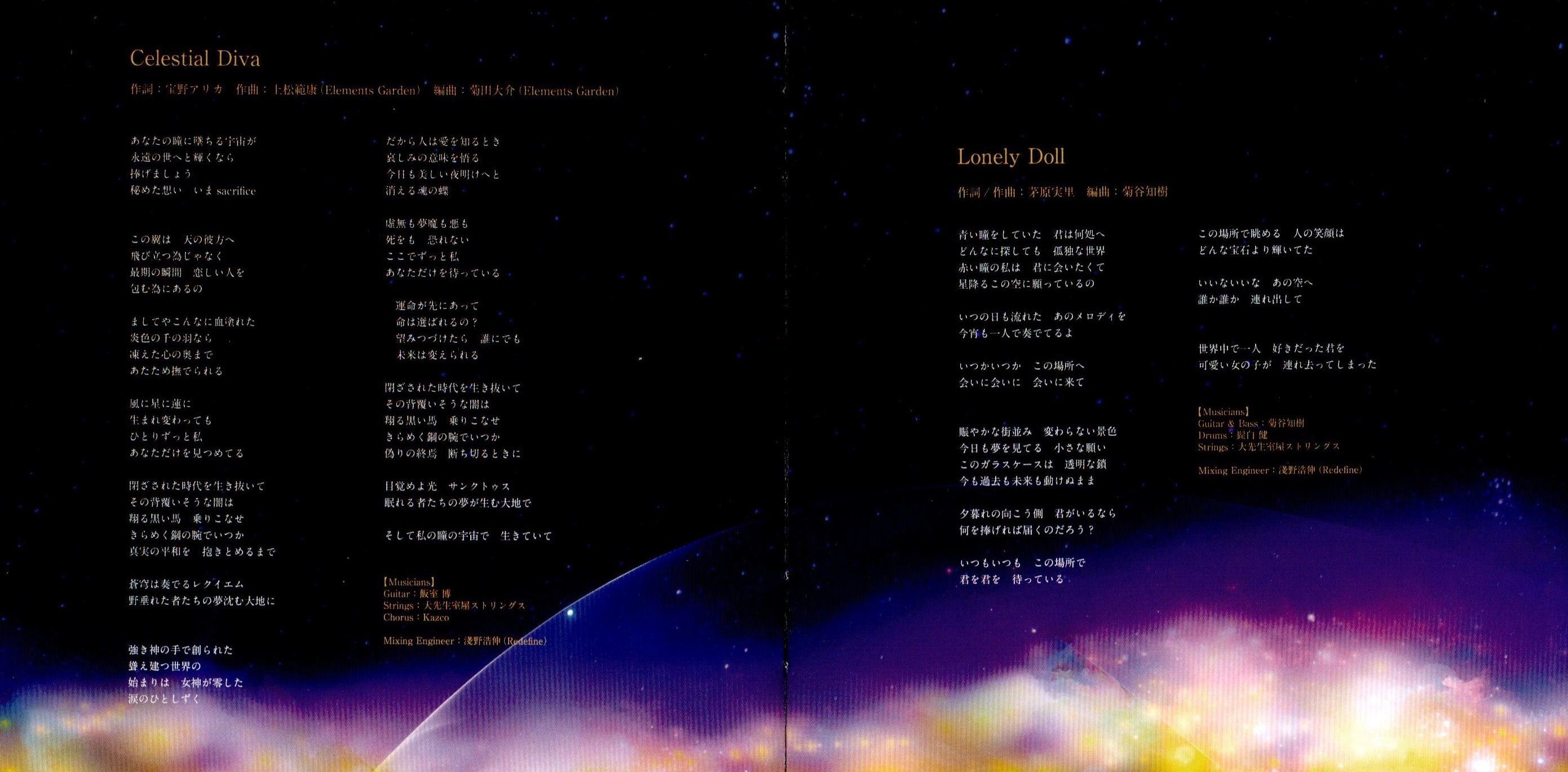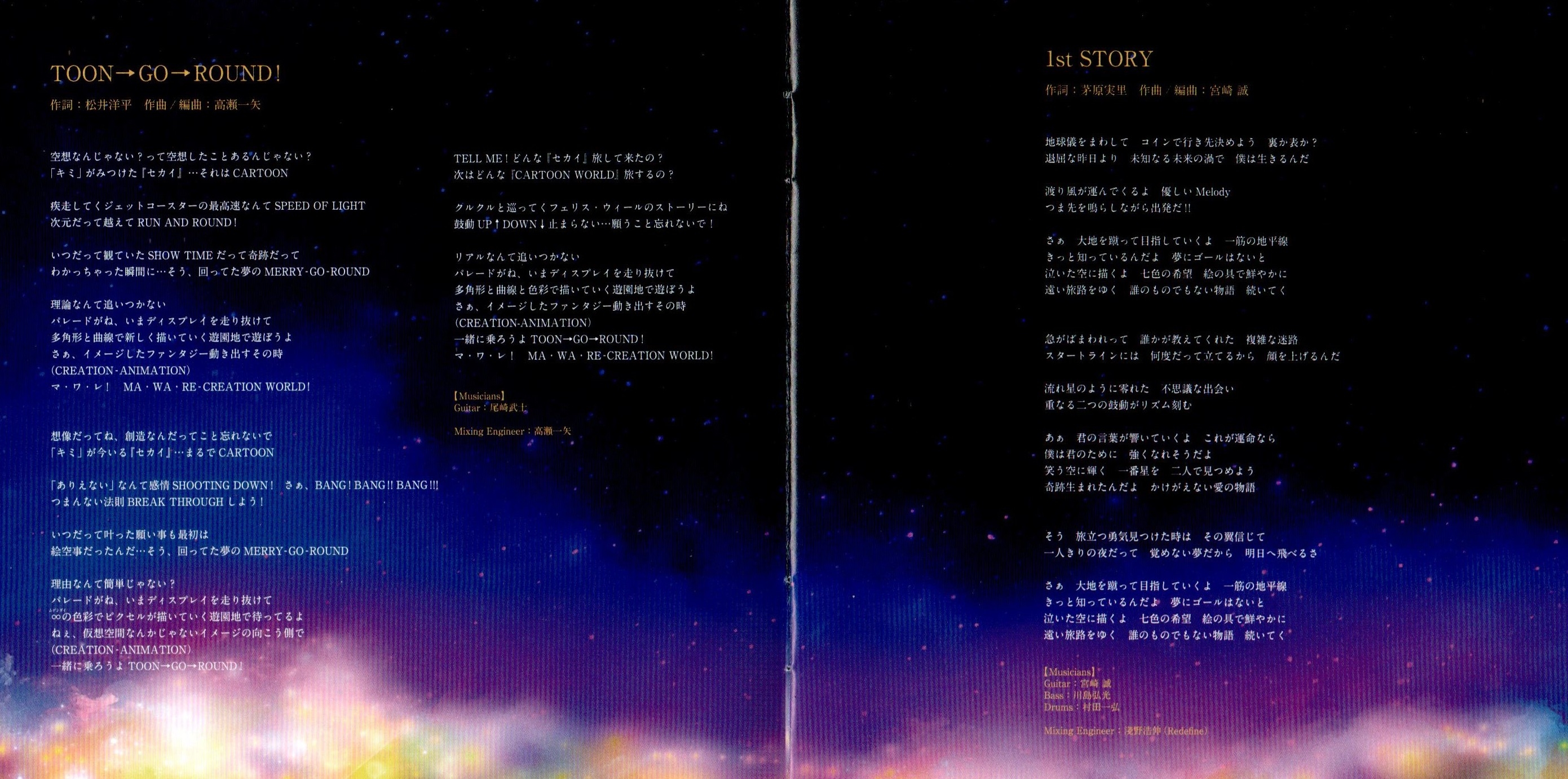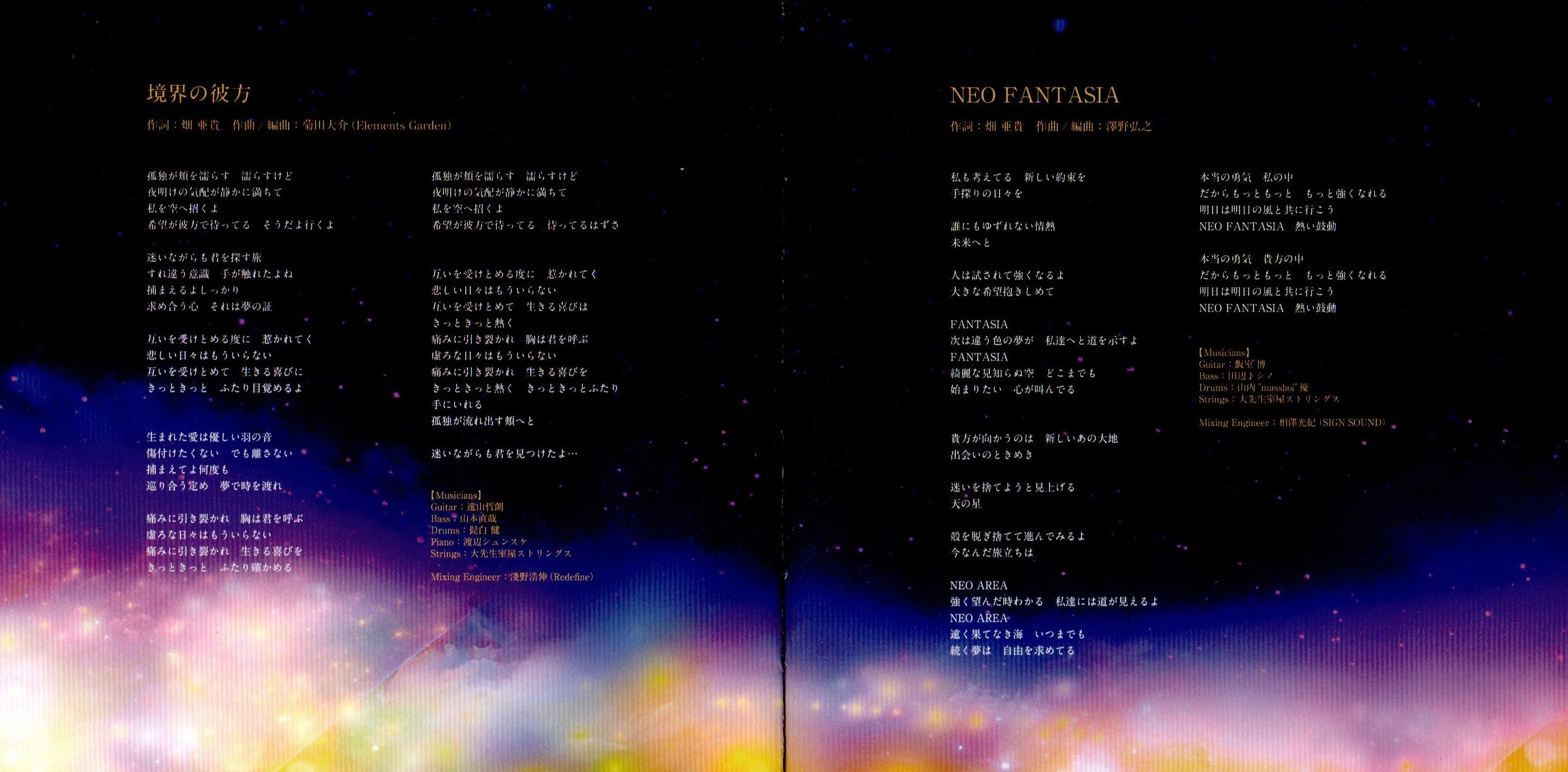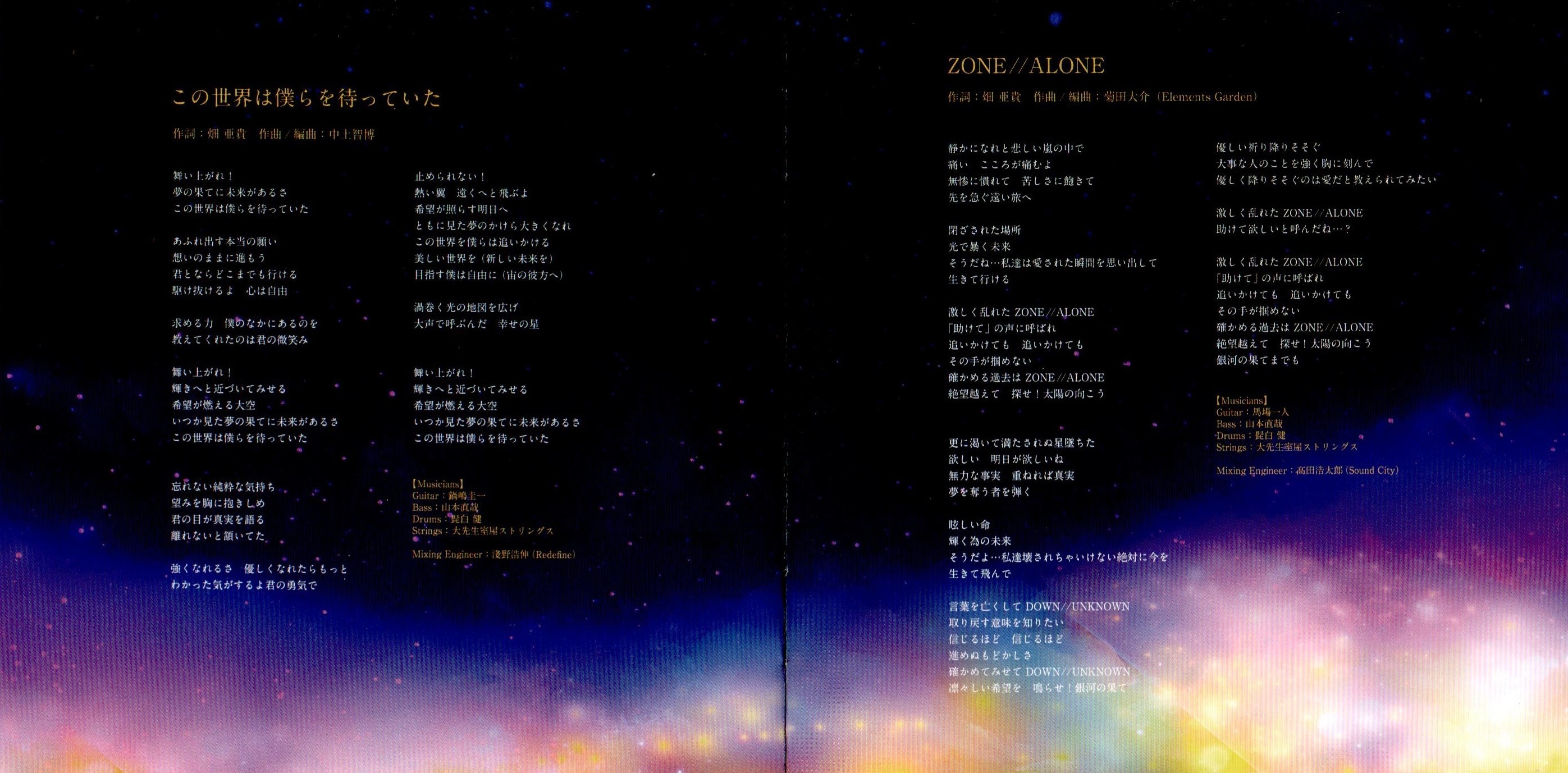 Recording Engineer: Mitsunori Aizawa (SIGN SOUND), Hironobu Asano (Redefine), Motoki Okuda (Redefine), Kazuya Takase, Kotaro Takada (Sound City), Katsumi Moriya (Redefine)