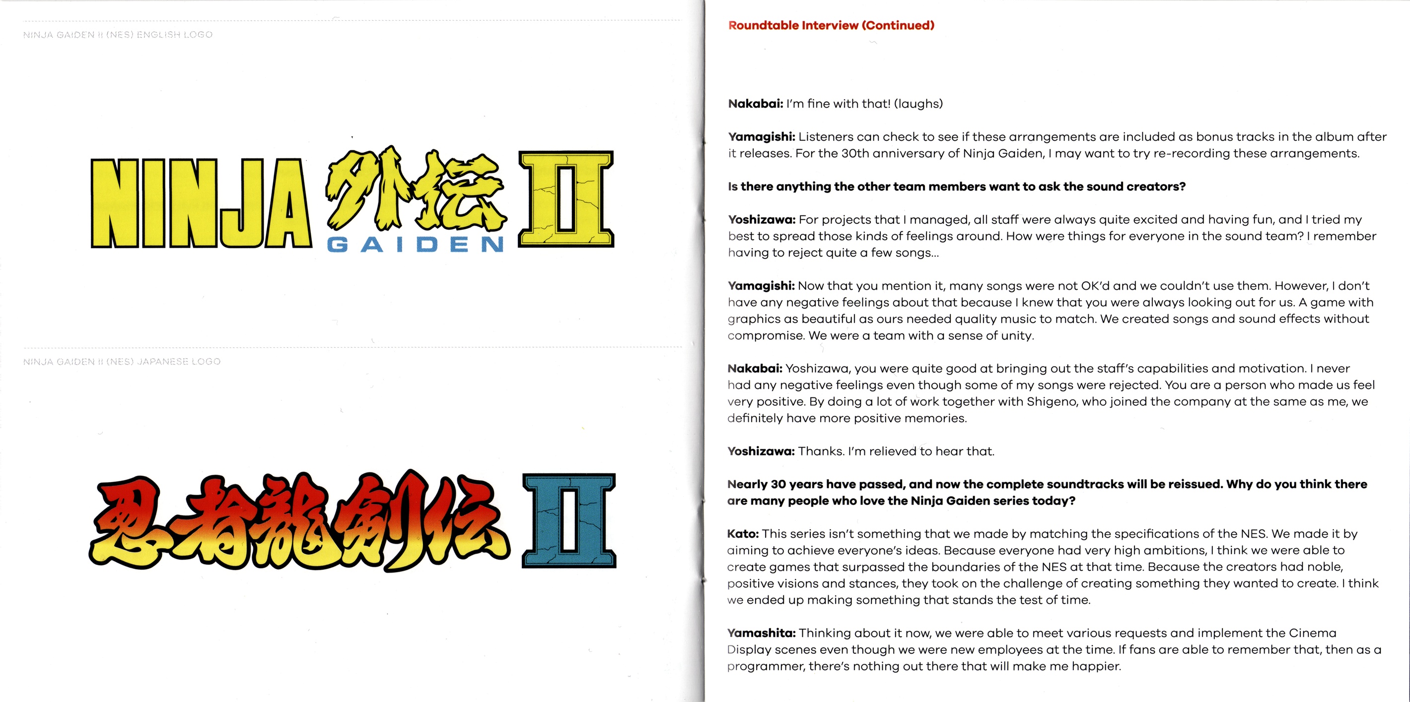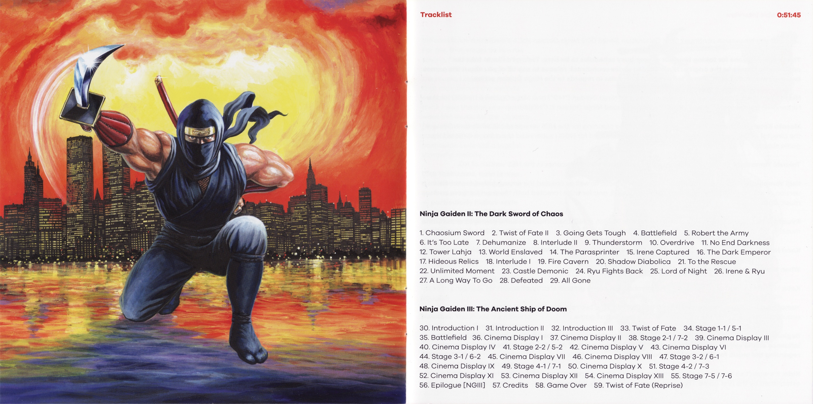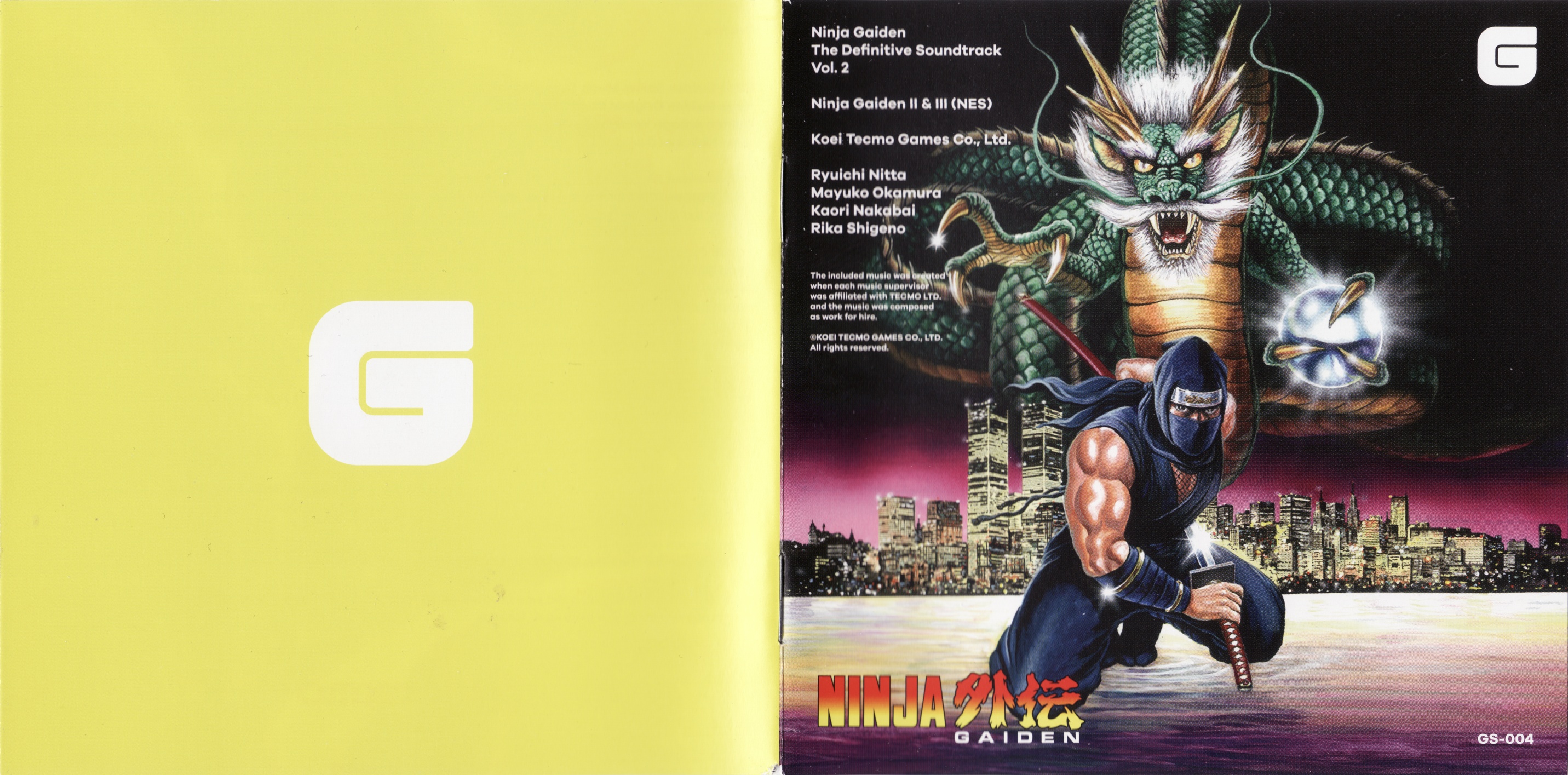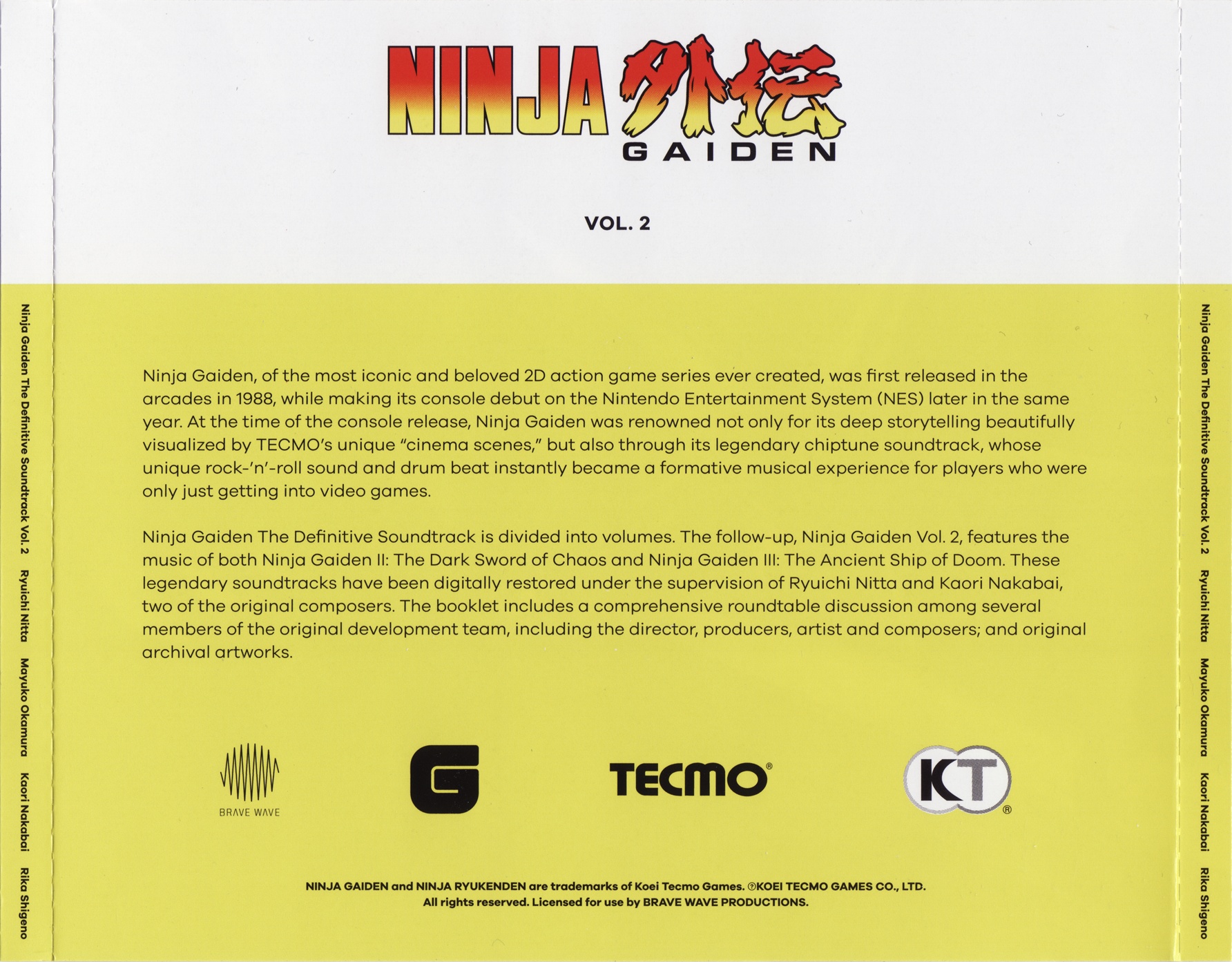 Ninja Gaiden: The Definitive Soundtrack is divided into volumes. The follow-up, Ninja Gaiden Vol. 2, features the music of both Ninja Gaiden II: The Dark Sword of Chaos and Ninja Gaiden III: The Ancient Ship of Doom. These legendary soundtracks have been digitally restored under the supervision of Ryuichi Nitta and Kaori Nakabai, two of the original composers. The booklet includes a comprehensive roundtable discussion among several members of the original development team, including the director, producers, artist and composers; an essay by game historian Ray Barnholt; and original archival artworks."