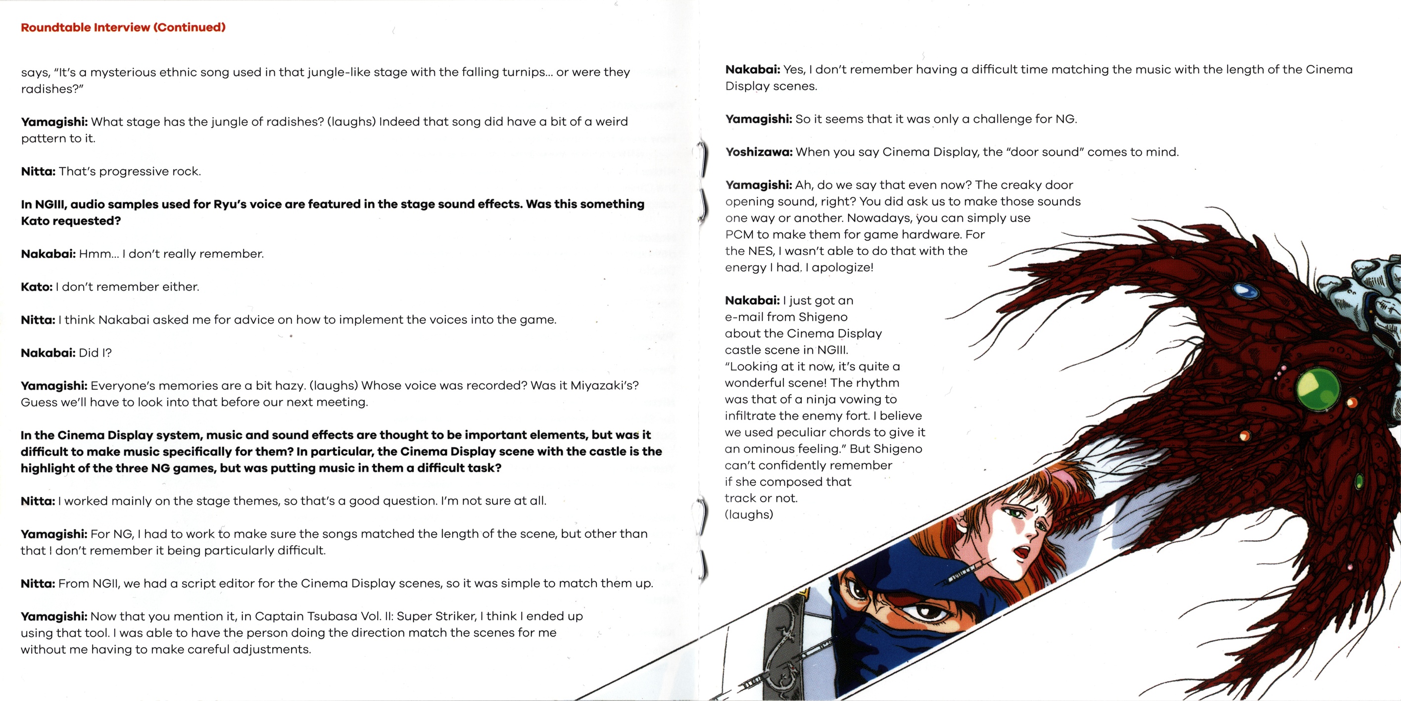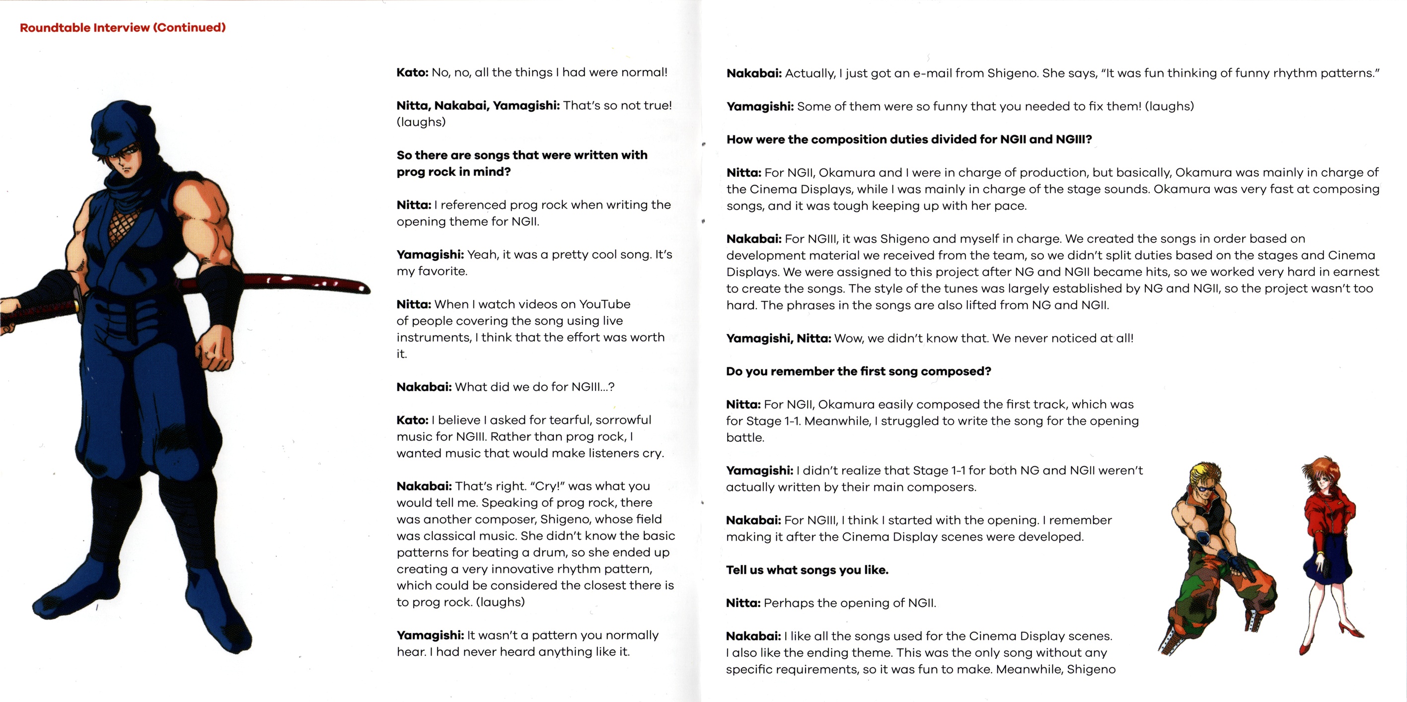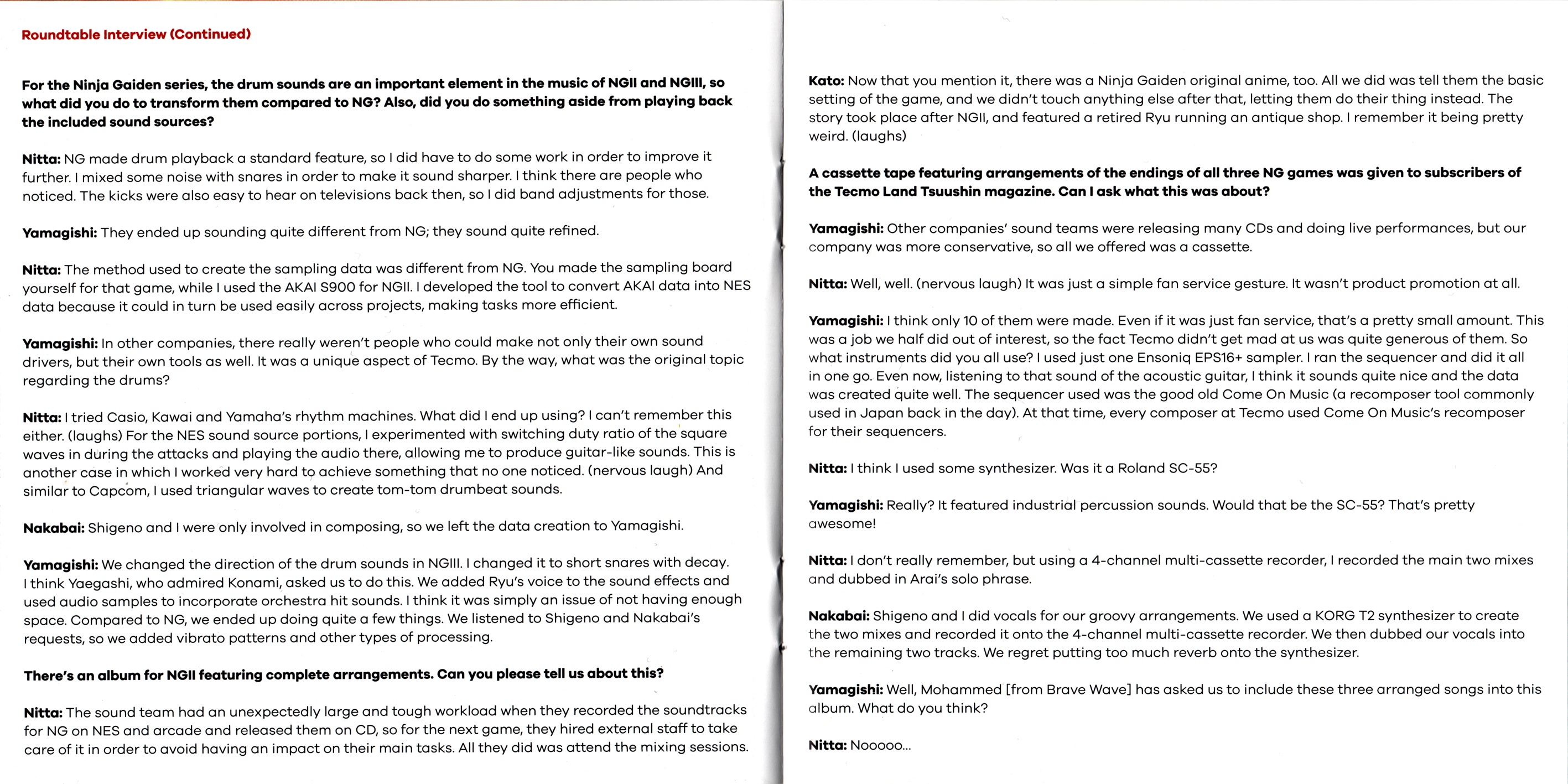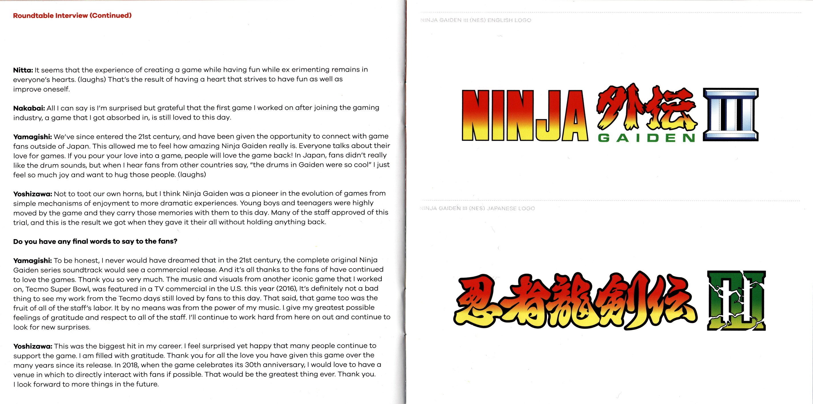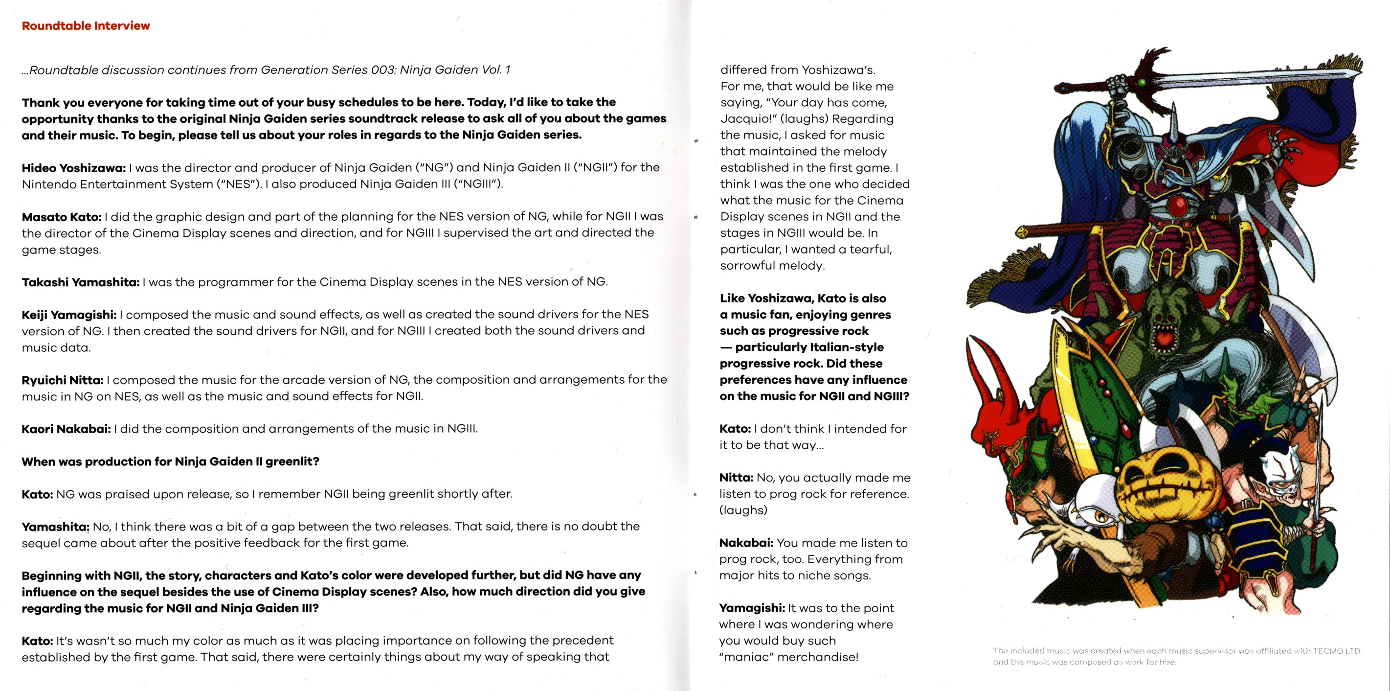 Ninja Gaiden: The Definitive Soundtrack is divided into volumes. The follow-up, Ninja Gaiden Vol. 2, features the music of both Ninja Gaiden II: The Dark Sword of Chaos and Ninja Gaiden III: The Ancient Ship of Doom. These legendary soundtracks have been digitally restored under the supervision of Ryuichi Nitta and Kaori Nakabai, two of the original composers. The booklet includes a comprehensive roundtable discussion among several members of the original development team, including the director, producers, artist and composers; an essay by game historian Ray Barnholt; and original archival artworks."