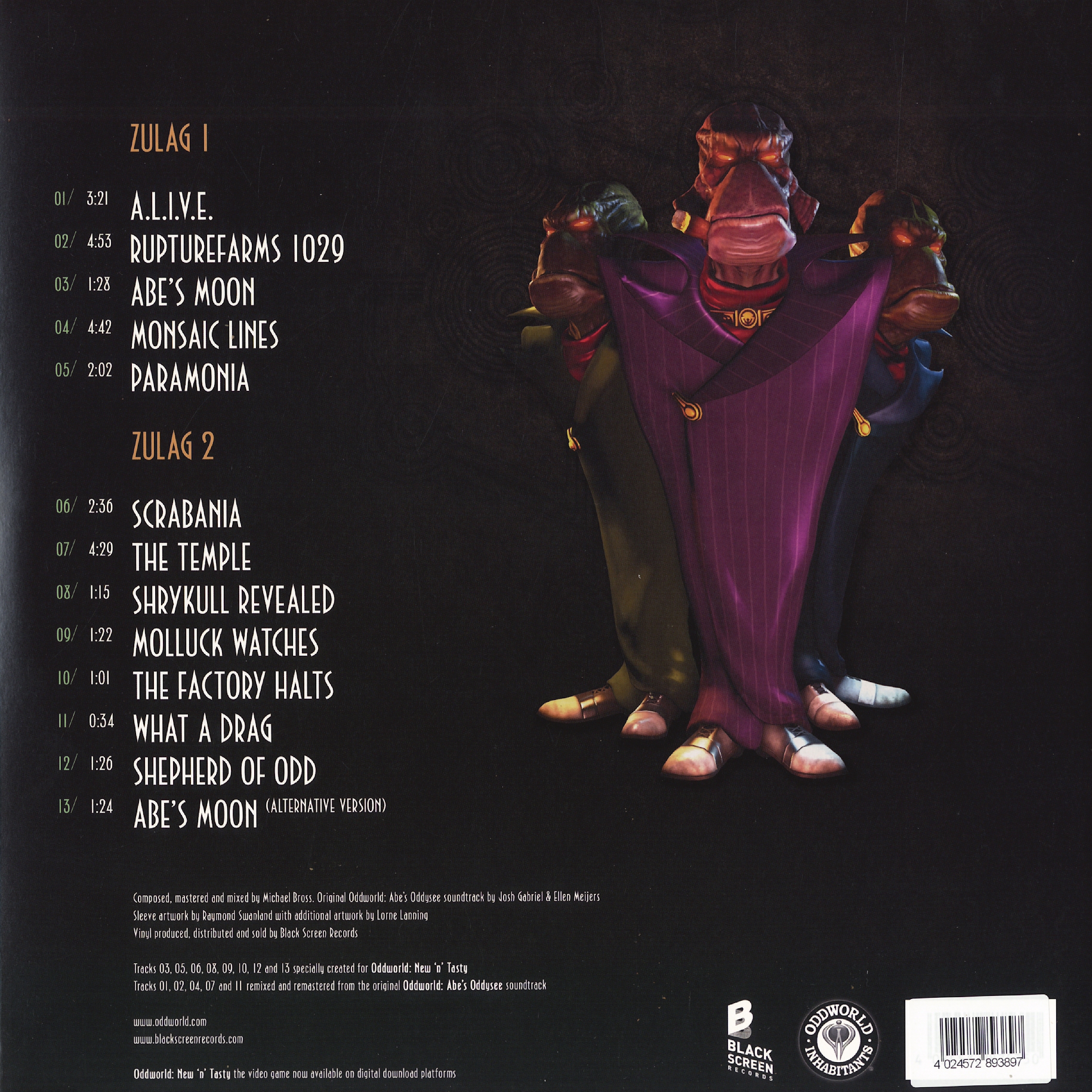 180g Vinyl in a Gatefold with a double-sided poster and a Steam card containing a download code for Oddworld: New 'n' Tasty on Windows, Mac and Linux; the soundtrack for Oddworld: New 'n' Tasty on MP3, and the soundtrack for the original Oddworld: Abe’s Oddysee on MP3.