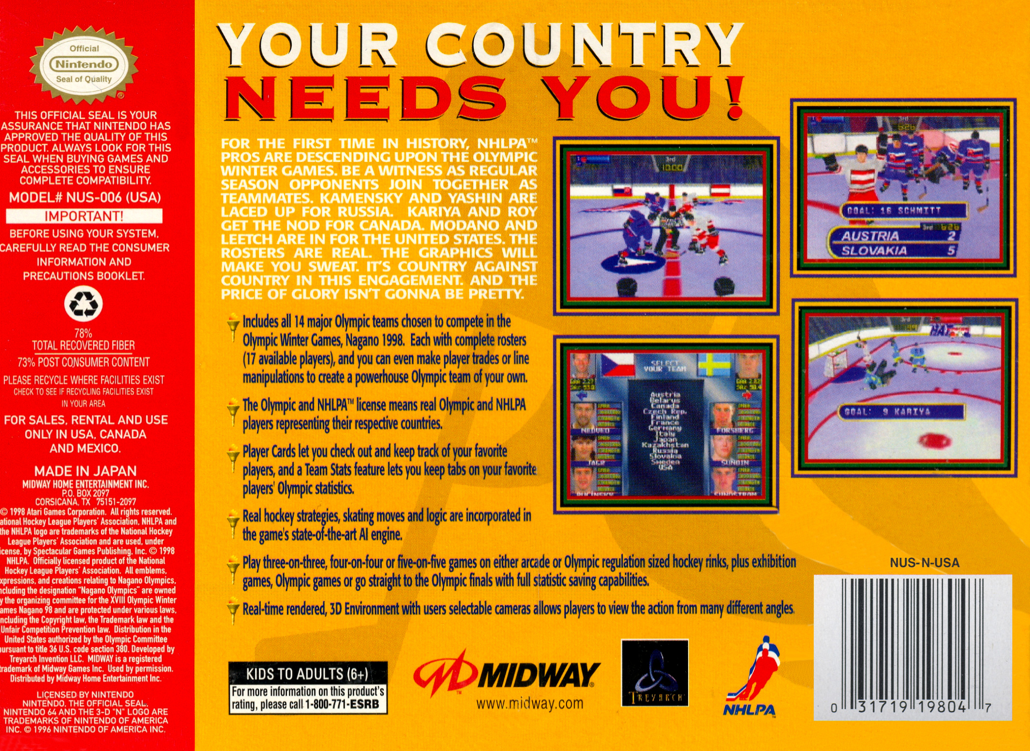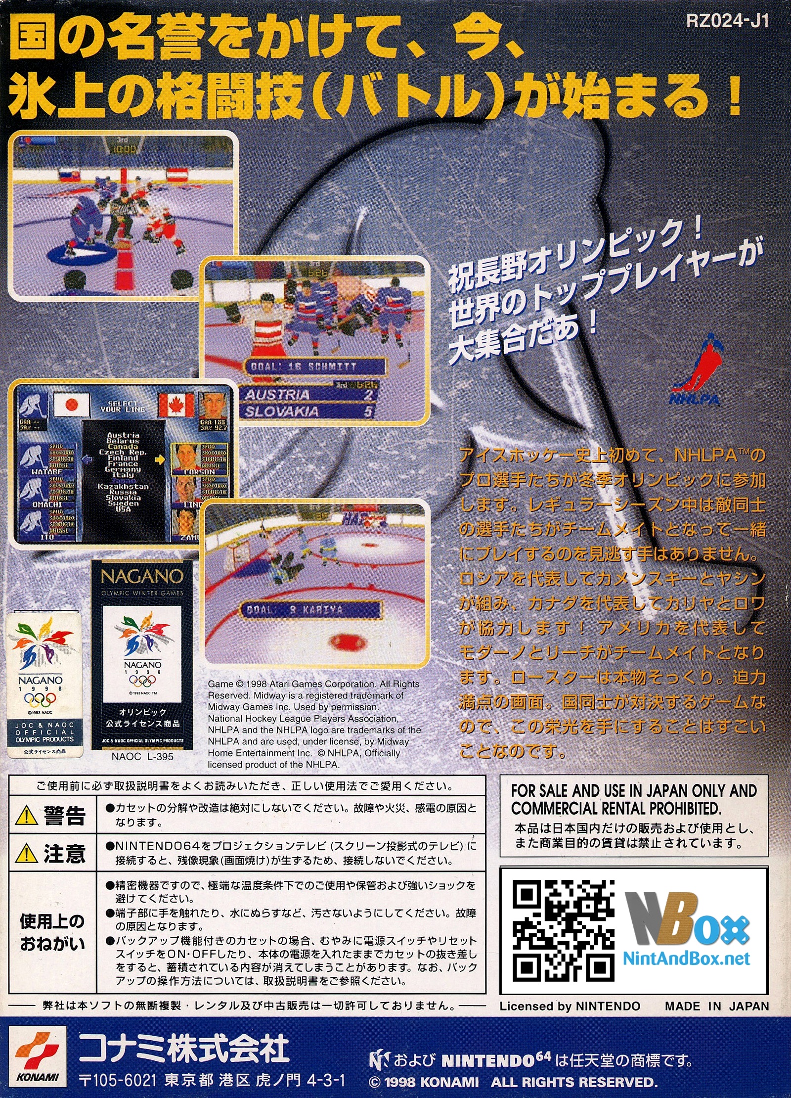 Olympic Hockey 98 is a hockey game with the official IOC license of the Olympic Winter Games 1998 in Nagano. However, this game is identical to Wayne Gretzky's 3D Hockey; the only changes are swapped teams (14 national teams instead of 26 NHL teams) and the implementation of the Olympic tournament. The license does not cover the athlete's names, i.e. all athletes employed outside the NHL are replaced by generic ones.