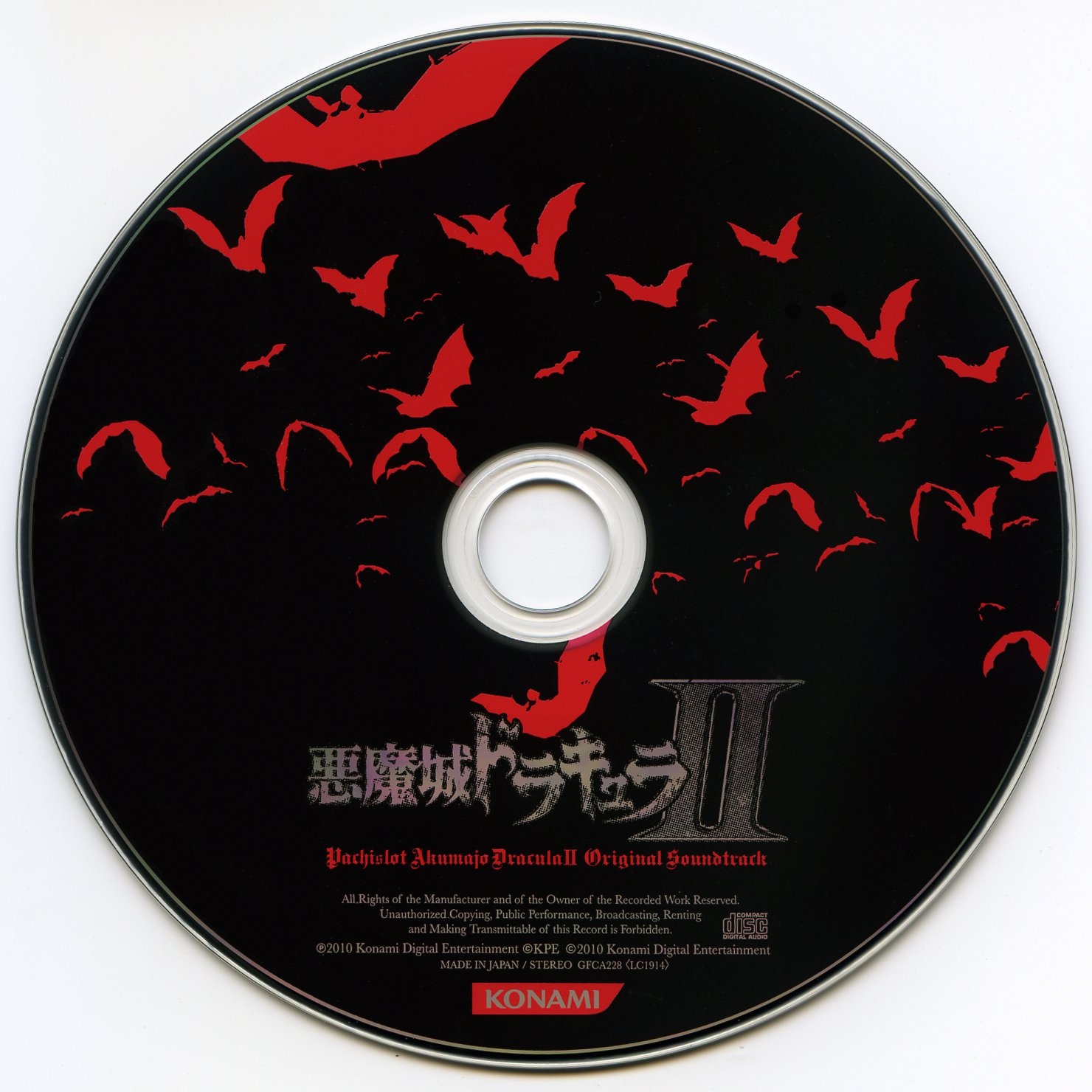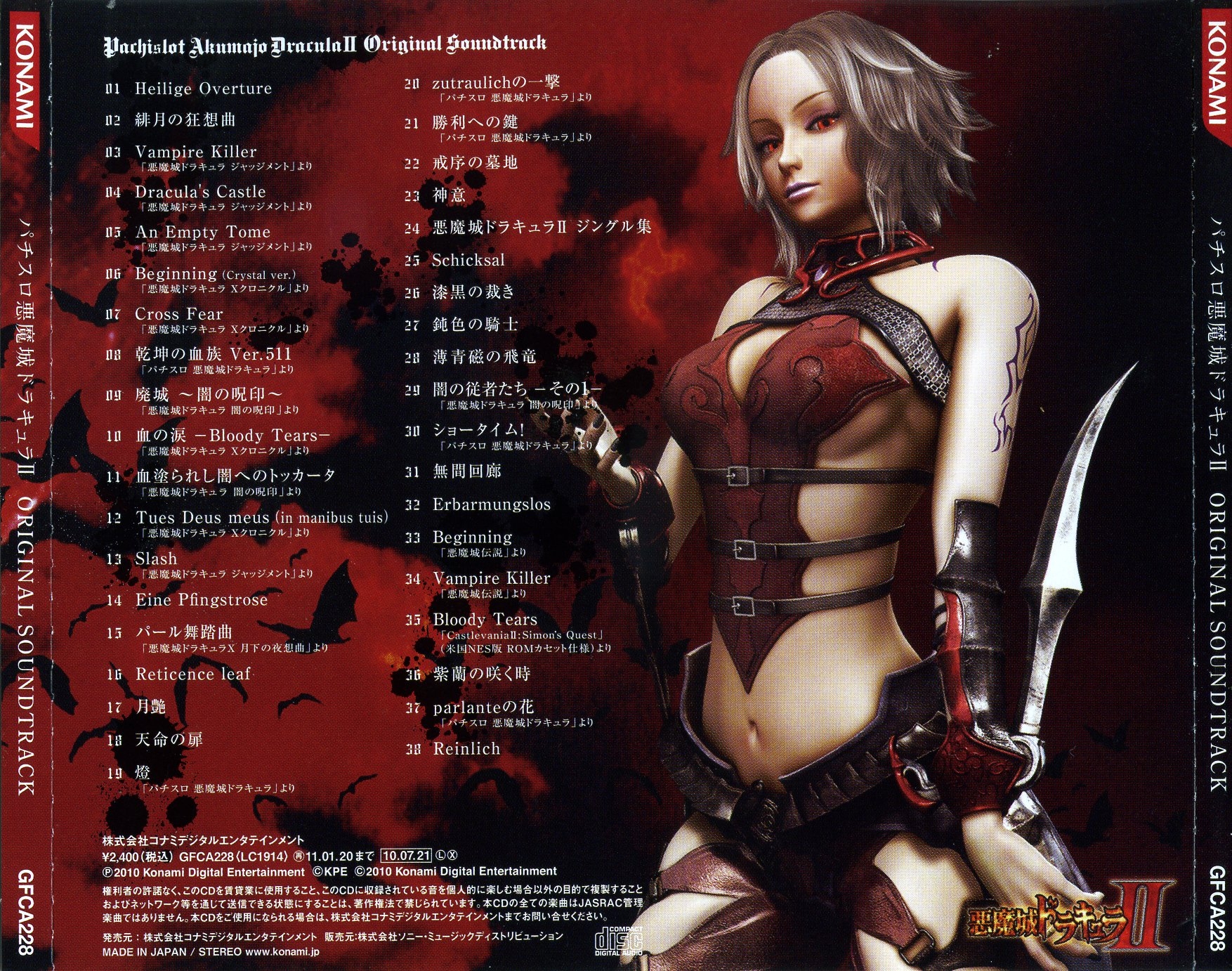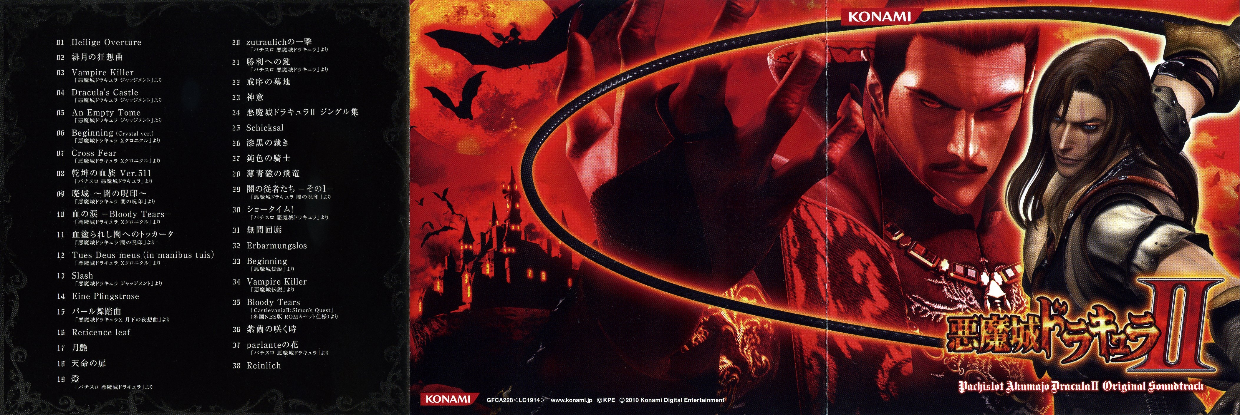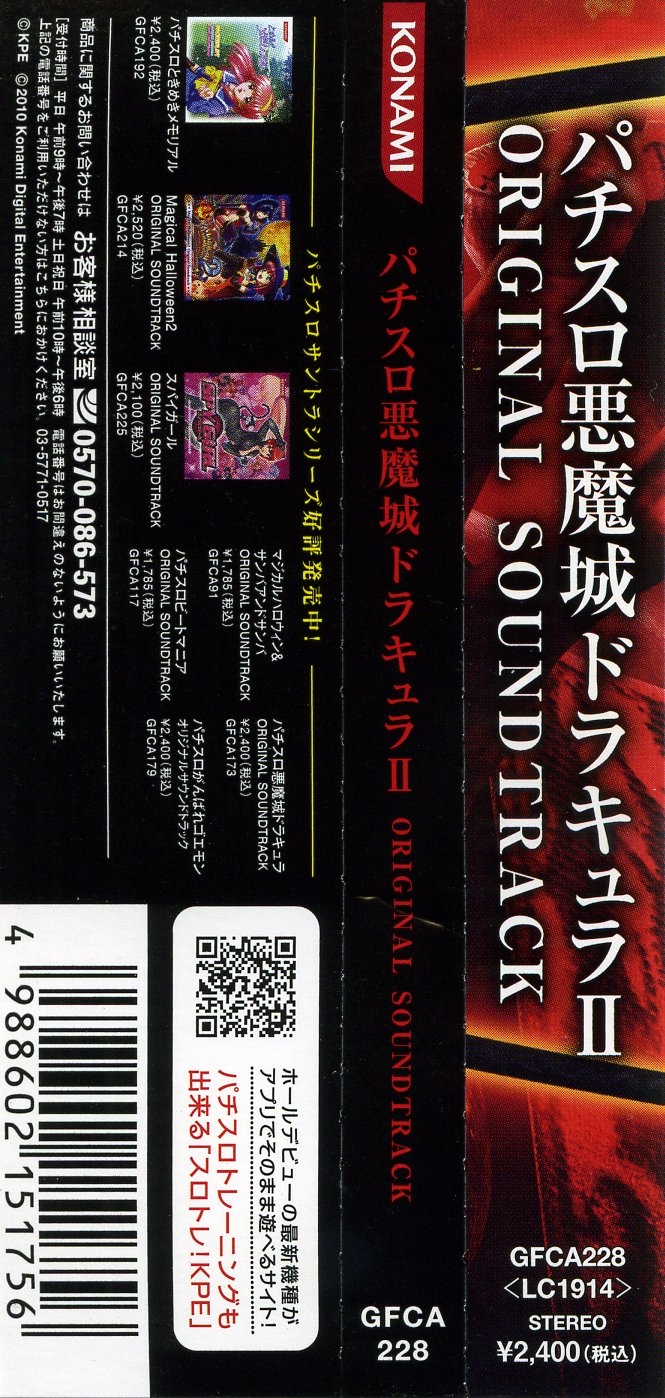 * Track 12's composer is credited as Yasuhiro Ichihashi in the booklet, but he's only credited as the arranger in both the Akumajo Dracula X Chronicle Original Soundtrack, where the song originates, and the Pachislot Akumajo Dracula Original Soundtrack, where it was also reprised. The song is an arrangement of "Dancing in Phantasmic Hell (Boss Theme BGM)" from Castlevania: Rondo of Blood.