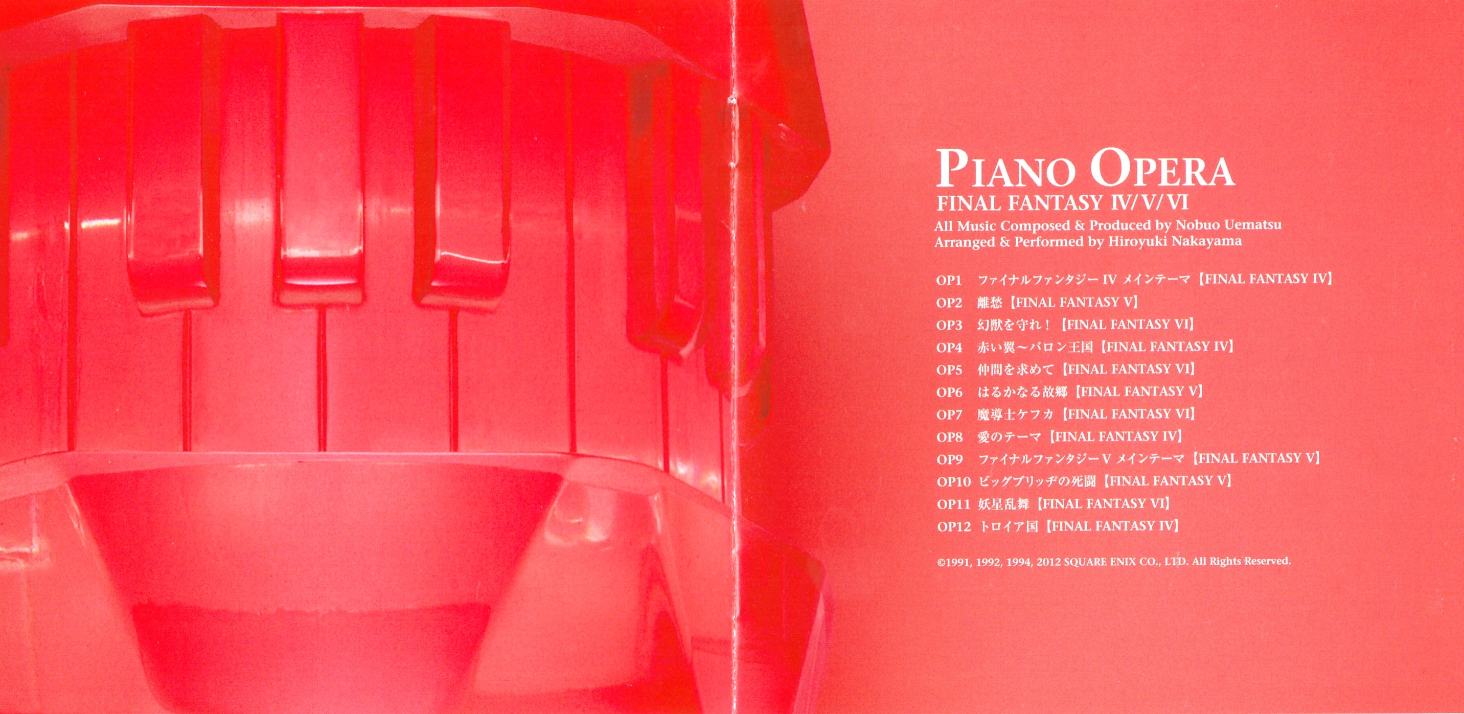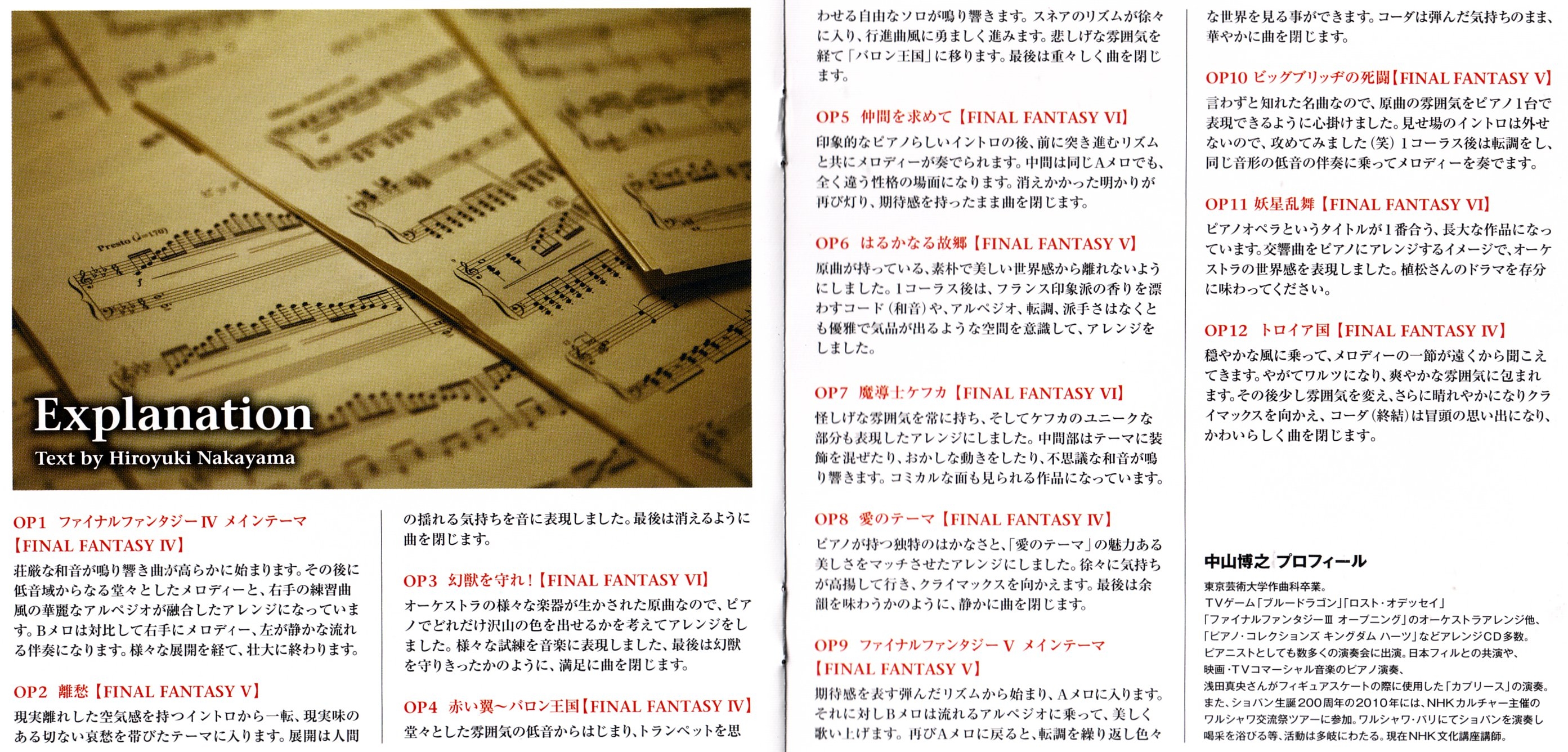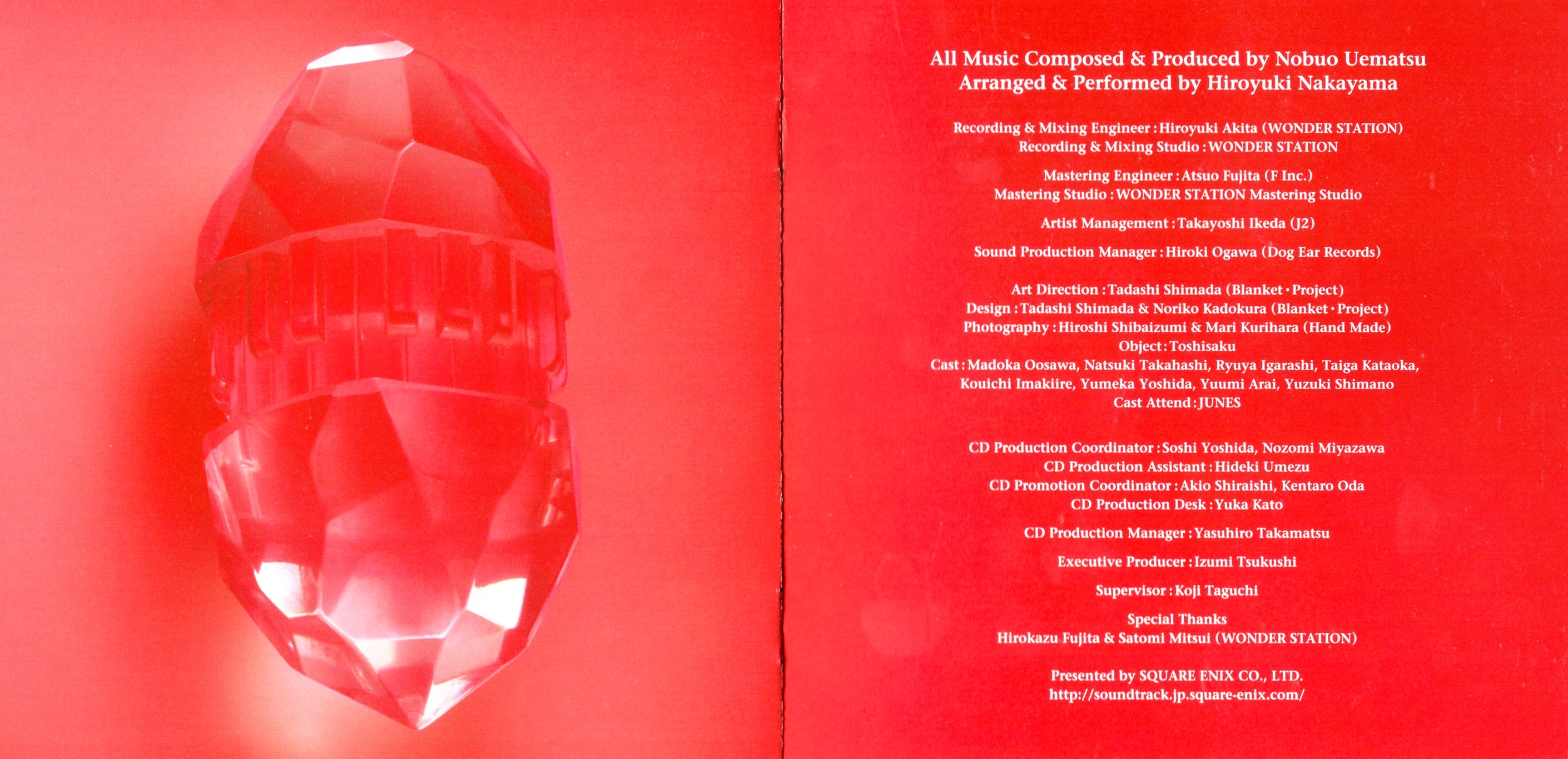 Liner Notes: Nobuo Uematsu (pg. 4), Hiroyuki Nakayama (pg. 7, 8)