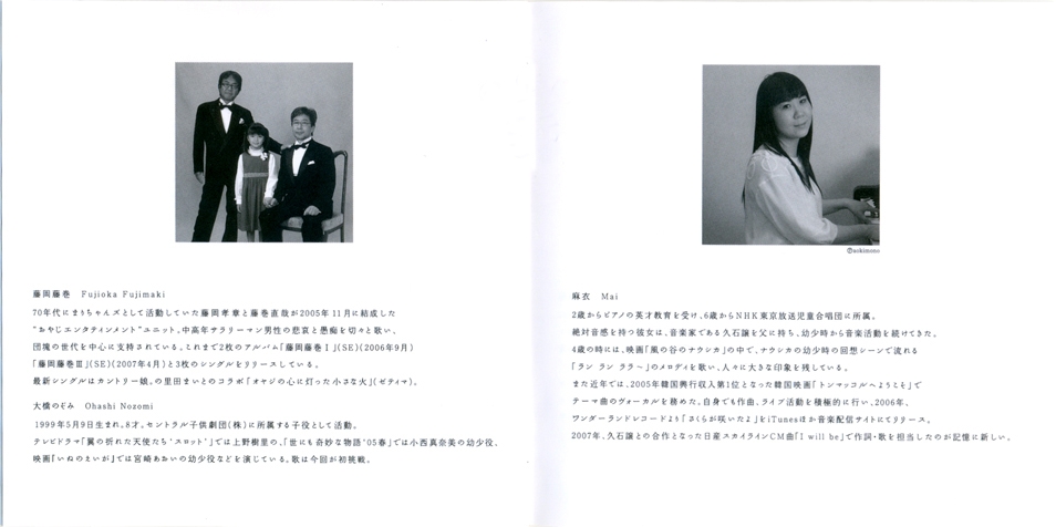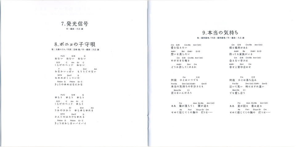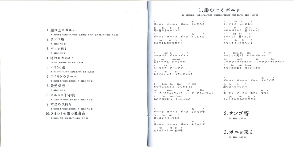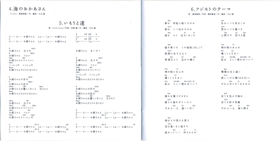 Vocals: Fujioka Fujimaki & Nozomi Ohashi / Lyrics: Katsuya Kondo / Supplementary Lyrics: Hayao Miyazaki / Composition and Arrangement: Joe Hisaishi