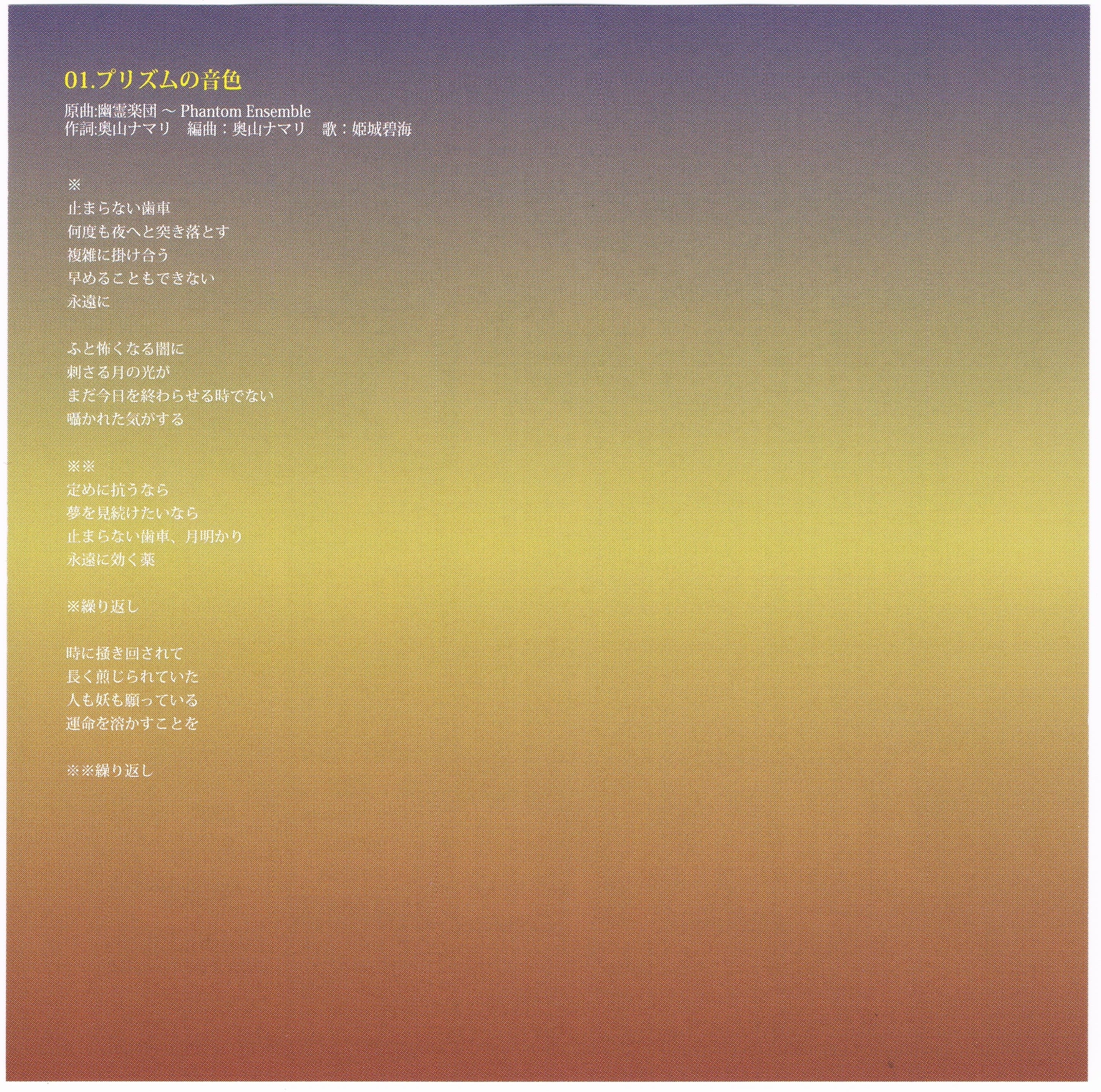 An incorrect lyrics card was included with this disc. It is possible to find the correct lyric in the booklet of the albums "Yoi no Hana -YHEX-0003-" and "Yumeiro Prelude -SJFT-0045-"