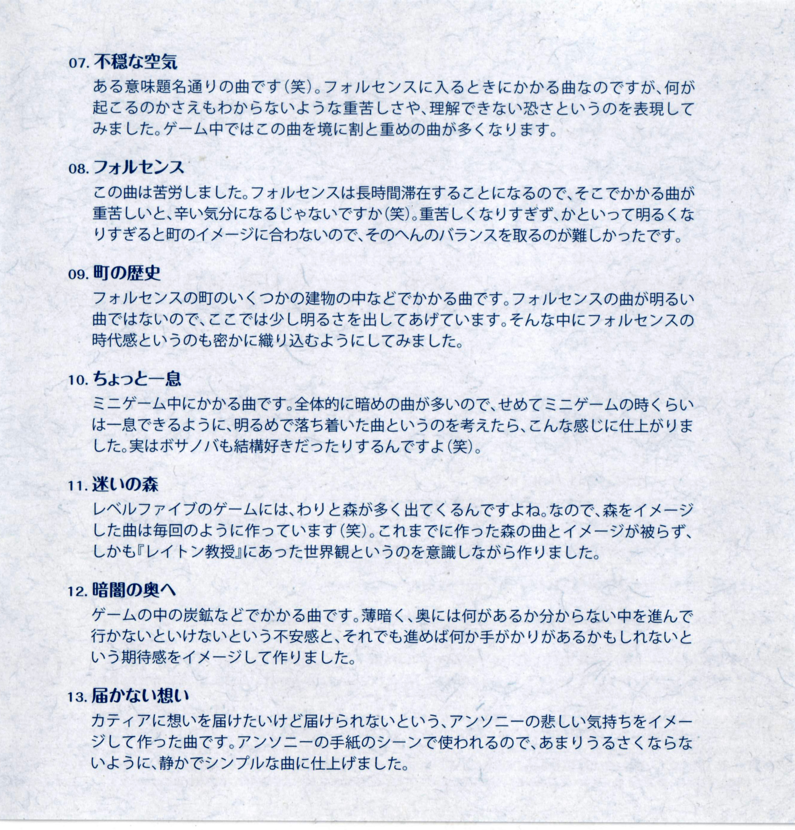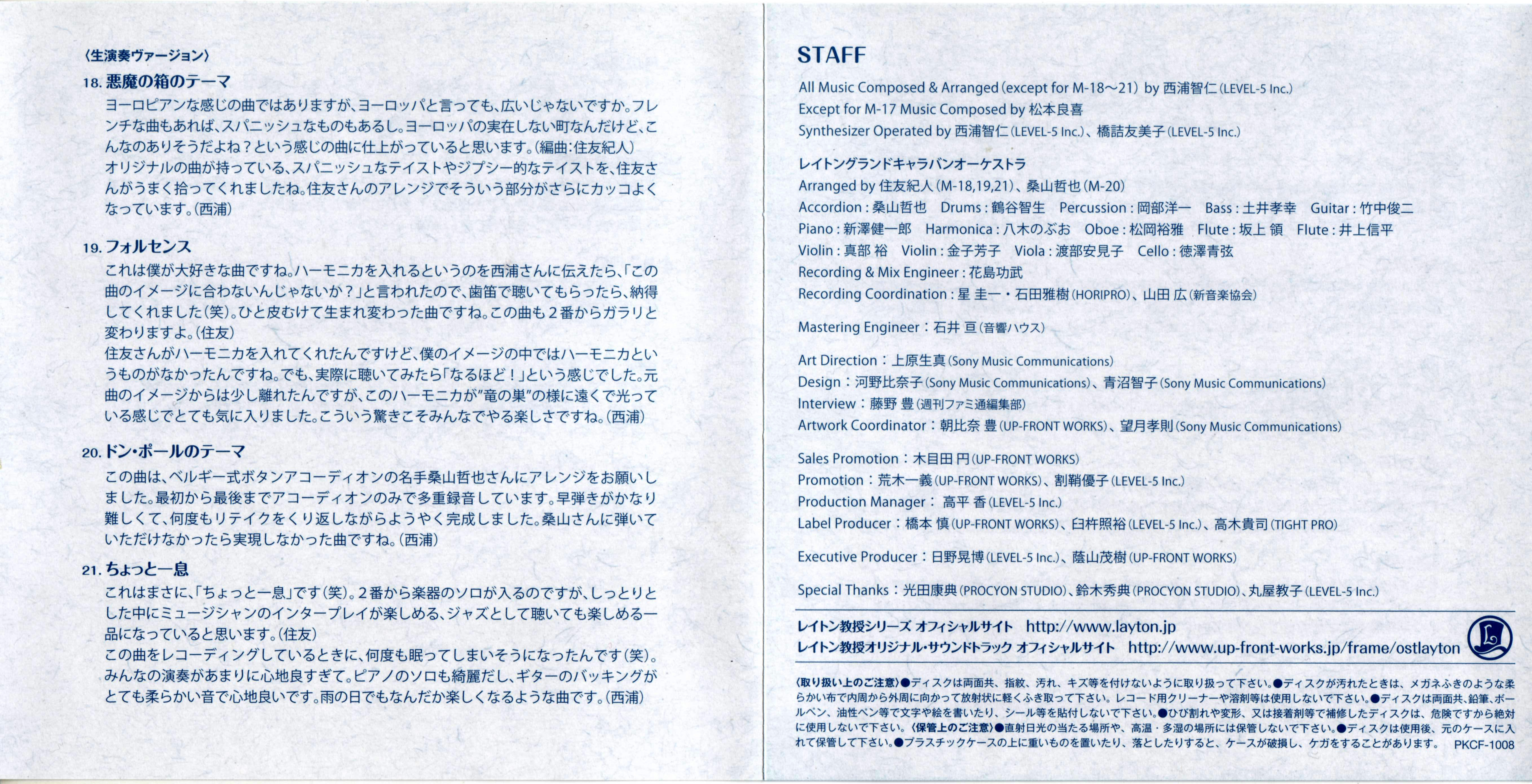 All Music Composed & Arranged (except for M-18~21) by Tomohito Nishiura (LEVEL-5 Inc.)