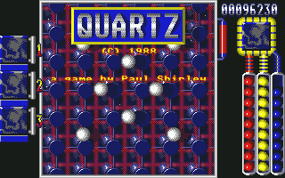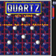 Quartz is a shoot 'em up with a variety of sections. The first section (and every odd-numbered one) is viewed from above and scrolls in every direction. As well as standard attack waves, there are large red/blue/yellow balls which split on impact a lá Asteroids, and once the smallest ones are destroyed they release tokens. Once you have collected 9 of each, you can choose a power-up form a range including various weapons, restart points (which effectively gives infinite continues when used with an emulator's 'snapshot' feature) and repairs to the ship. Destroying the whole of standard waves gives combined tokens which add one to each of the three colours.
