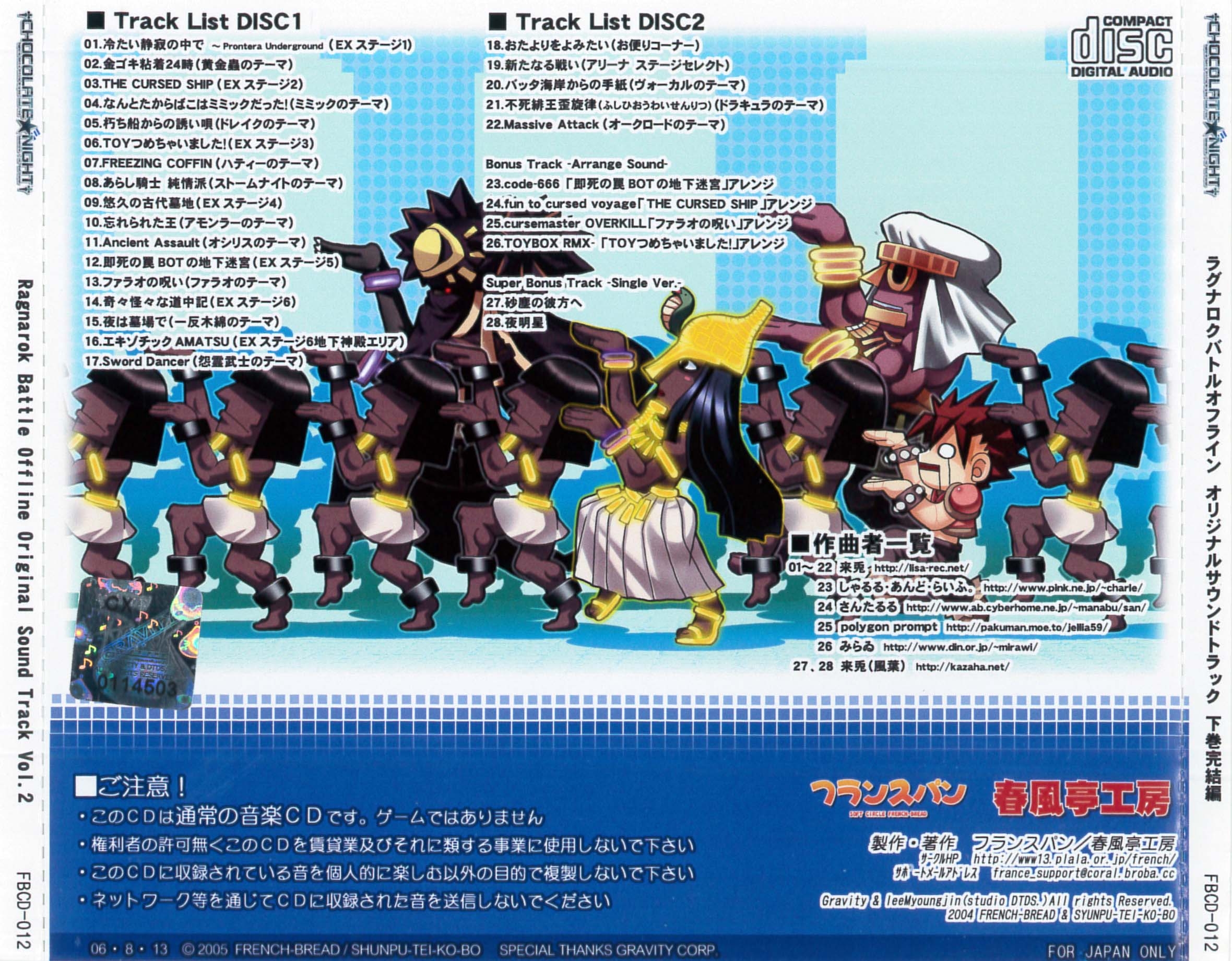 Tracks 10 and 11 on disc 2 are from the OP/ED single (FBCD-011), composed, arranged and performed by KAZAHA.