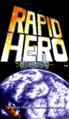 Rapid Hero is a futuristic vertically scrolling top-down shooter for one or two players simultaneously using the same screen. The player controls a ship that can be freely moved around the screen. There are eight stages in total, both set in space as well as on a planet. The ship has an unlimited amount of bullets and the weapon fires in bursts, so tapping is needed. The game strings together large waves of enemies with many boss fights in typical bullet hell style. To progress it is often required to upgrade the weapon with power-ups that stack. They are left behind by destroyed enemies. Next to the regular upgrades (P icons), additional weapon upgrades include lasers (L icons), cluster bombs (M icons) and homing missiles (H). A credit consists of three lives and when the ship is destroyed after one hit. When killed a small number of power-ups is released and these can be picked up again to regain part of the upgrades.