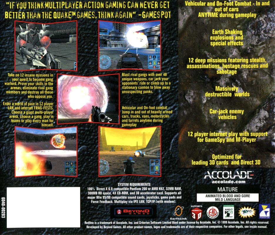 Redline is a 1999 post-apocalyptic combination first-person shooter/car combat game for Windows. It was developed by Beyond Games and published by Accolade. In Europe, the game is known as Redline - Gang Warfare: 2066. It is a spiritual successor to the Atari Lynx video game BattleWheels.